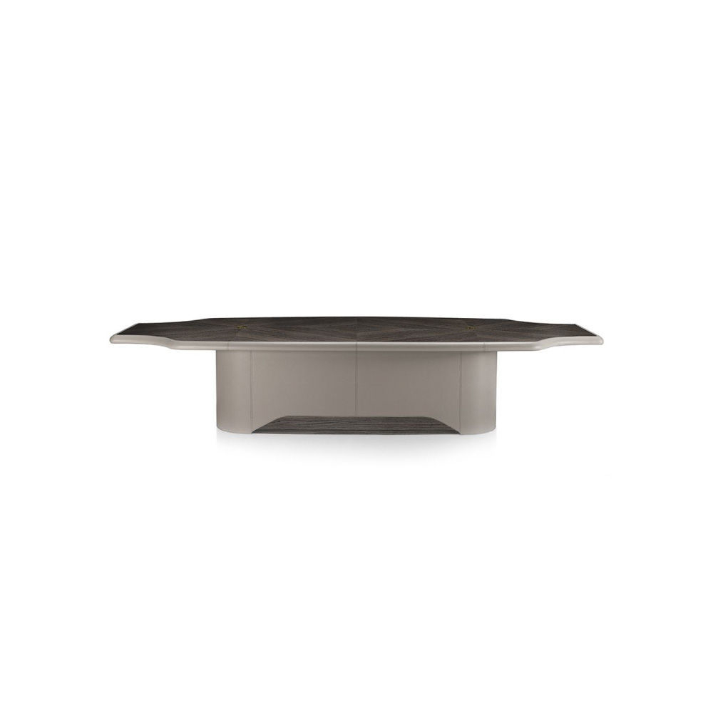 Top in Malindi veneer, semiglossy finish, with edges in leather art. Skin col. Sand and holes for cables. Base in leather art. Skin col. Sand, tone on tone stitchings, with veneer inserts.