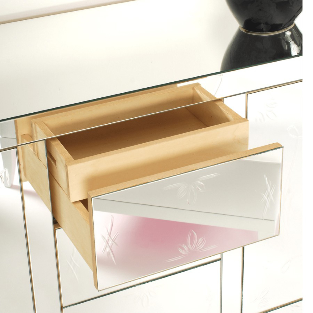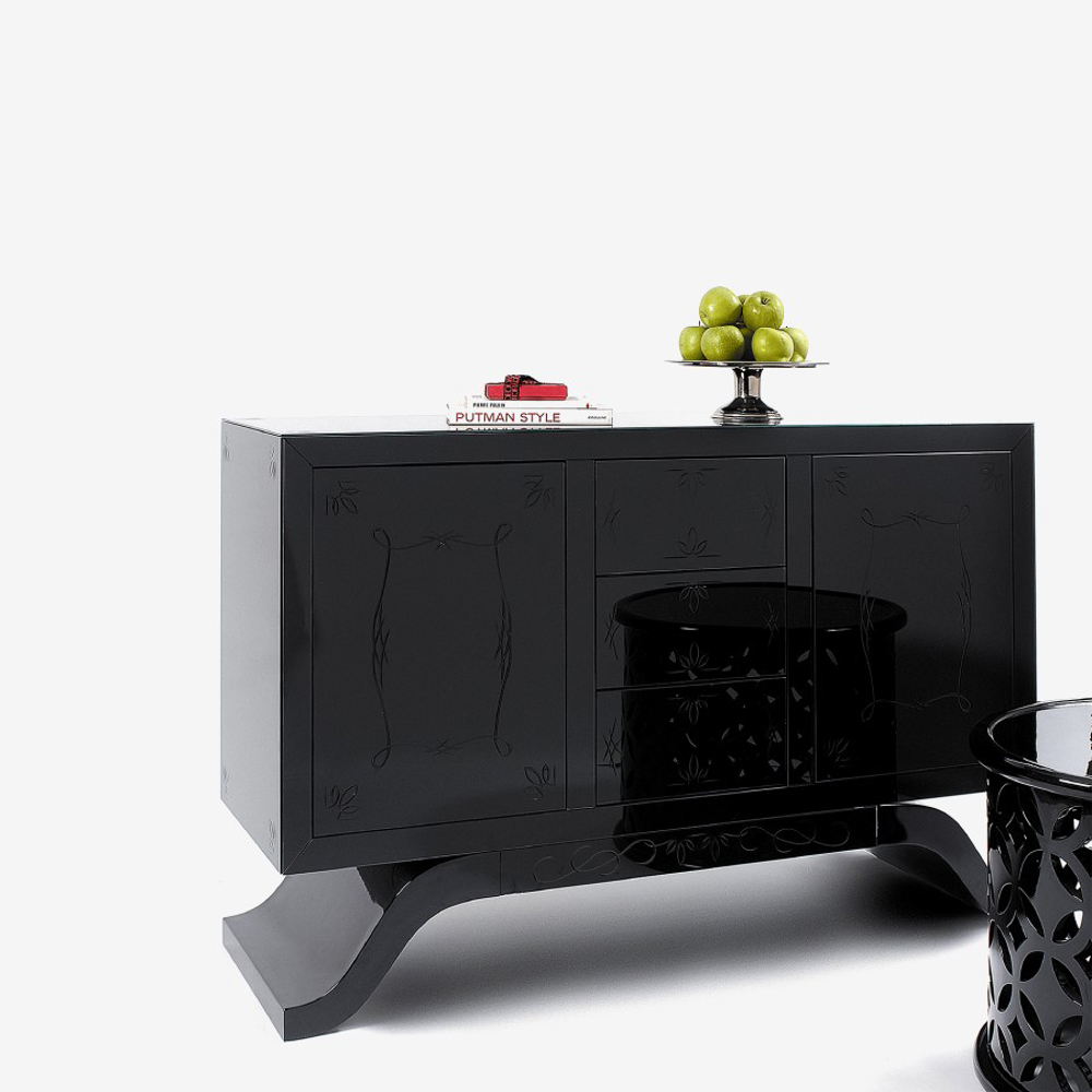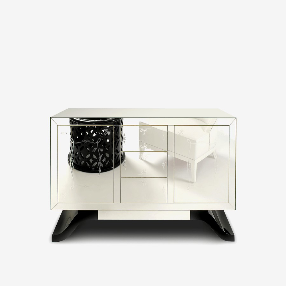 This sideboard’s structure is made from poplar wood, lined by a black lacquered glass or clear mirror. The glass contains polished ornaments. It has two doors and three drawers. Its base is made in lacquered wood and finished in high gloss black. Contains two removable shelves.