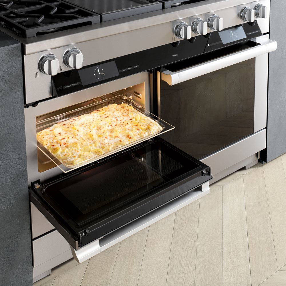 Featuring a unique 3-door concept, Miele's 48" Range includes a fully functional M Touch Speed Oven, M Touch Convection Oven, and a Push-to-Open Warming Drawer.