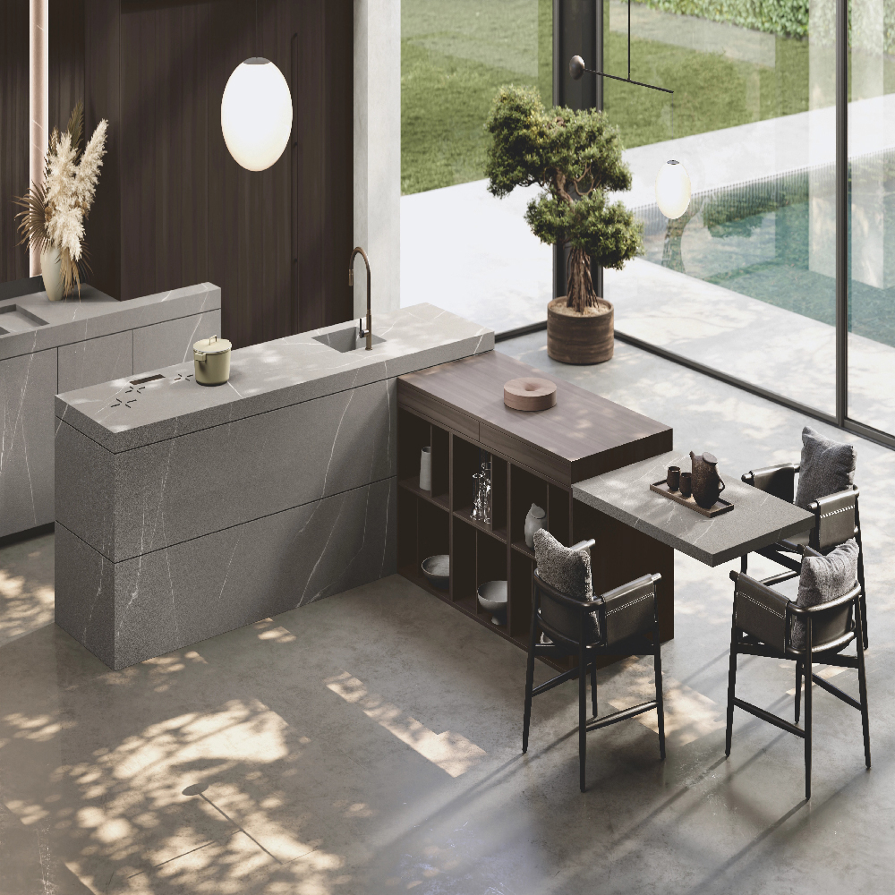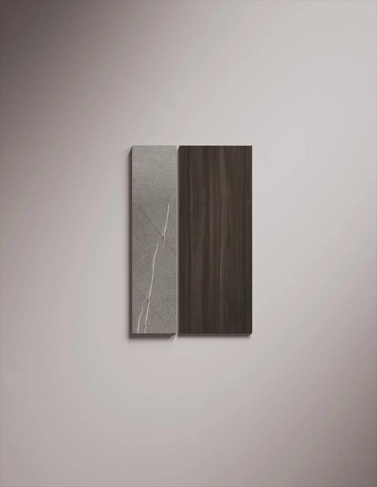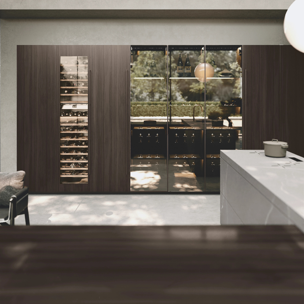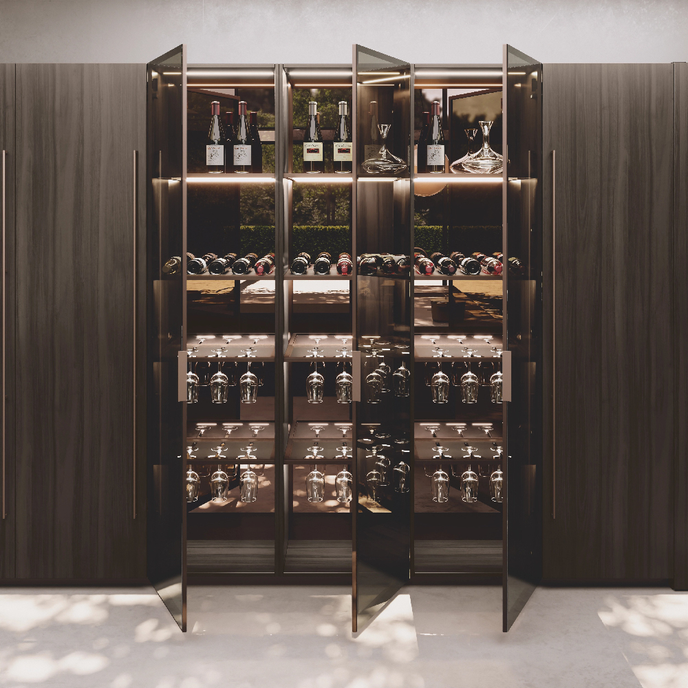 Petra glass units with bronzo scuro frame and Stopsol glass, structure in special wood veneer Noce Canaletto Grigio, back in bronzo mirror and Nova shelves (glass holder, bottle holder and smoked glass), with integrated LED lighting , in bronzo scuro finish.