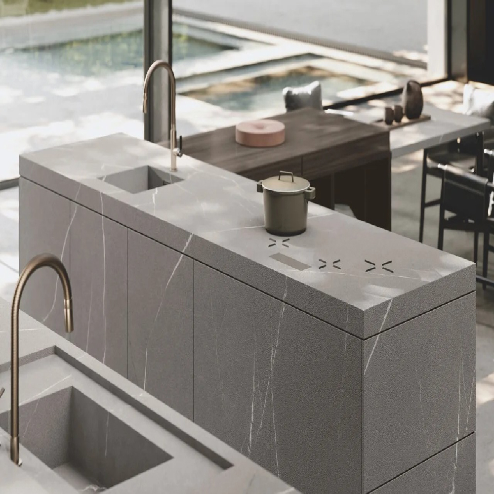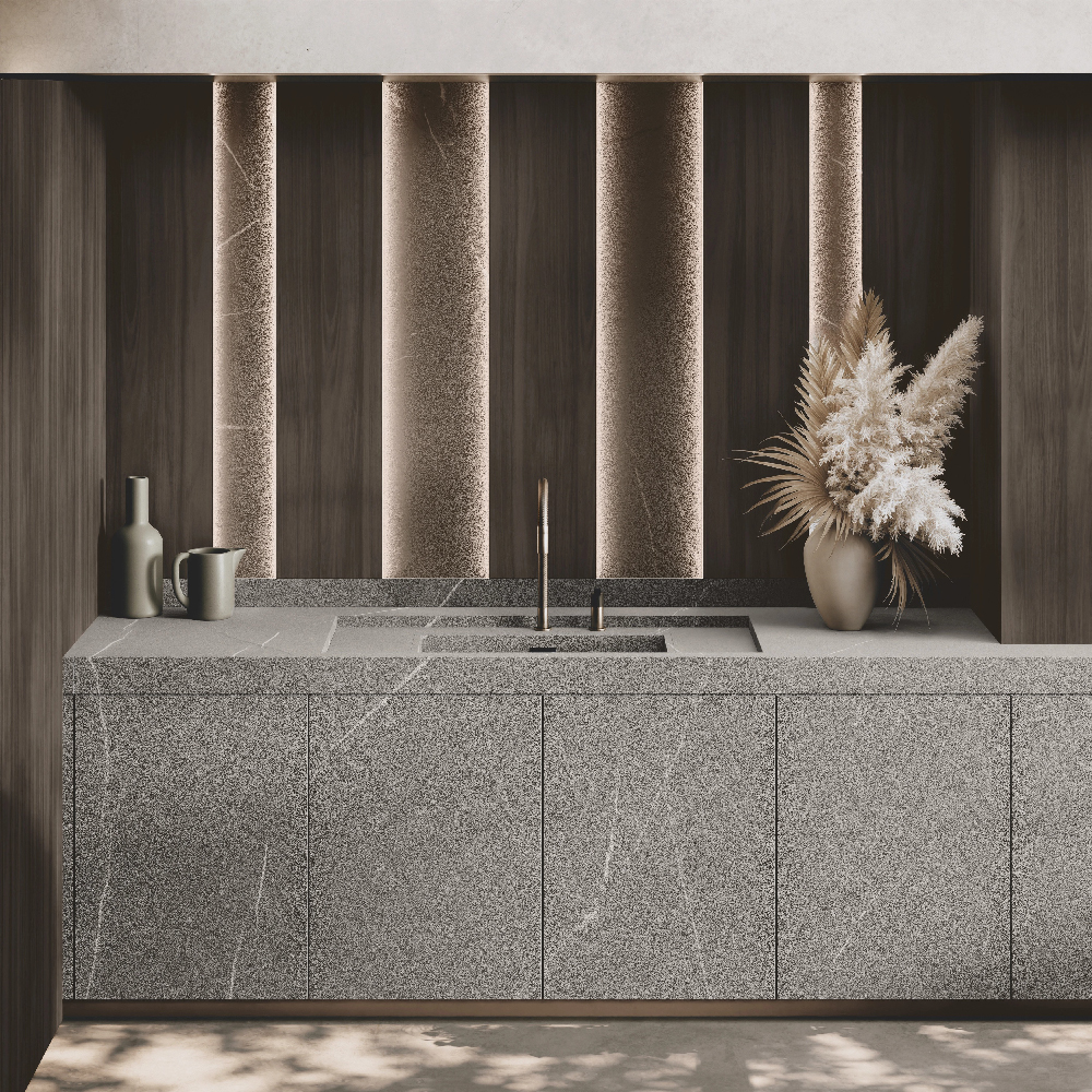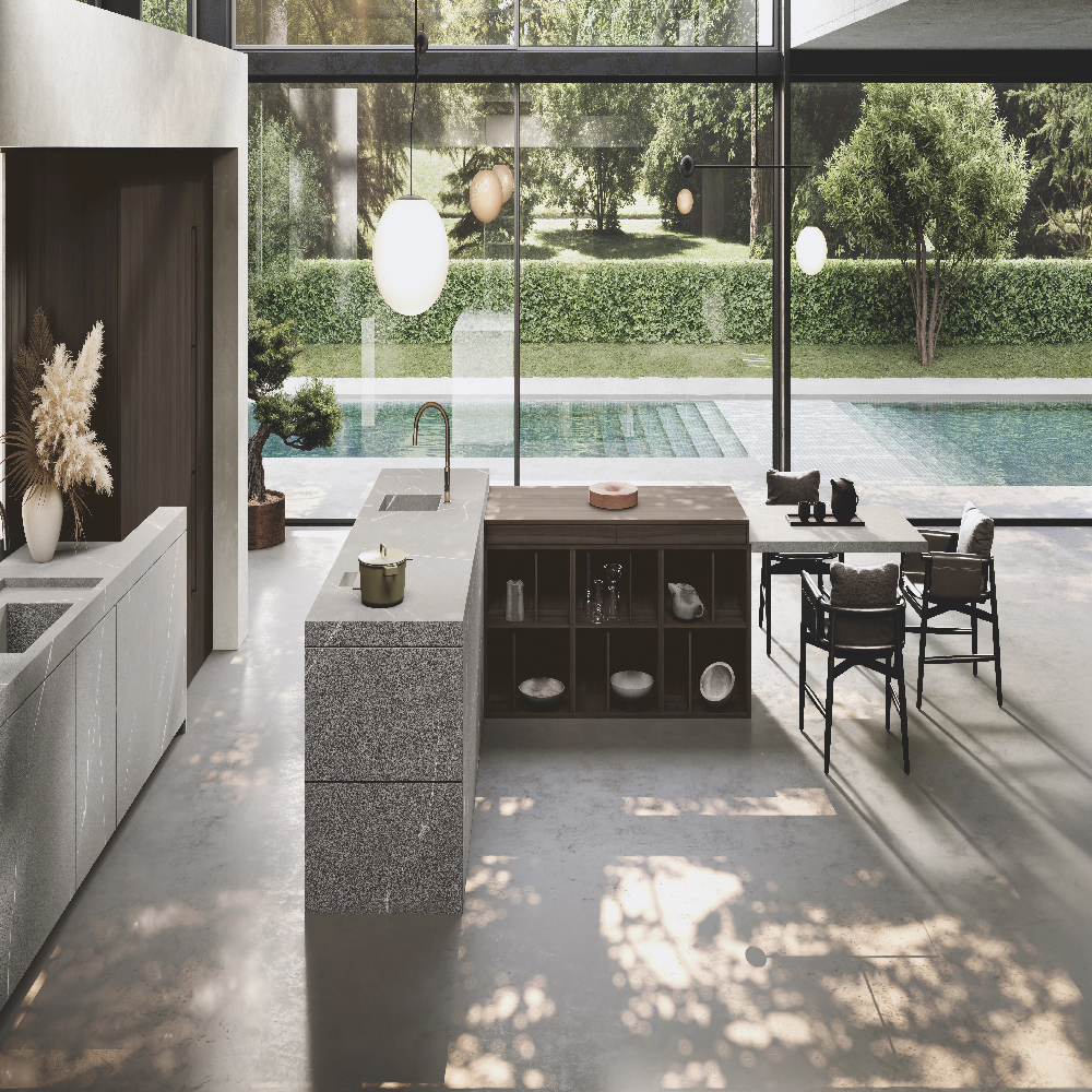 Petra glass units with bronzo scuro frame and Stopsol glass, structure in special wood veneer Noce Canaletto Grigio, back in bronzo mirror and Nova shelves (glass holder, bottle holder and smoked glass), with integrated LED lighting , in bronzo scuro finish.