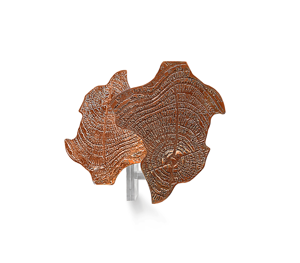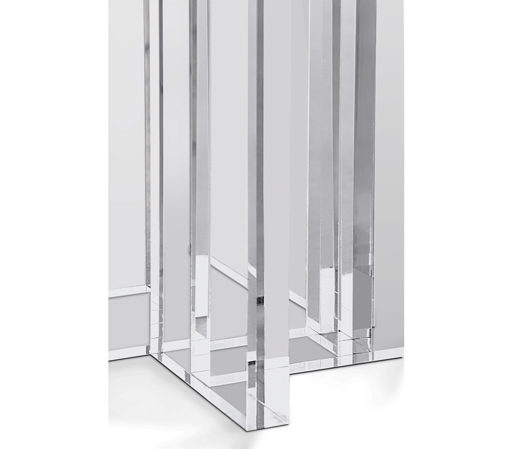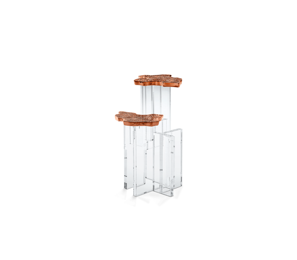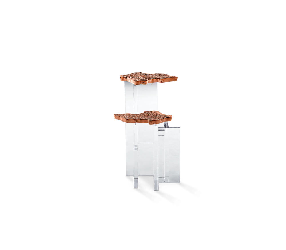 This sophisticated side table has an acrylic base, and a cast brass table top, with a unique surface texture.