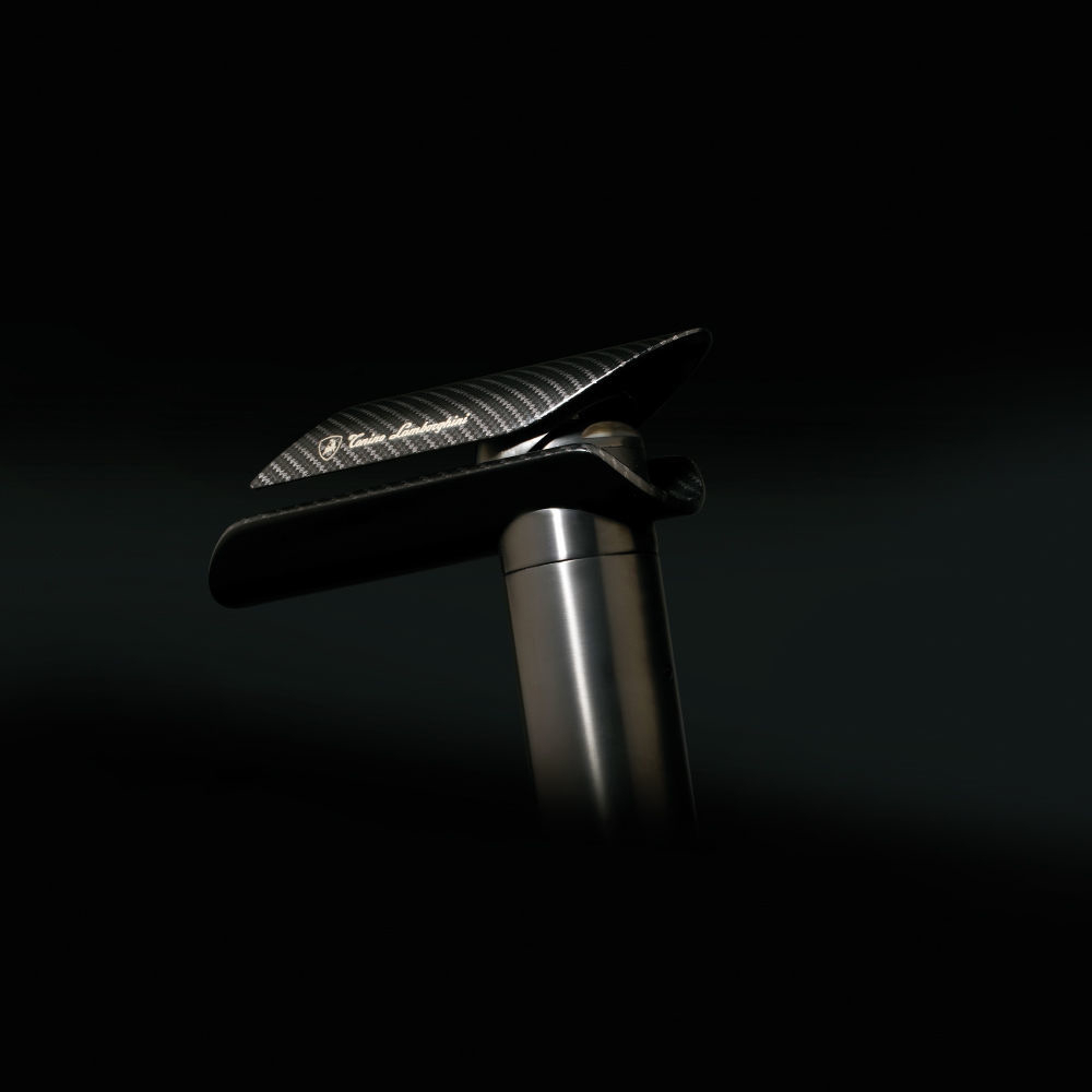Single-lever basin mixer, high model, without waste MONZA is a small sculpture. A body of strong character in PVD finish, the lever and the spout in carbon, making it an original and design object for modern environments.