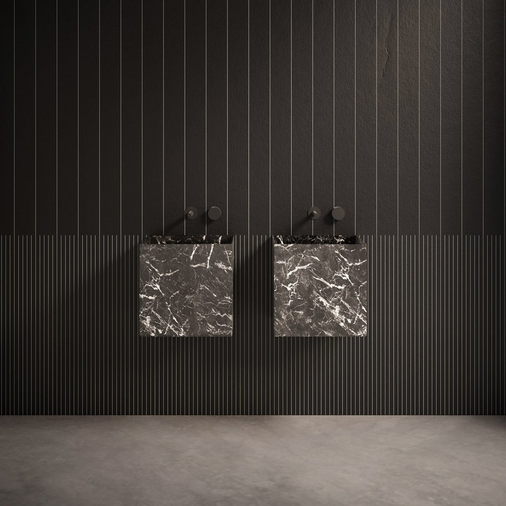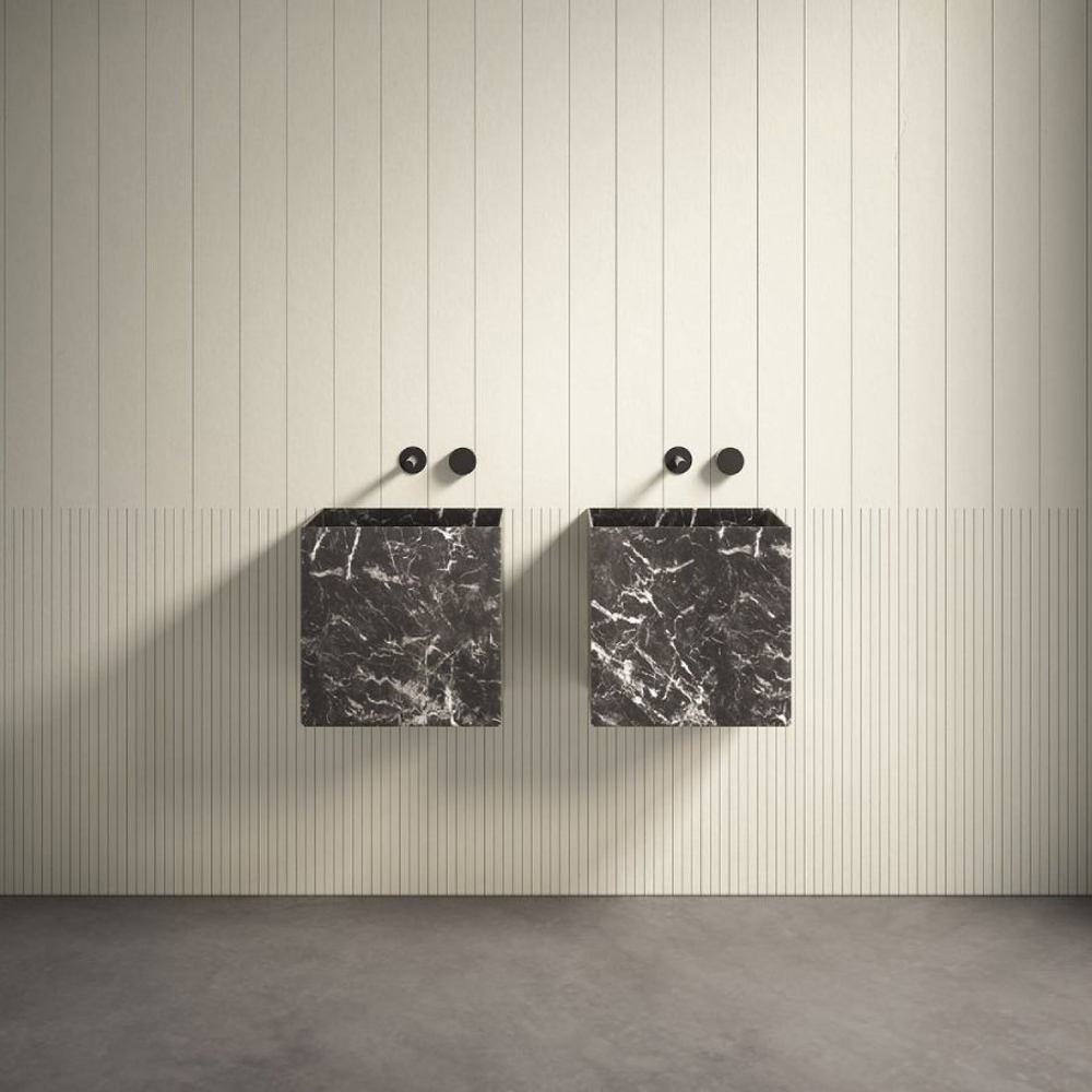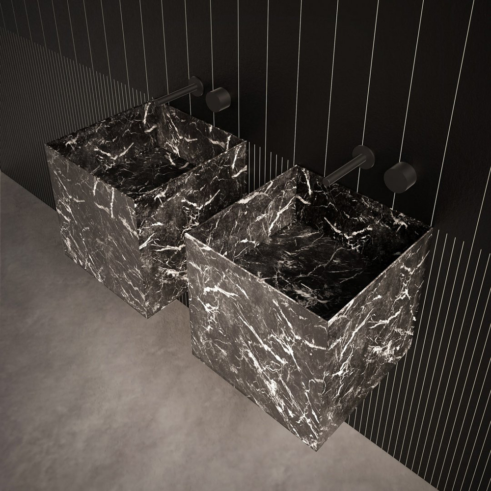 Square wall-mounted stone sink, complete with two brackets, free-flowing drain and drain pipe fitting.