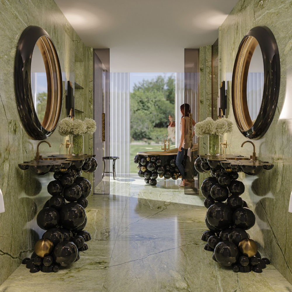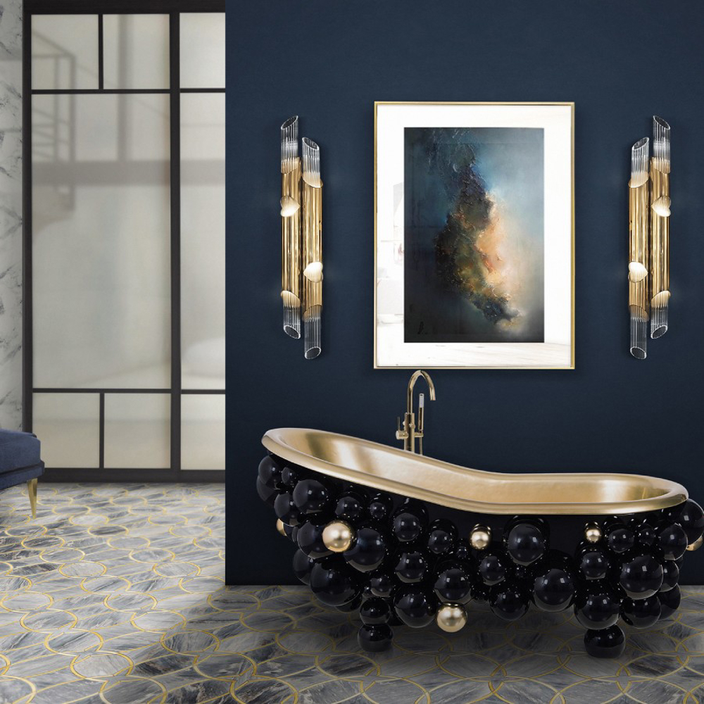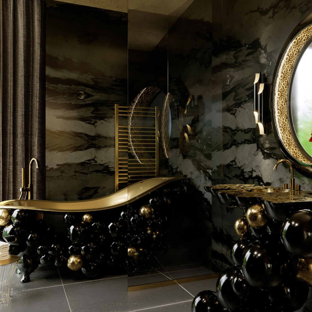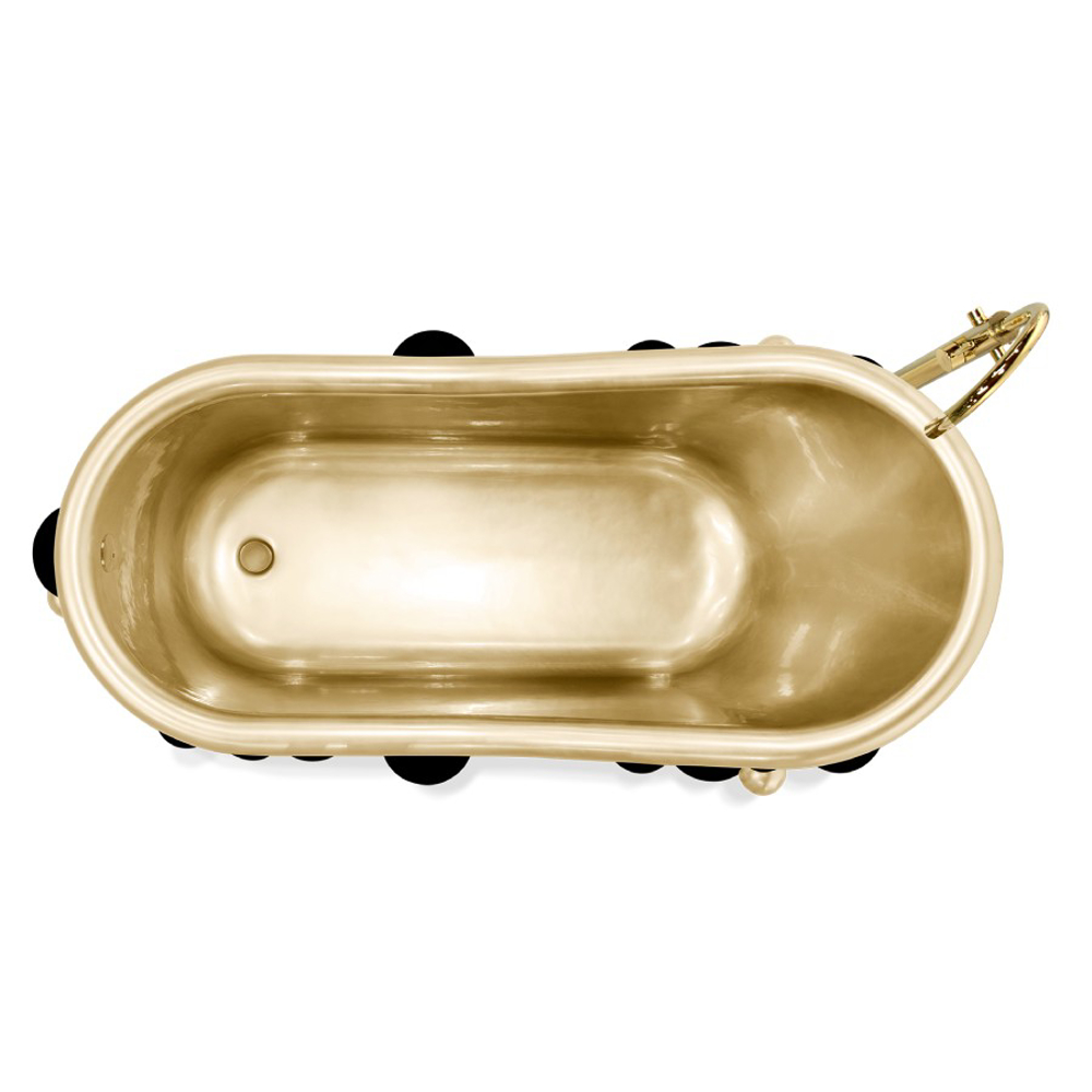 Fiber glass | Black lacquered spheres, High gloss varnish | Gold Painted Spheres, High Gloss Varnish; Tub: Casted iron, Gold painted; Water drainage: Floor