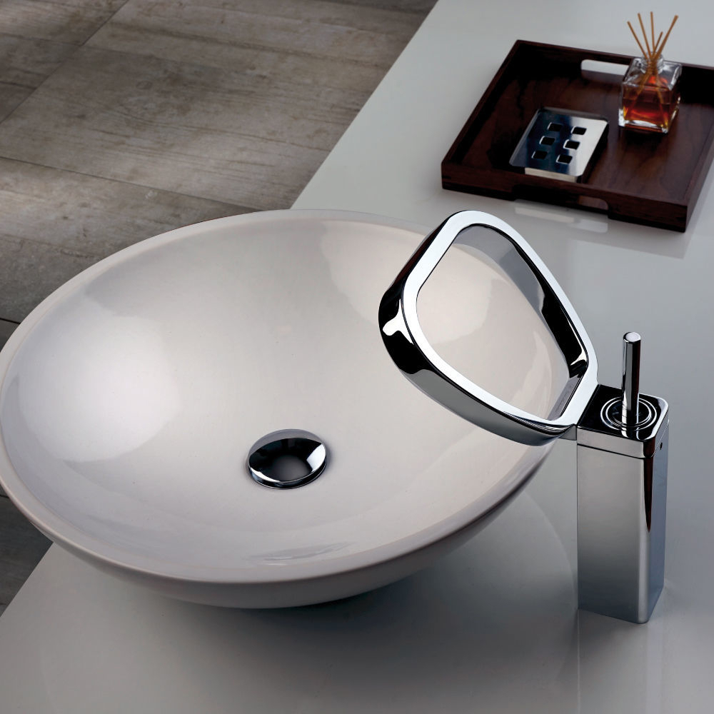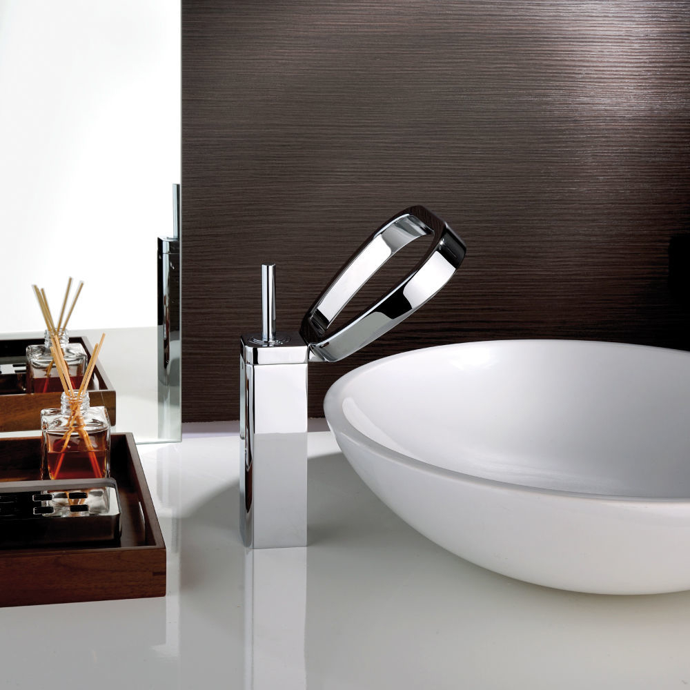 Single lever high basin mixer, with waste faucet designed as a fine jewelry jewel. It is unique because of its original shape, characterized by a curvilinear and slender body like the Nürburgring circuit, a linear jet of water cascade and a thin and minimal cylindrical lever.