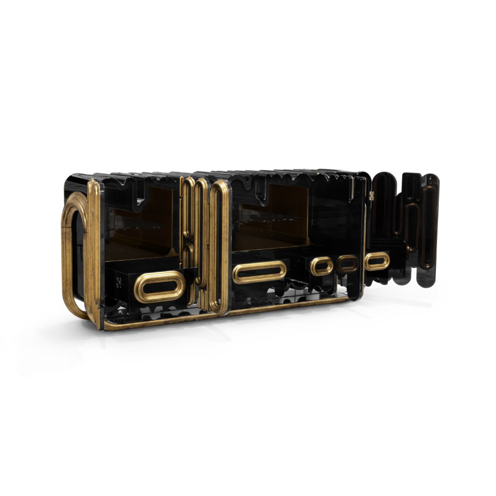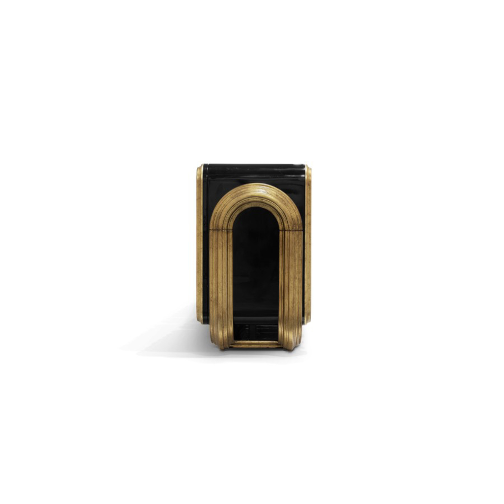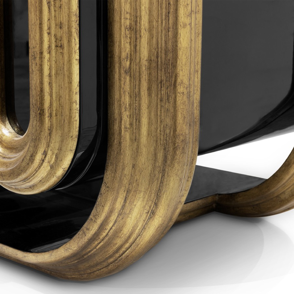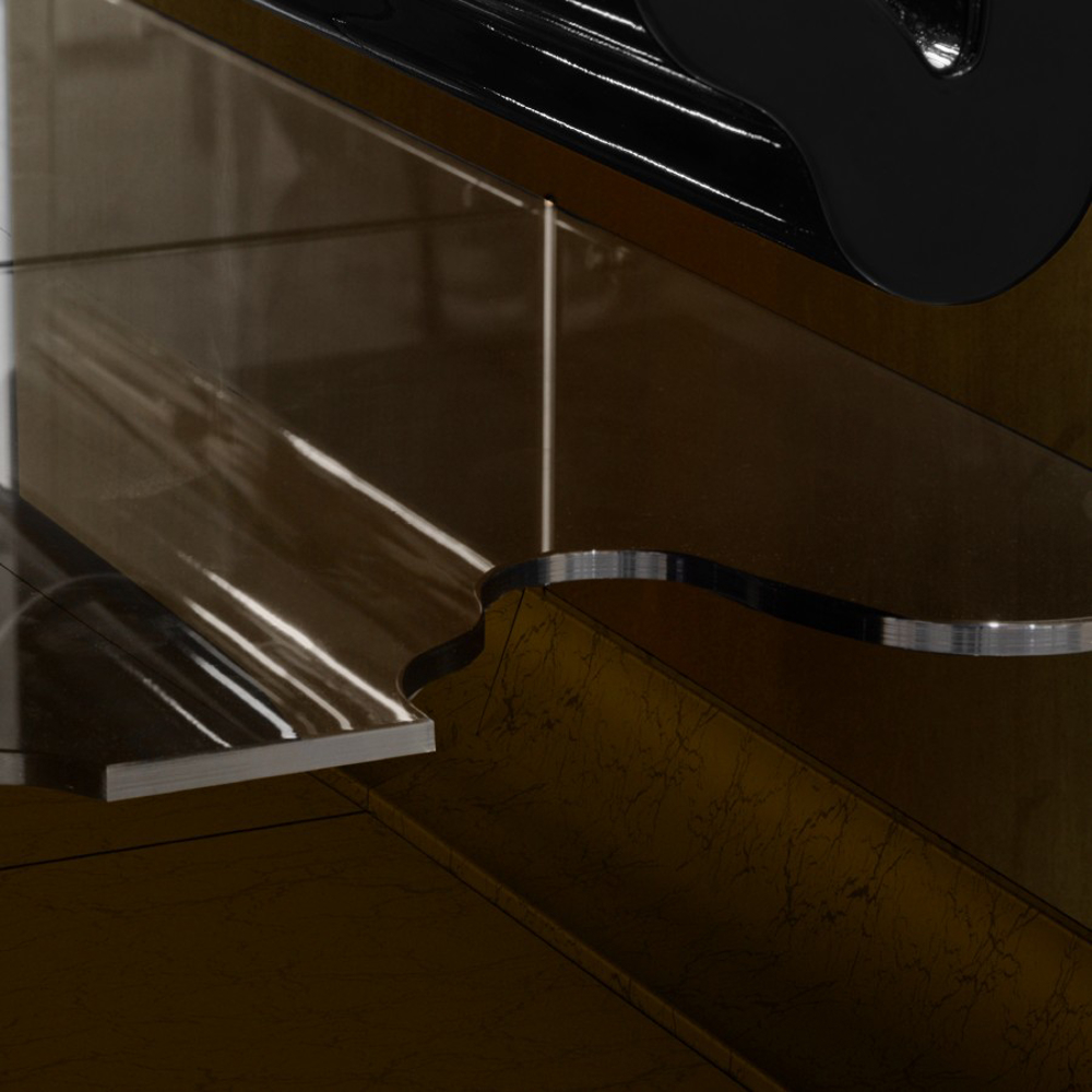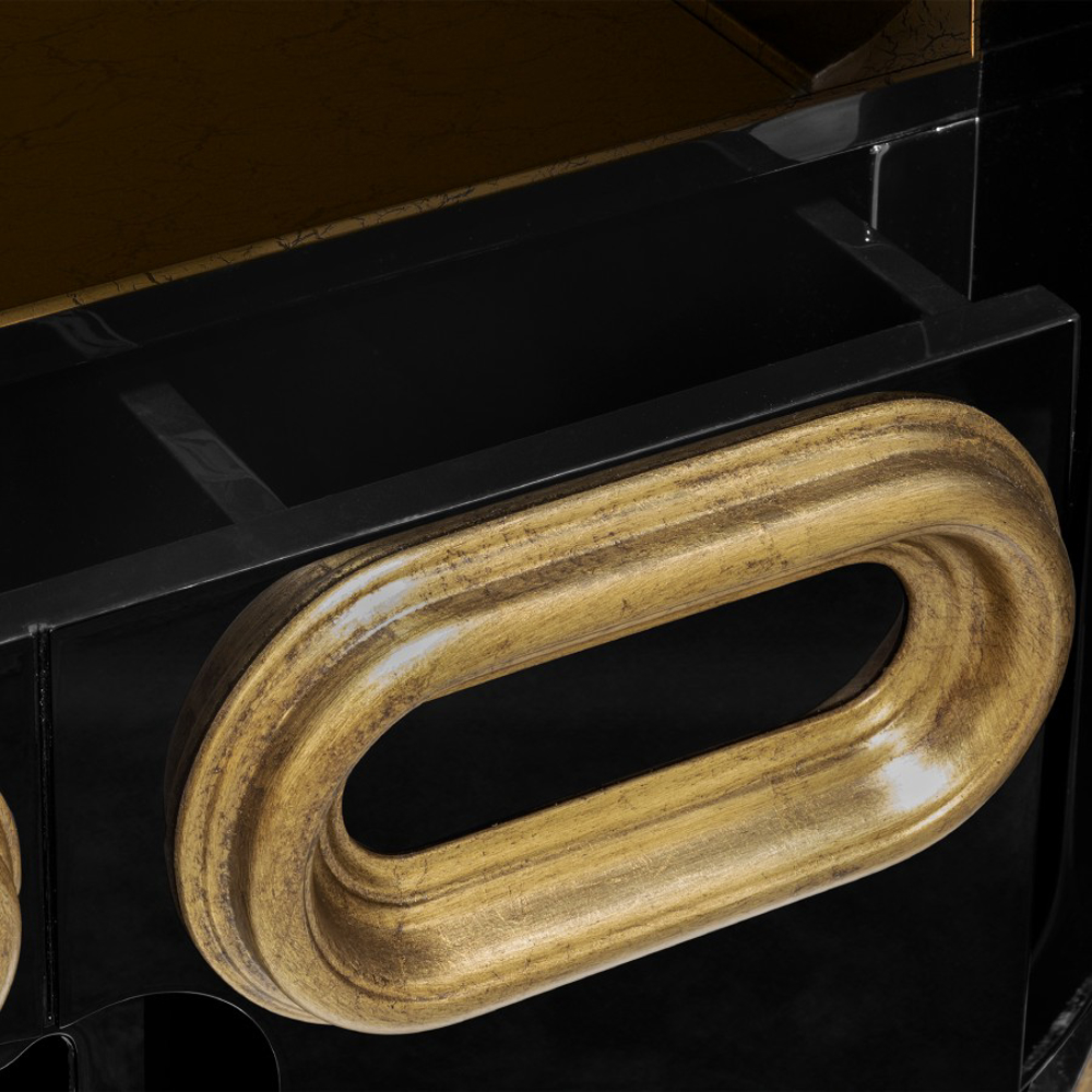 Wooden structure with a mirrored interio. Black lacquered with gloss varnish & aged gold leaf with matte varnish.