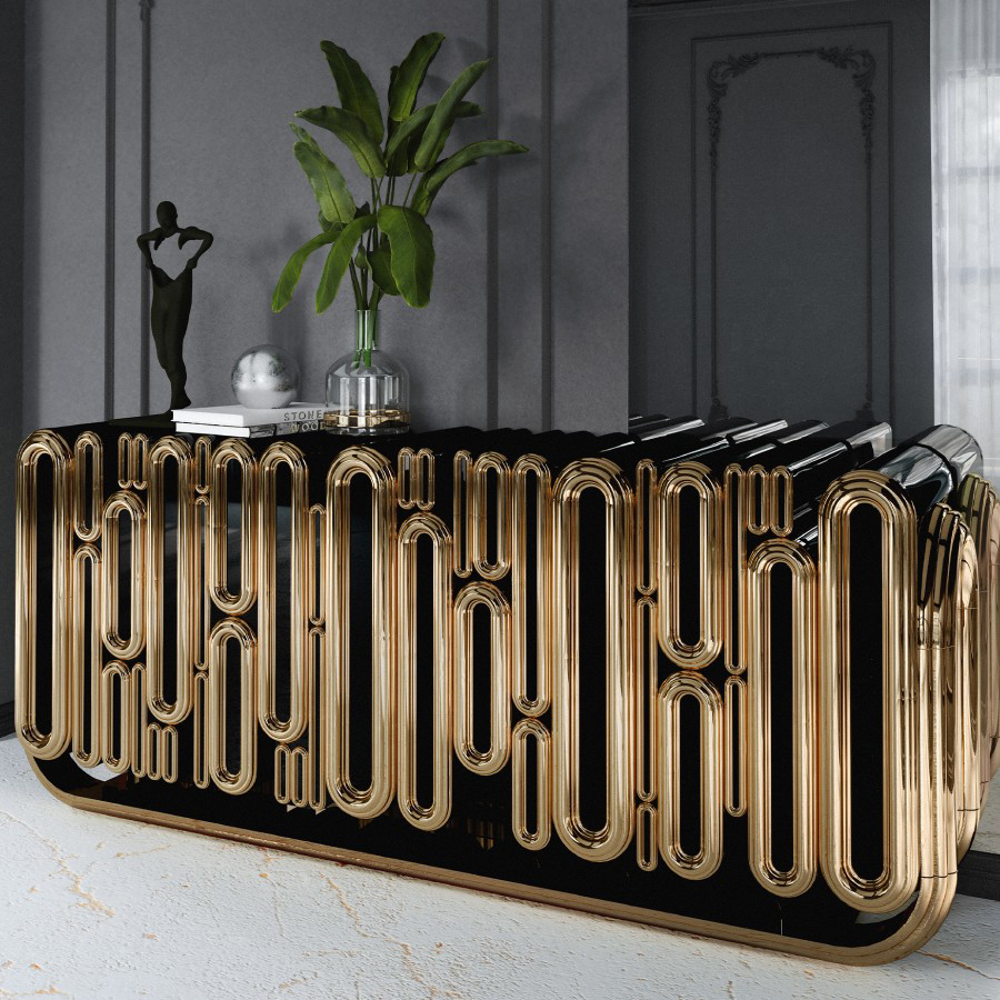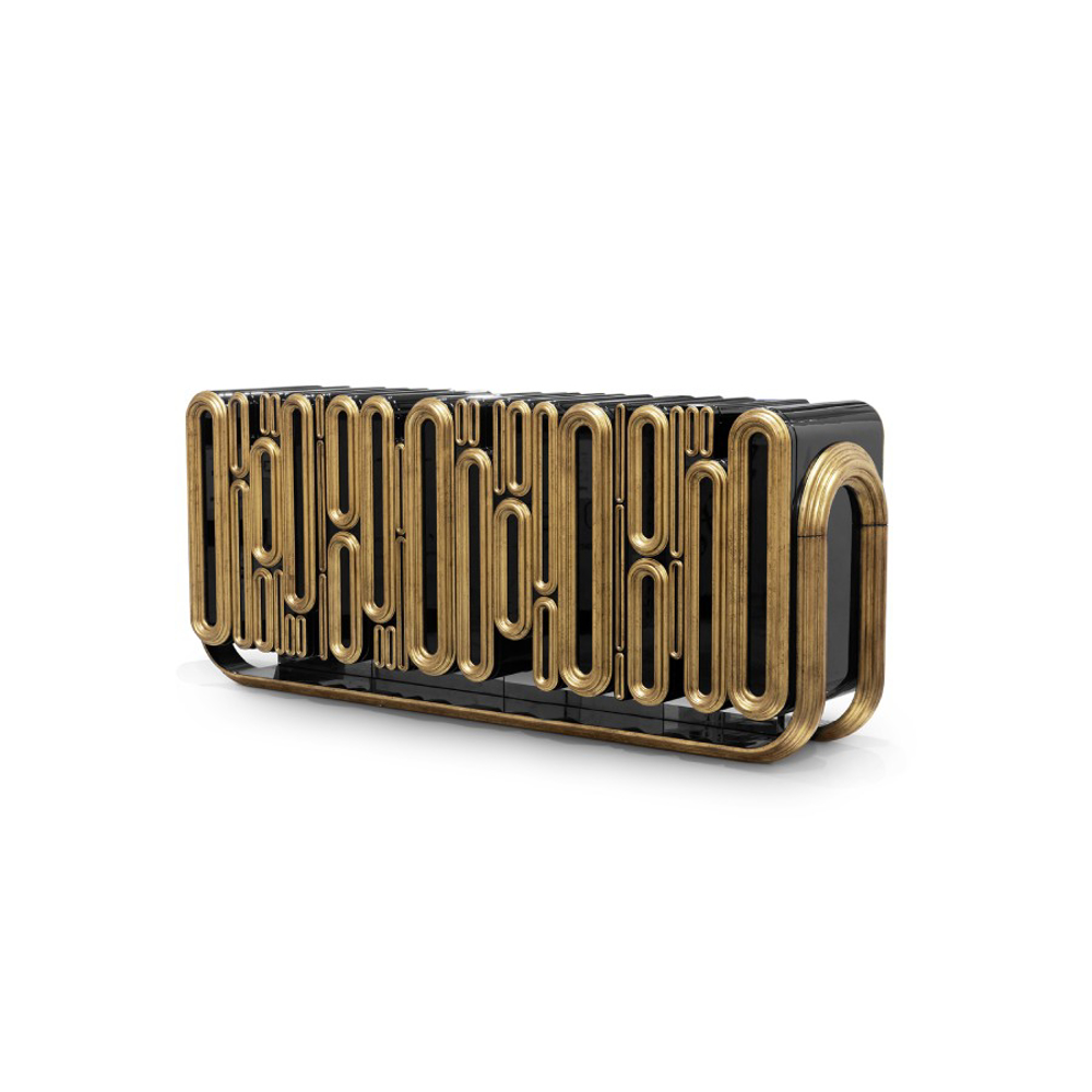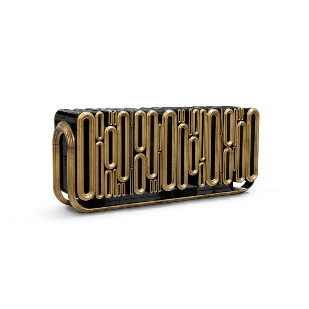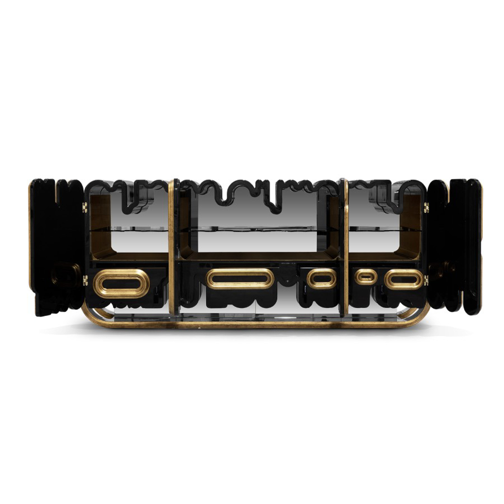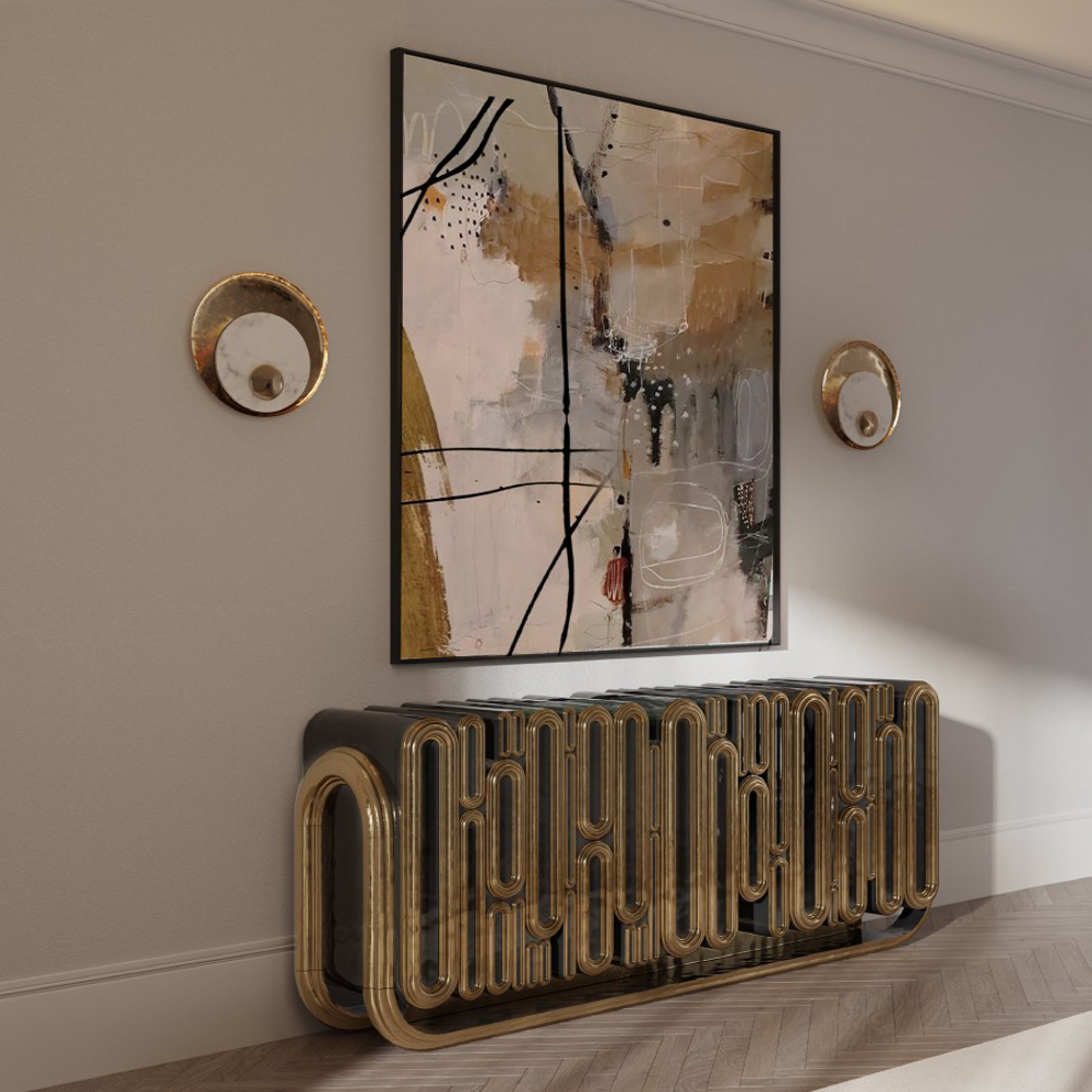 Wooden structure with a mirrored interio. Black lacquered with gloss varnish & aged gold leaf with matte varnish.