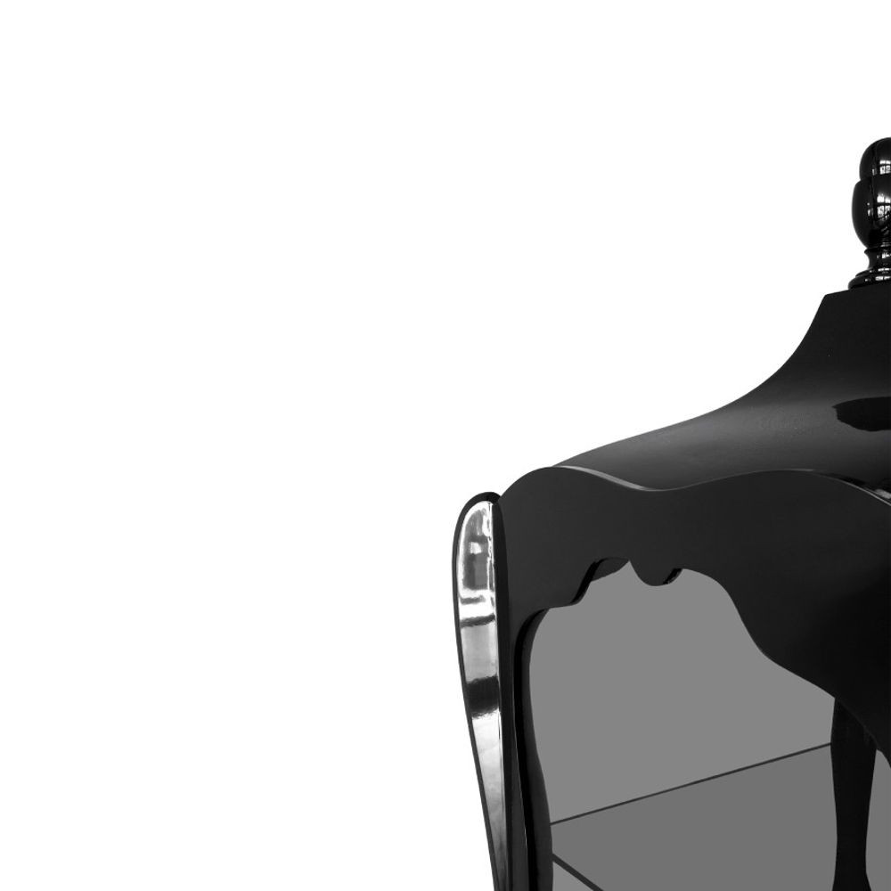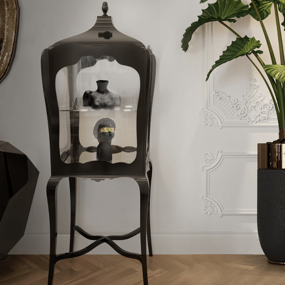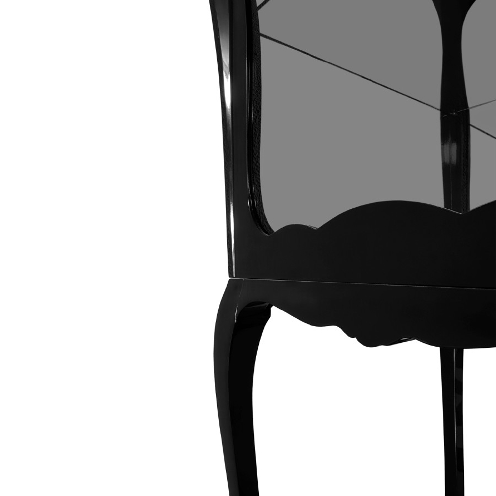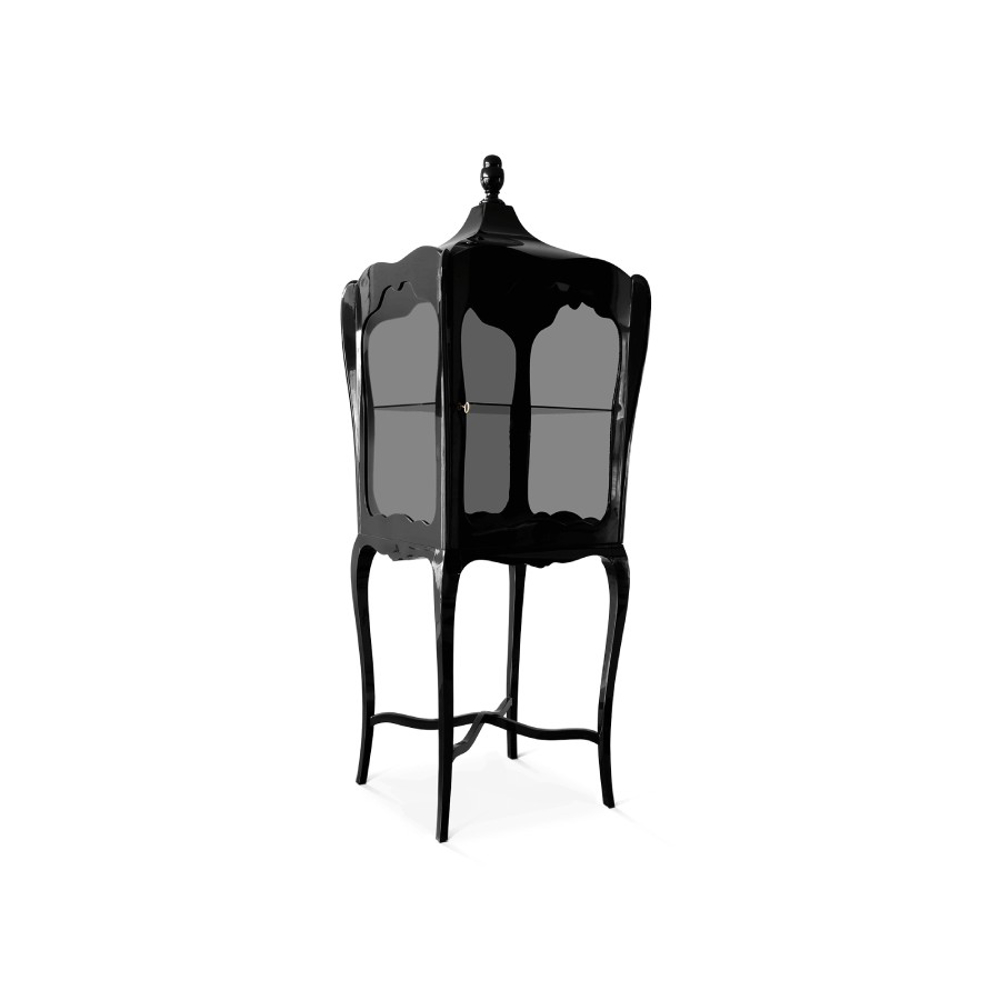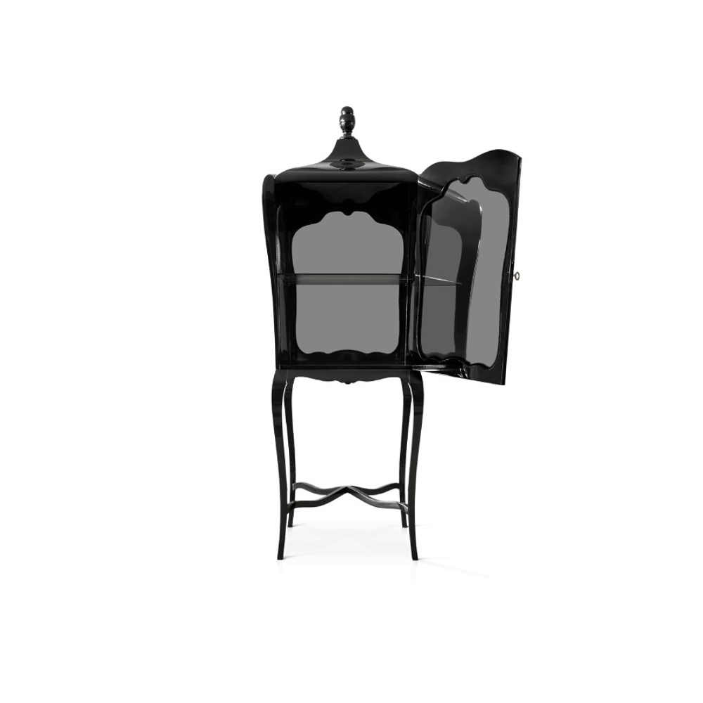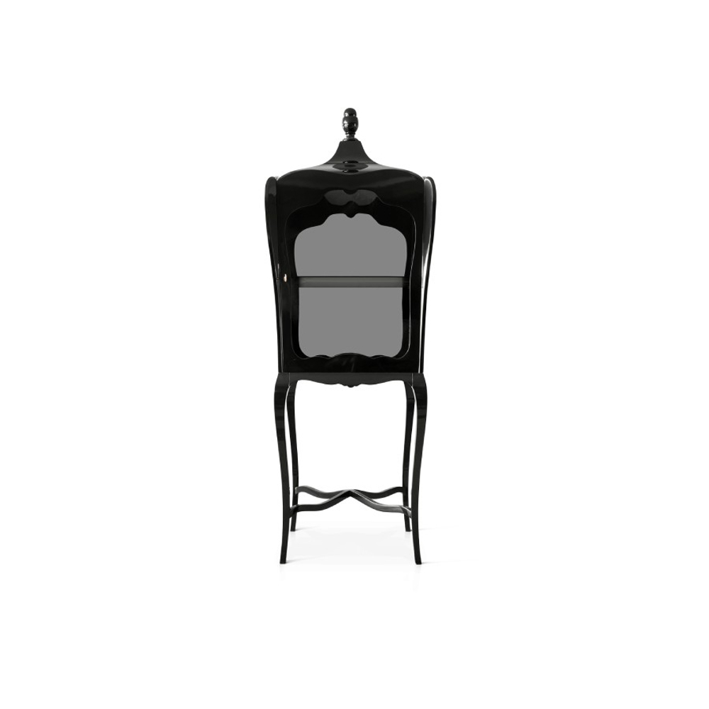 Composed by mahogany and clear glass in the front, back and laterals. Contains one shelf in tempered glass. It is opened through a frontal door by closing switch.