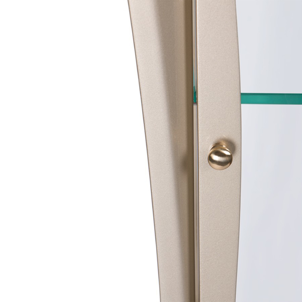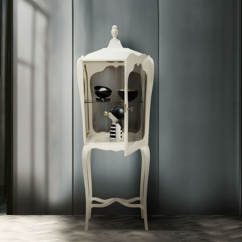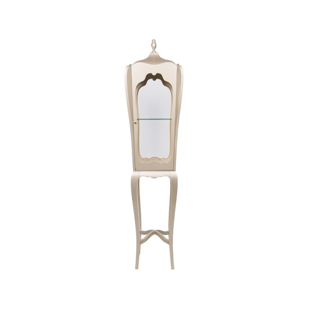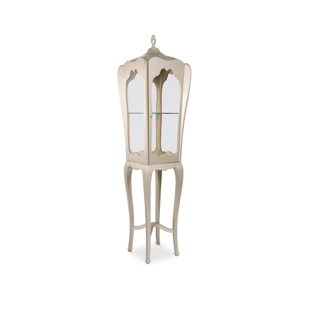 The black detailed frame is handcrafted in mahogany and supports four panels of clear glass. Behind its door that opens through a golden knob and closing switch, the interior boasts a single shelf in tempered glass. A versatile yet timeless case piece to showcase precious objects in different private homes or contract projects, from the most contemporary interior design rooms to the most classic interiors.