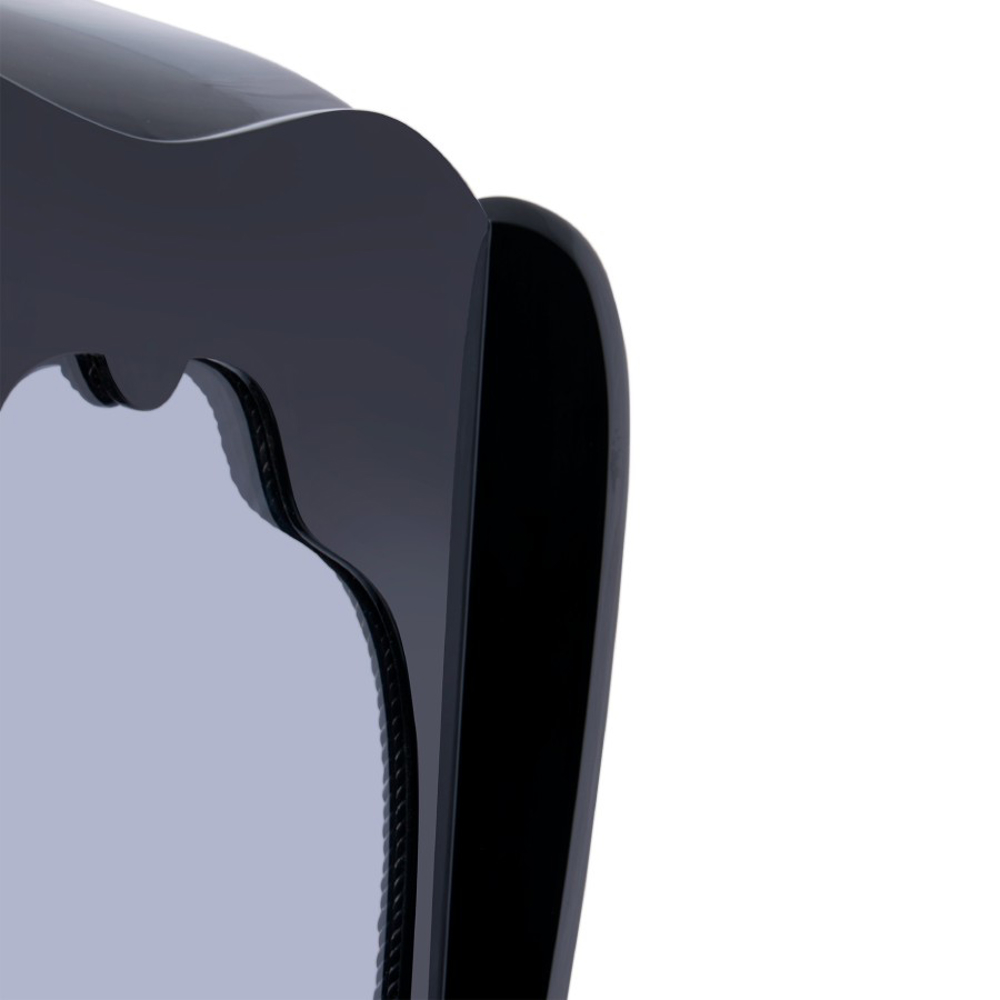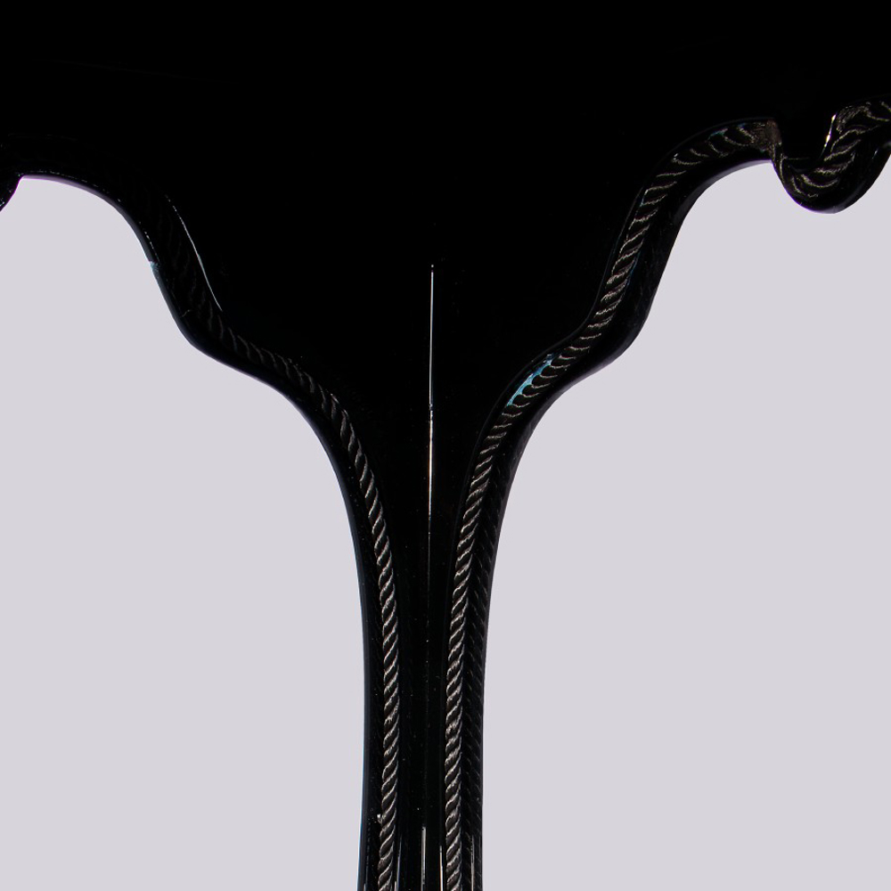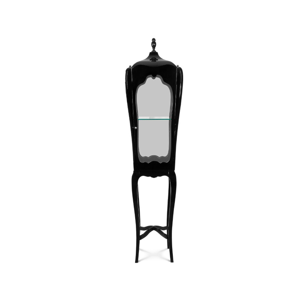 The black detailed frame is handcrafted in mahogany and supports four panels of clear glass. Behind its door that opens through a golden knob and closing switch, the interior boasts a single shelf in tempered glass. A versatile yet timeless case piece to showcase precious objects in different private homes or contract projects, from the most contemporary interior design rooms to the most classic interiors.