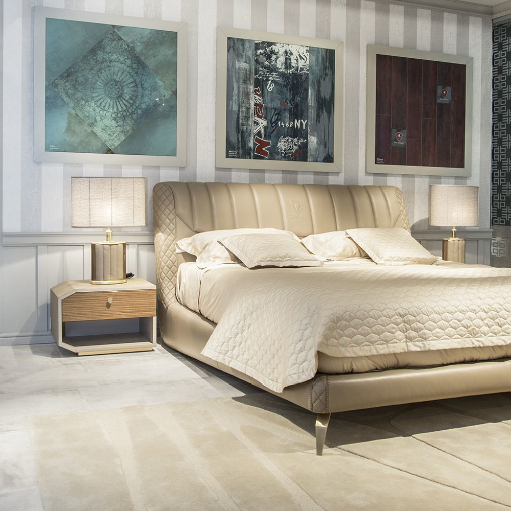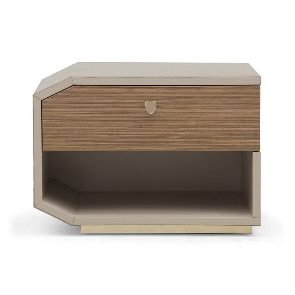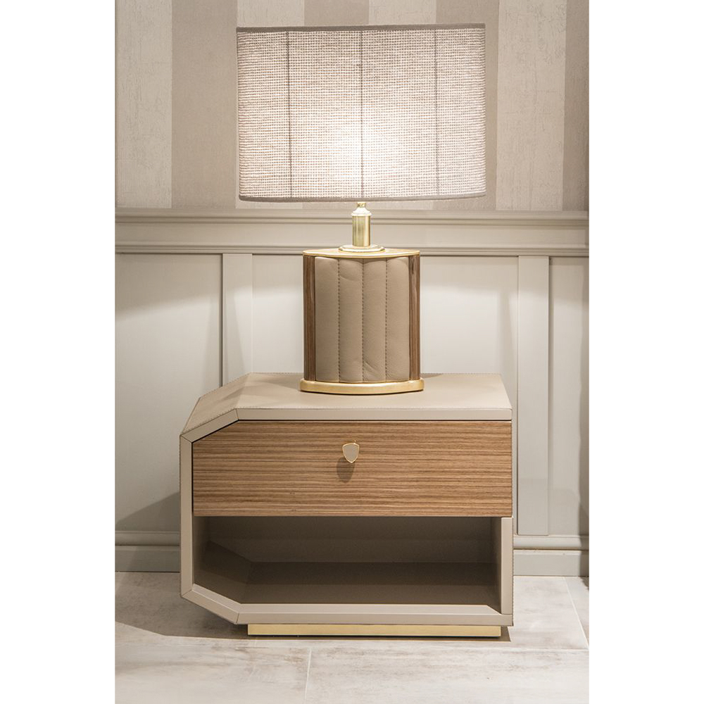 Structure in leather Stoccarda col. 629 Stone, contrast stitching, frontal drawer in veneer Noce Canaletto glossy, metal base col. Gold matt, shield handle col. gold with leather insert.