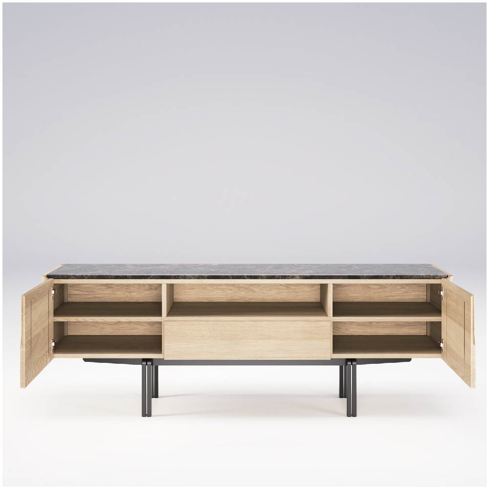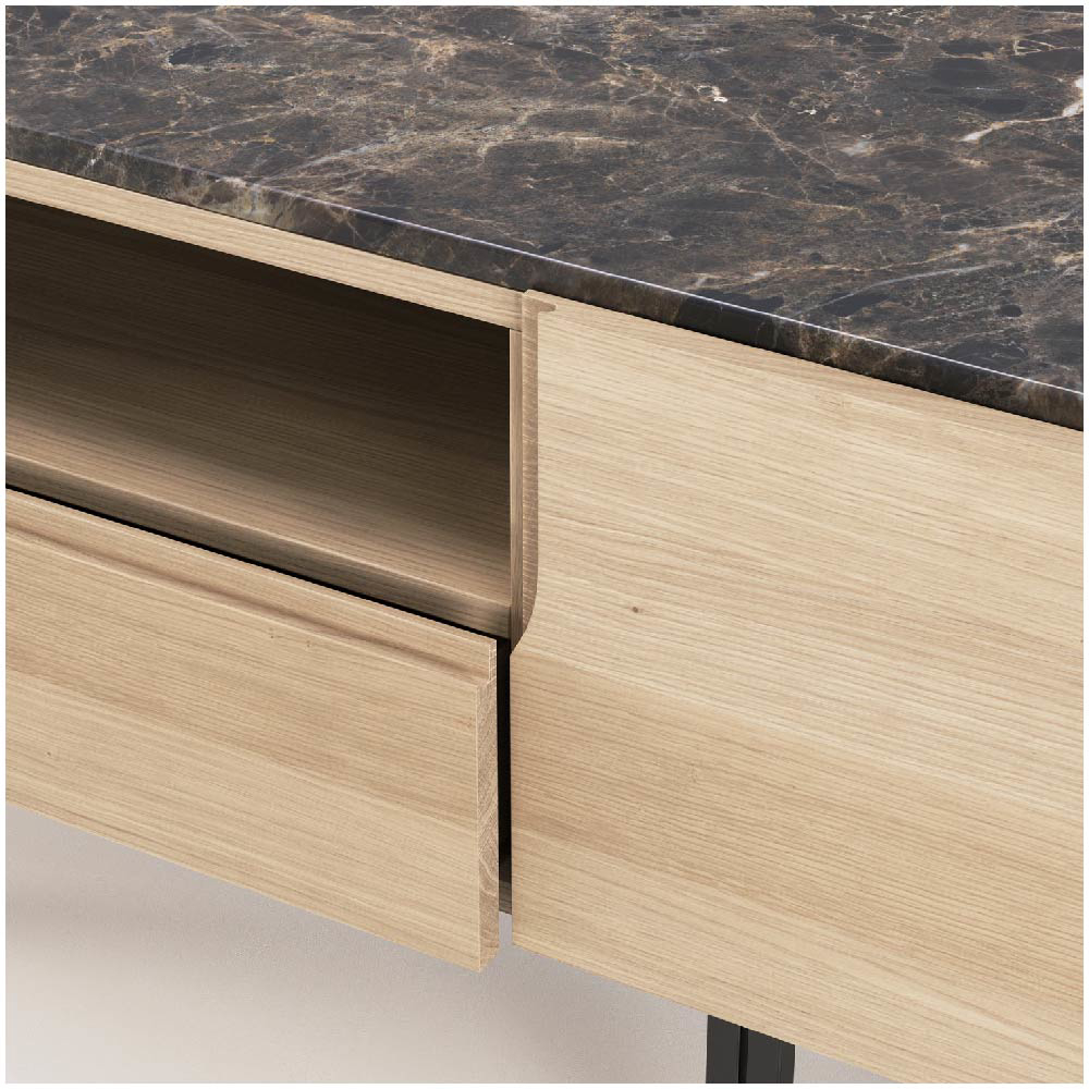 The use of noble woods such as walnut or oak brings a natural warmth and tactile richness to the piece, grounding it in tradition and craftsmanship. These are gracefully contrasted with refined materials like marble, adding a cool, luxurious surface, and black lacquered iron, which introduces a touch of modern industrial character. This deliberate combination of textures and tones contributes to the overall sense of quiet sophistication, making the piece feel both contemporary and timeless.