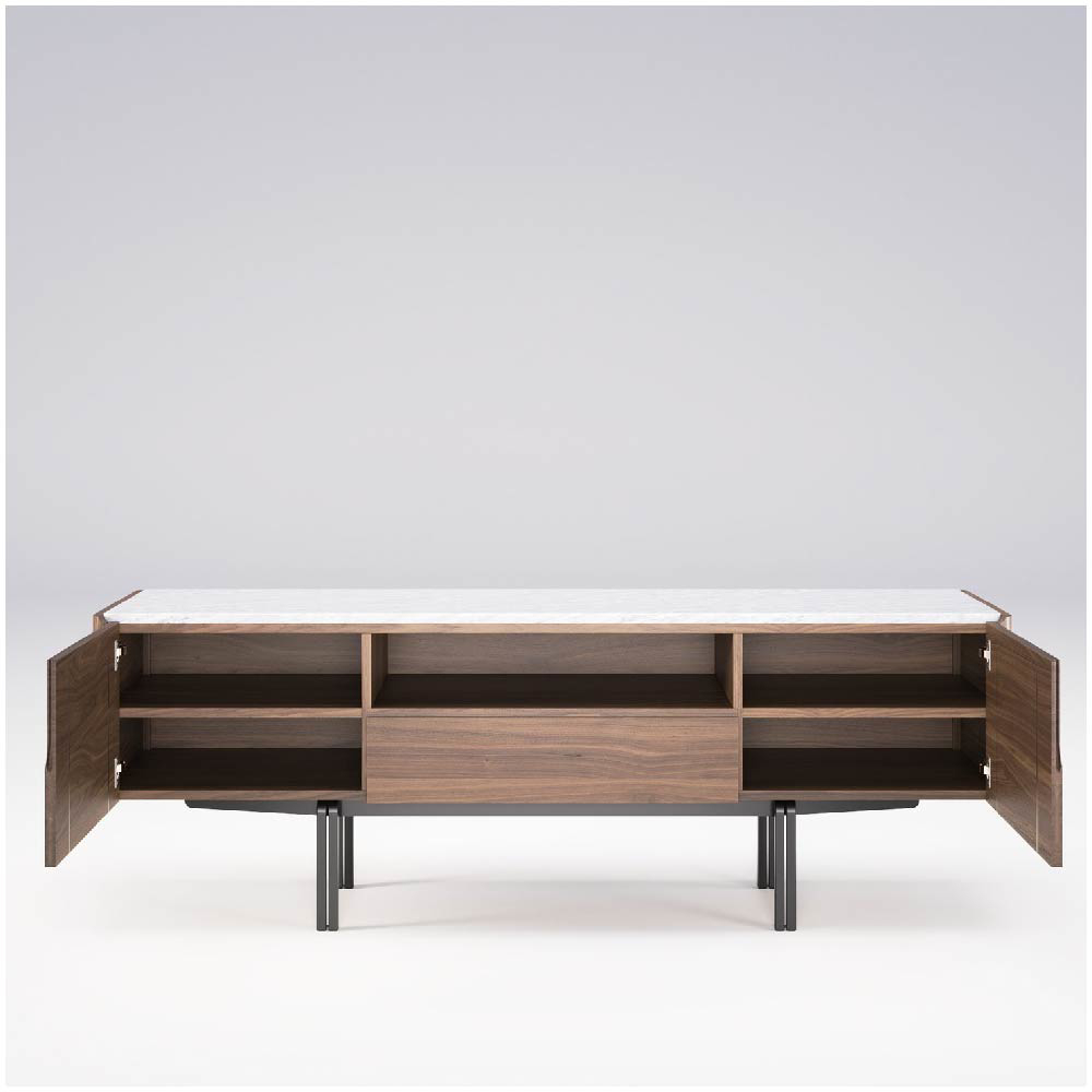The use of noble woods such as walnut or oak brings a natural warmth and tactile richness to the piece, grounding it in tradition and craftsmanship. These are gracefully contrasted with refined materials like marble, adding a cool, luxurious surface, and black lacquered iron, which introduces a touch of modern industrial character. This deliberate combination of textures and tones contributes to the overall sense of quiet sophistication, making the piece feel both contemporary and timeless.
