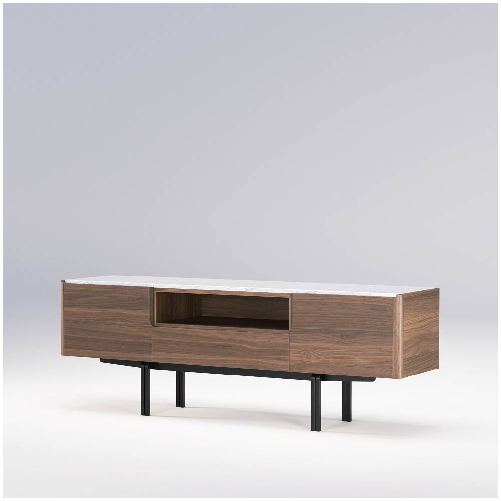 One of the most distinctive features of Panamá media unit is its tubular metal legs, shaped into elegant curved “L” forms and mounted parallel to the supporting structure. These legs not only provide stability and a floating effect but also evoke a poetic reference to the Panama Canal, symbolizing the seamless connection between two worlds, the robust and the refined, the past and the present.