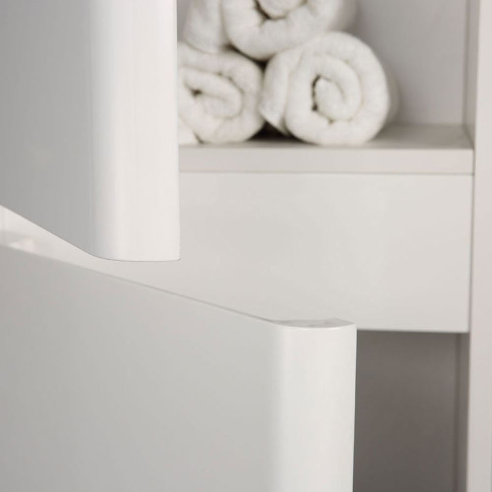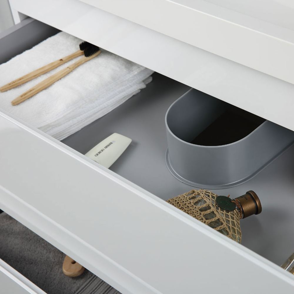 Ideally curved corners, beautifully emphasized drawer lines and glossy white countertop adds additional elegance to its contemporary design.