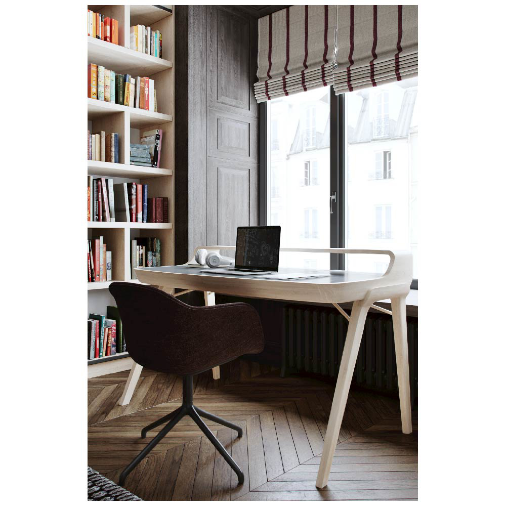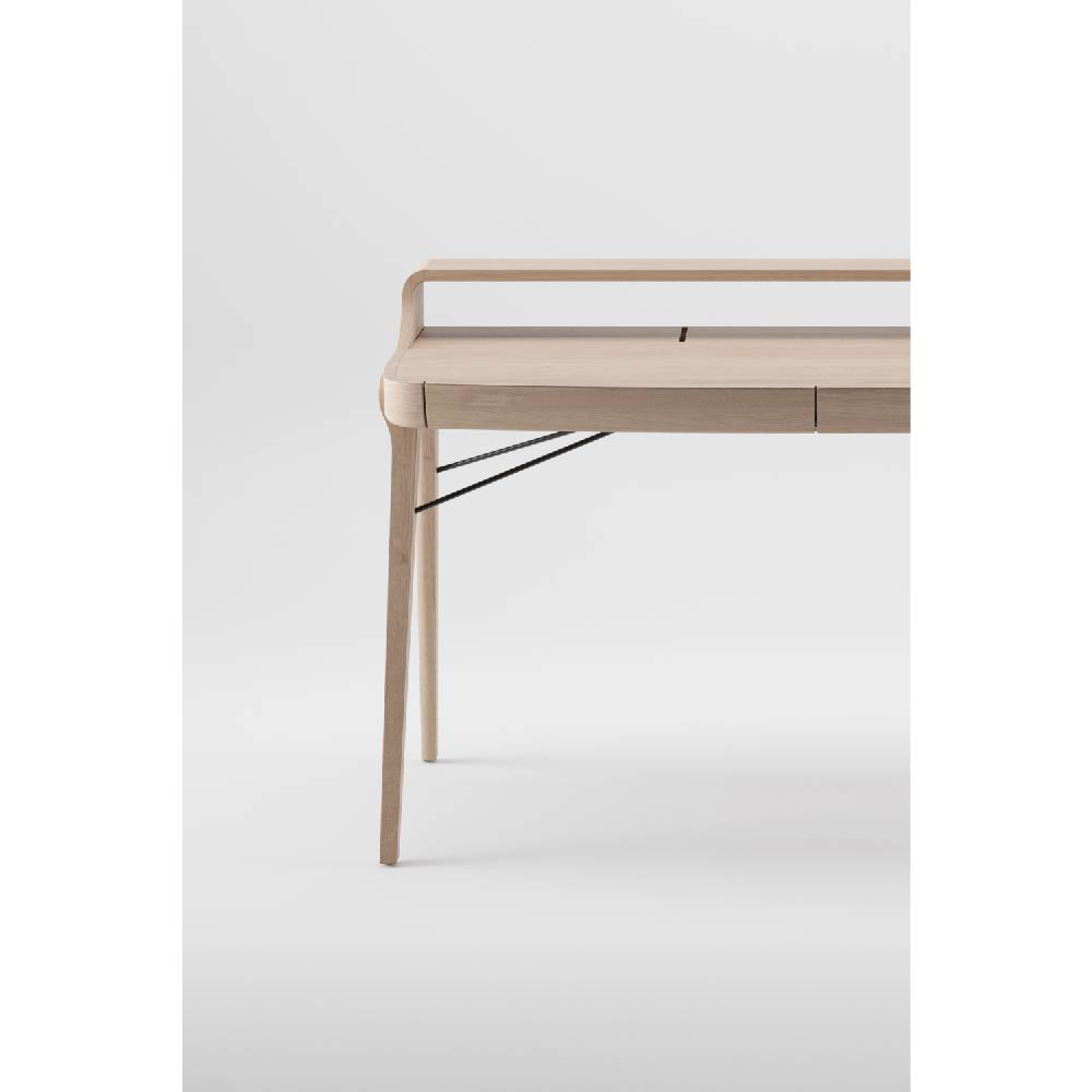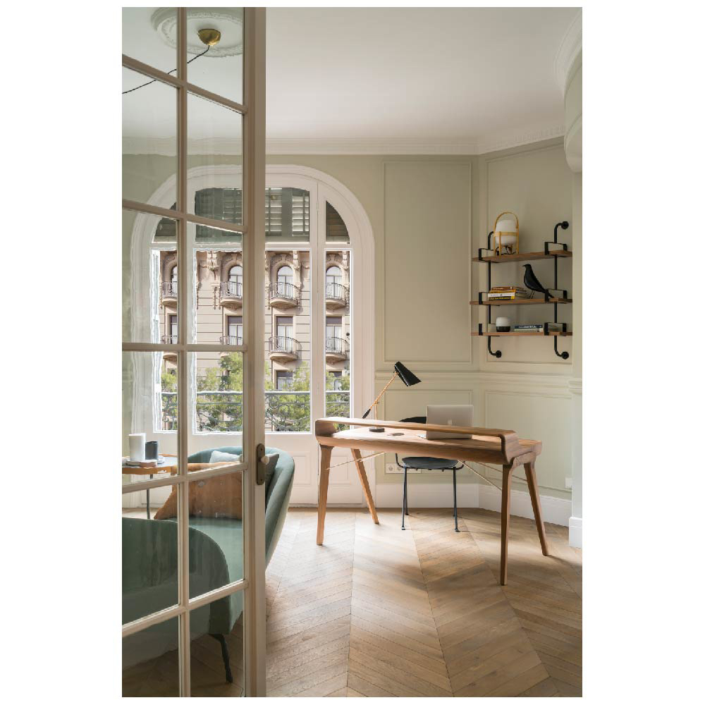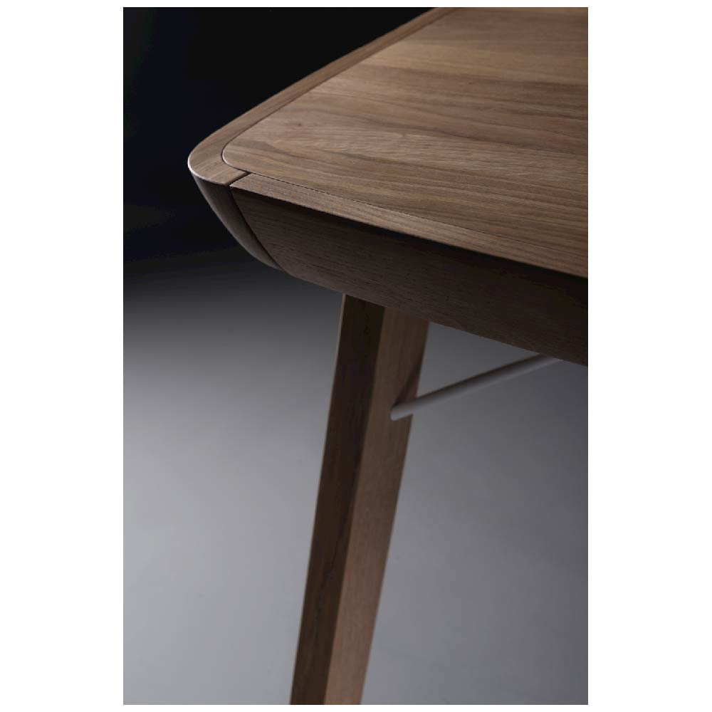 The compact legs are attached to the lateral sides of the table, leaving the workspace free; both strong and elegant, they are additionally fixed by metal holders. Its design creates a plausible body, elegant and powerful, a comfortable workspace suited to both more intimate and dynamic ambiences.