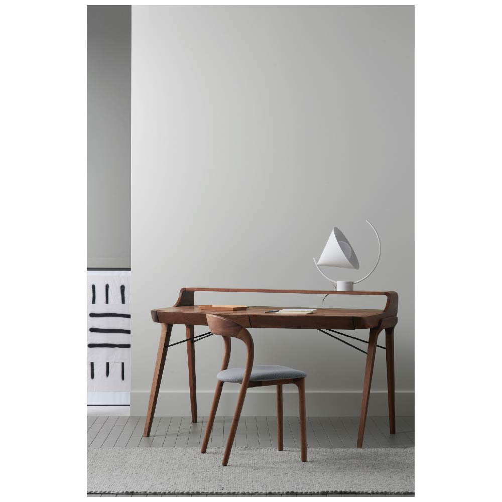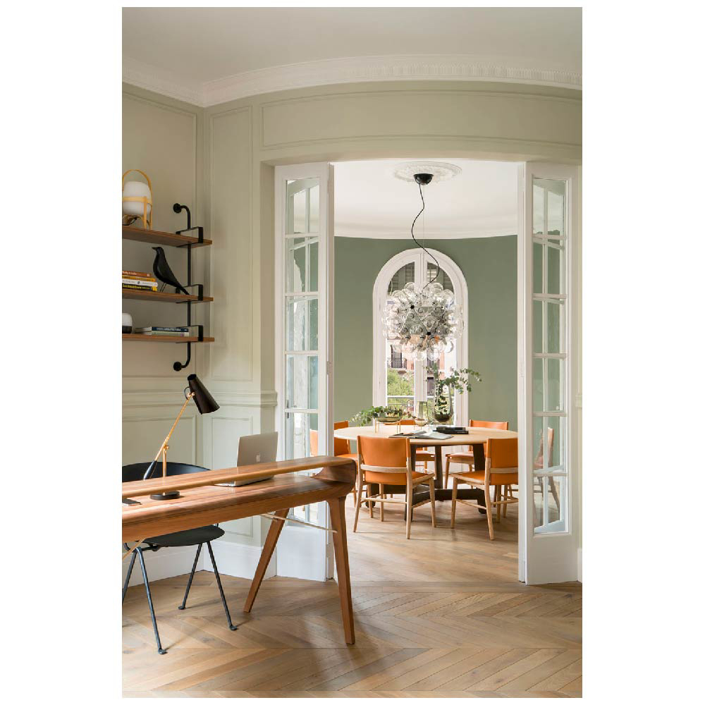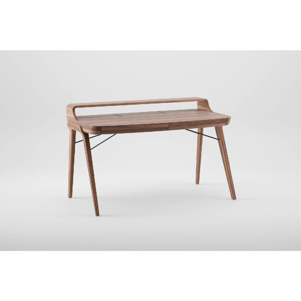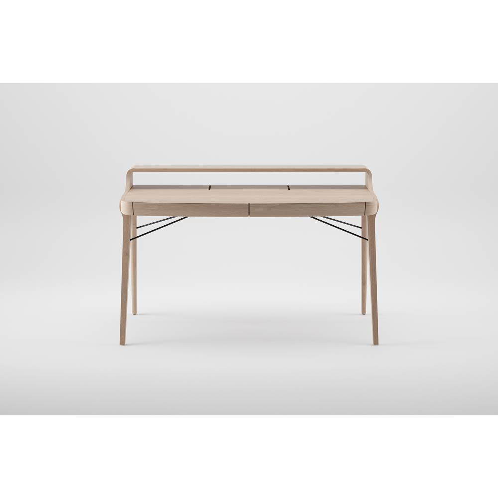 The compact legs are attached to the lateral sides of the table, leaving the workspace free; both strong and elegant, they are additionally fixed by metal holders. Its design creates a plausible body, elegant and powerful, a comfortable workspace suited to both more intimate and dynamic ambiences.