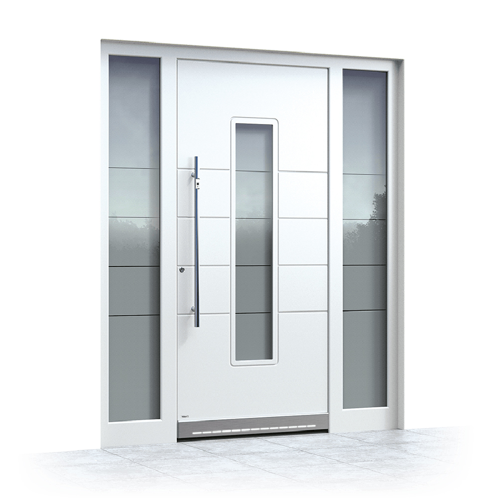 Whether you're building a modern or traditional home, you can't go wrong with a white door. A neutral white door is always an evergreen choice, particularly if your façade is of a darker shade or made of darker decorative elements such as stone. Opt for a round bar handle, which can also be fitted with a SECURO fingerprint scanner for greater security and ease of entry. The simple but aesthetic glass section has a horizontal motif, which continues right across the surface of the door. The protective trim with LUX ambient floor lighting complements the overall look of the door. If space allows, choose one or two sidelights.