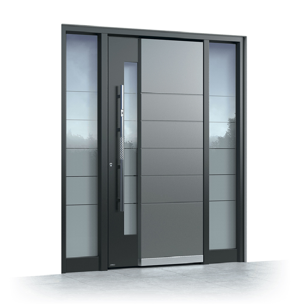 The elegant aluminum model Pivot Entrance Door Watts a with its contrasting two-tone color scheme creates a very distinctive entrance to your home. Add a touch of grandeur by including sidelights. The choice of a round, elongated stainless steel handle with MagmaLux lighting further enhances the aesthetics of this front door. You can subtly integrate a SECURO fingerprint scanner into the handle to make opening your door easy and secure. The narrow rectangular window together with the stylish protective trim, adds to the dynamism of the entrance.