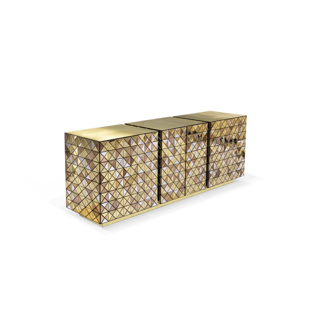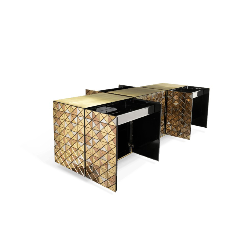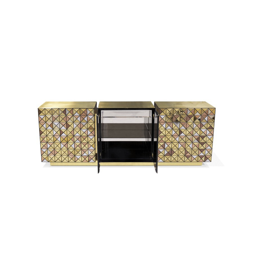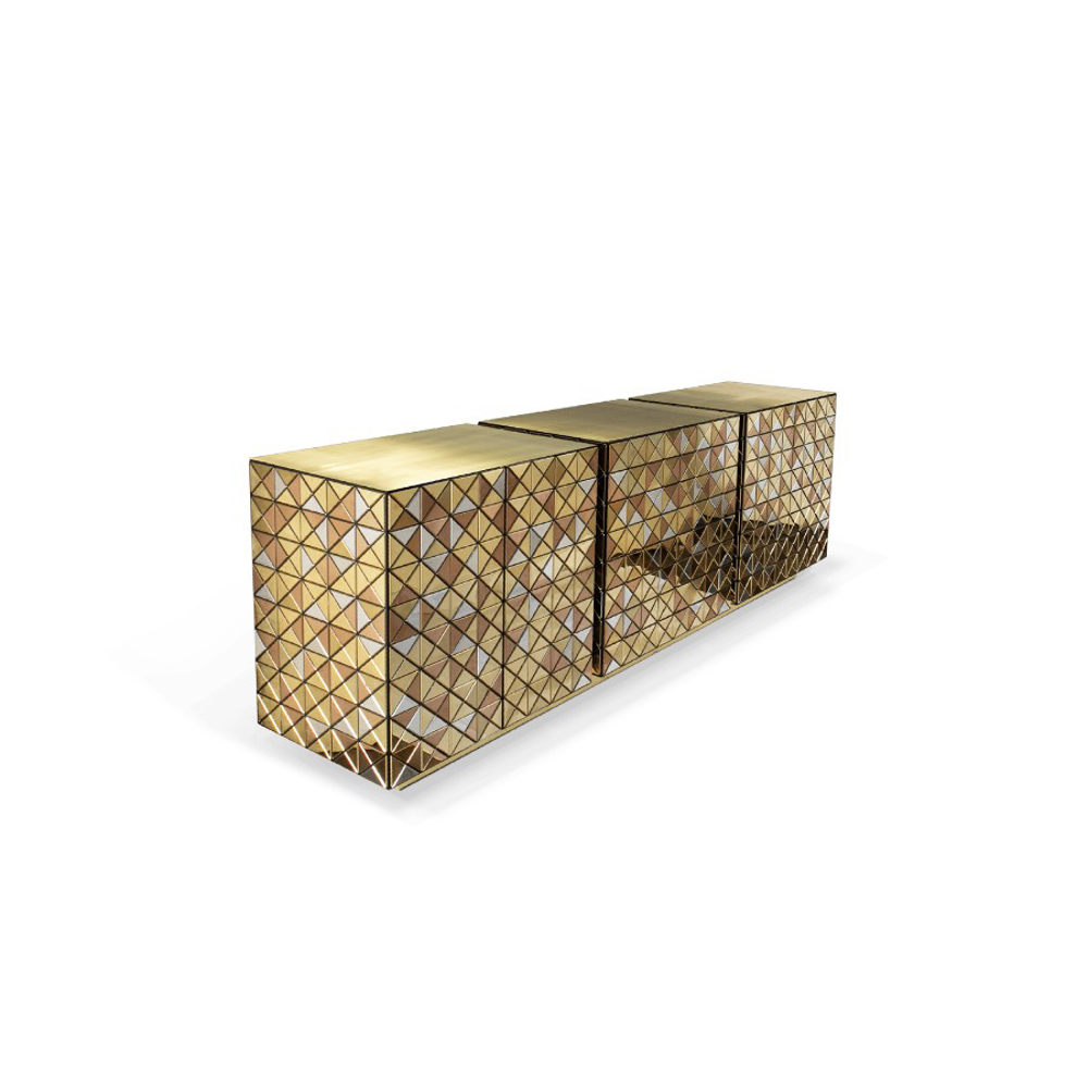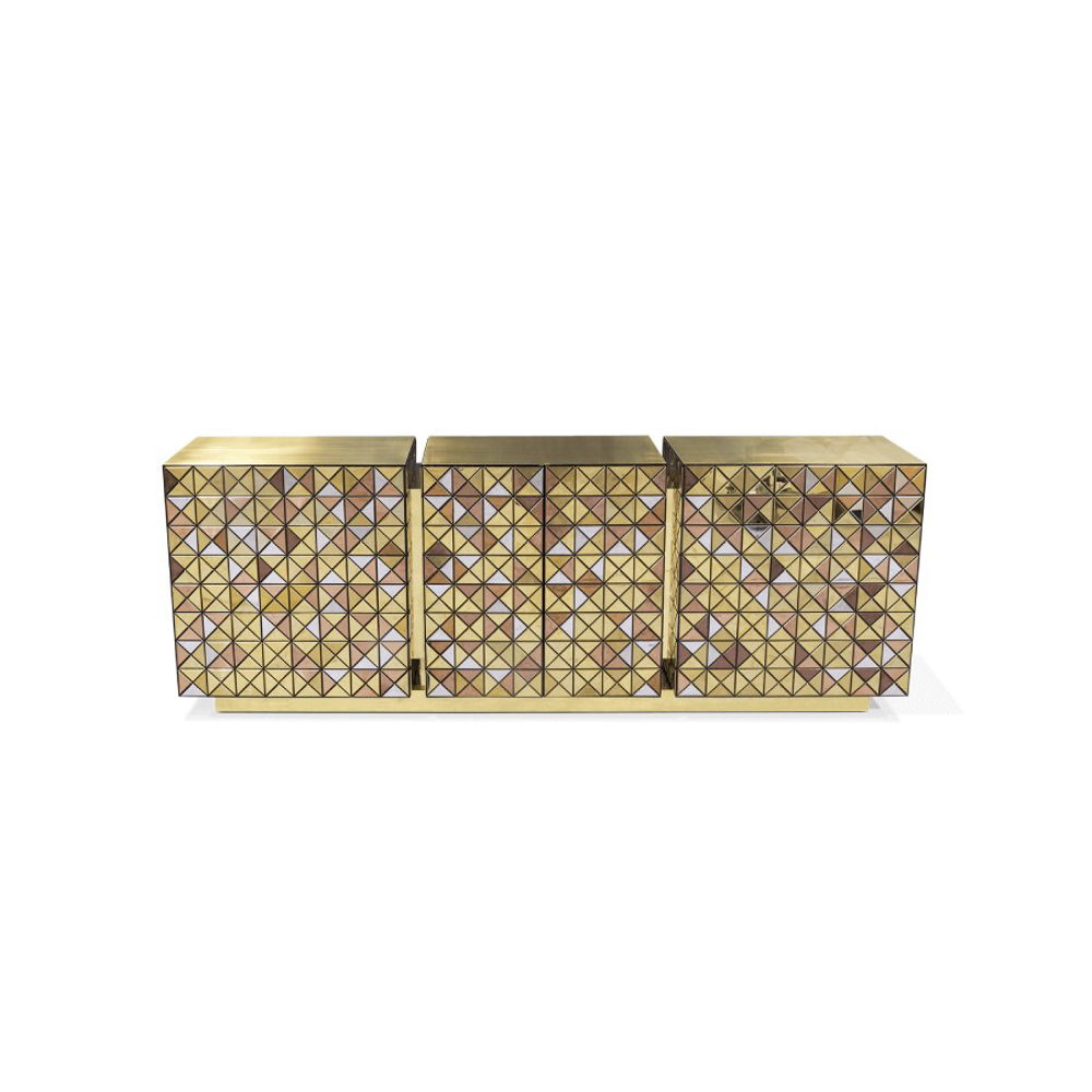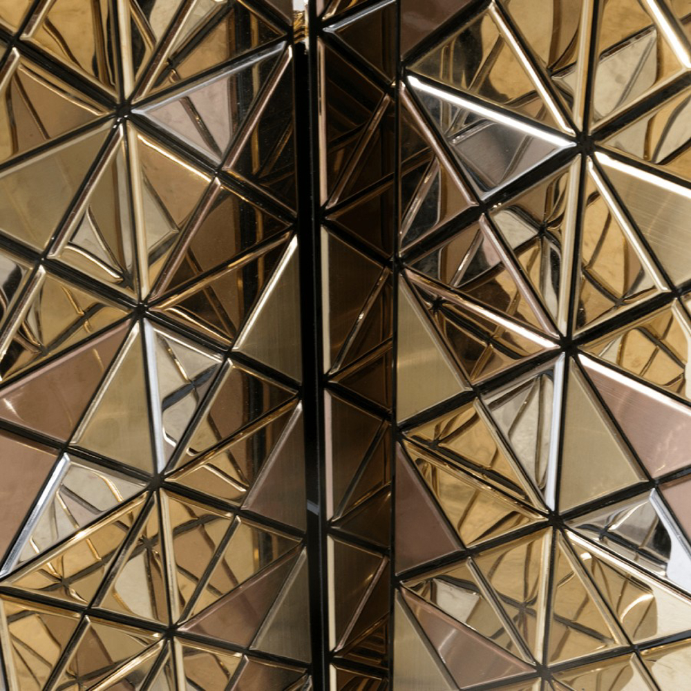Double-sided sideboard with three doors covered by triangles made from anodized aluminum. Different tones of stainless steel in gold, copper and silver; with brushed and polished finishes.
