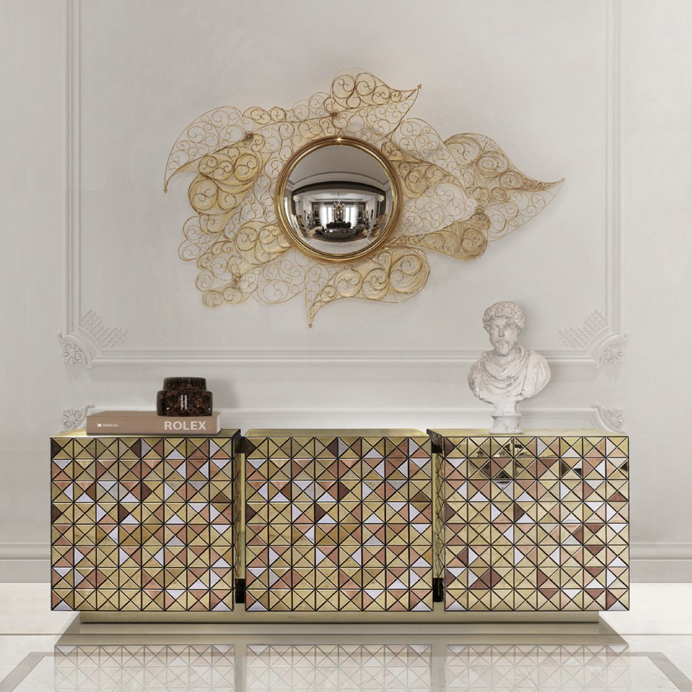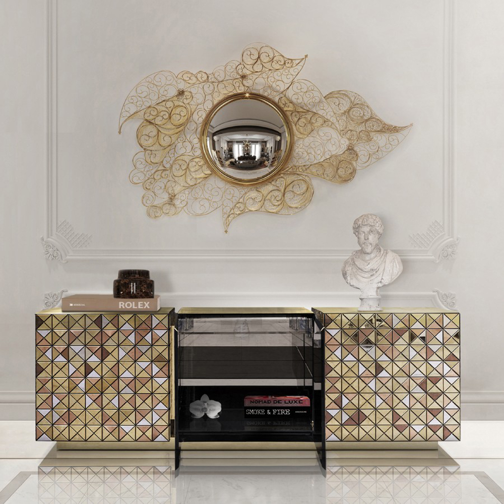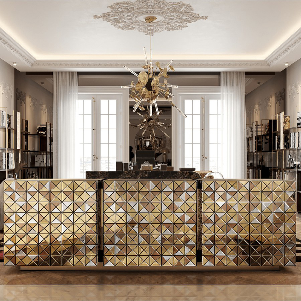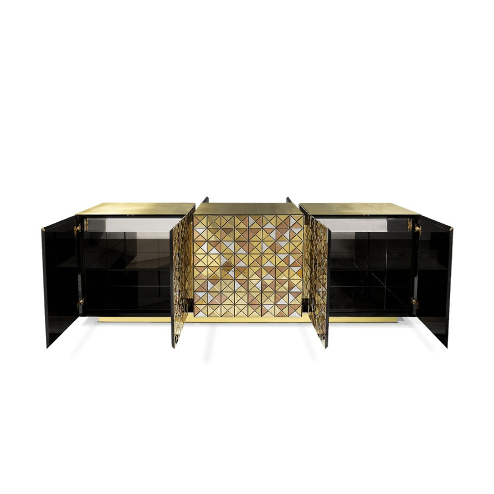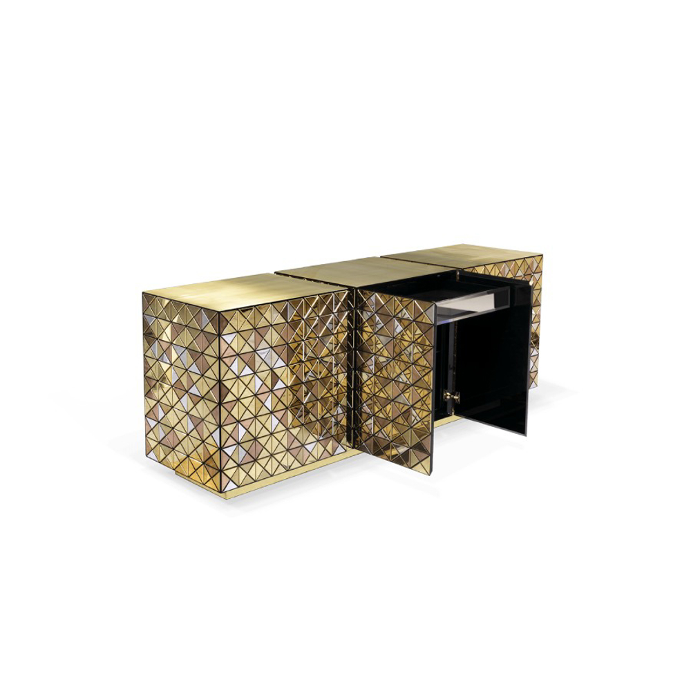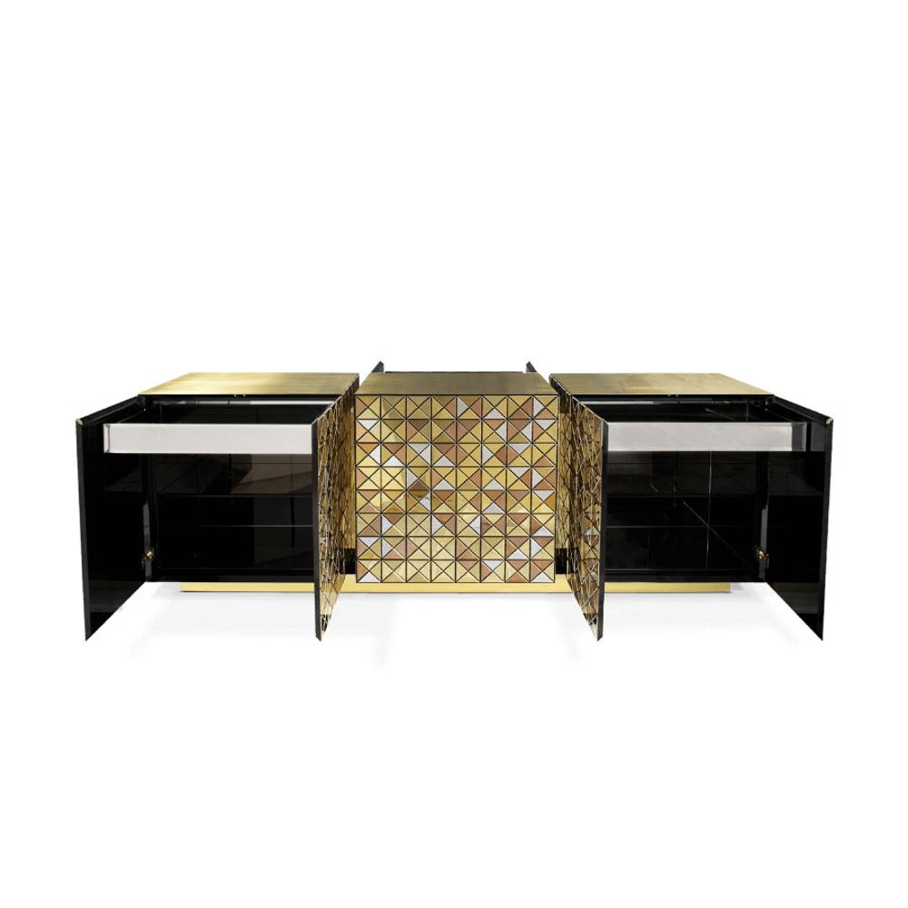 Double-sided sideboard with three doors covered by triangles made from anodized aluminum. Different tones of stainless steel in gold, copper and silver; with brushed and polished finishes.