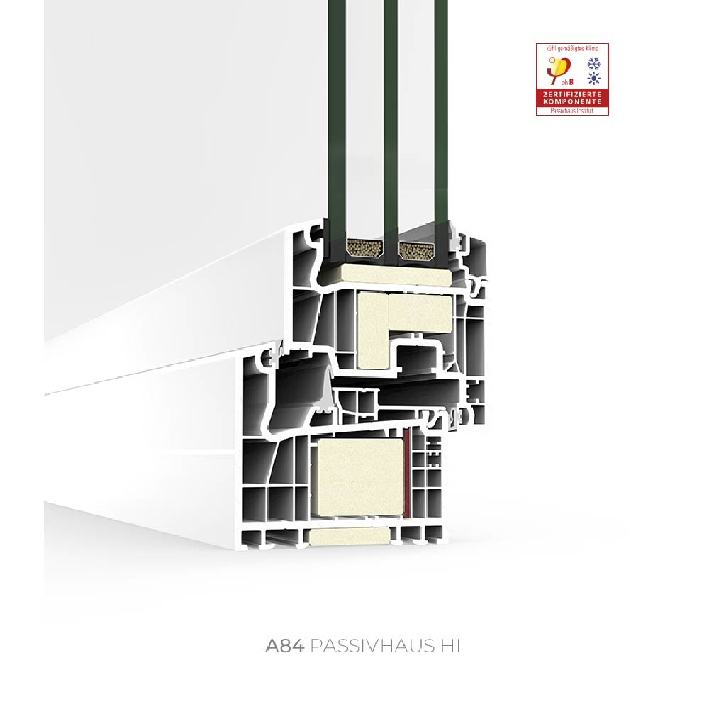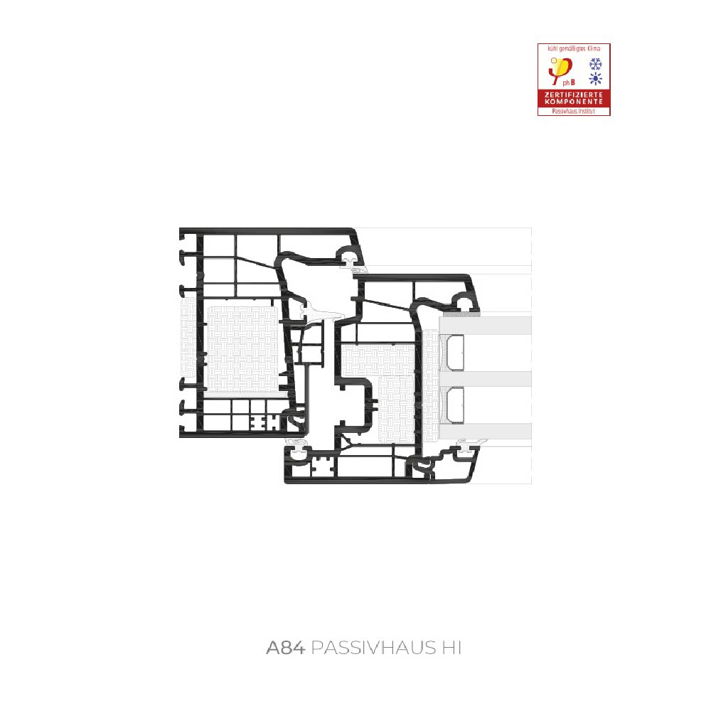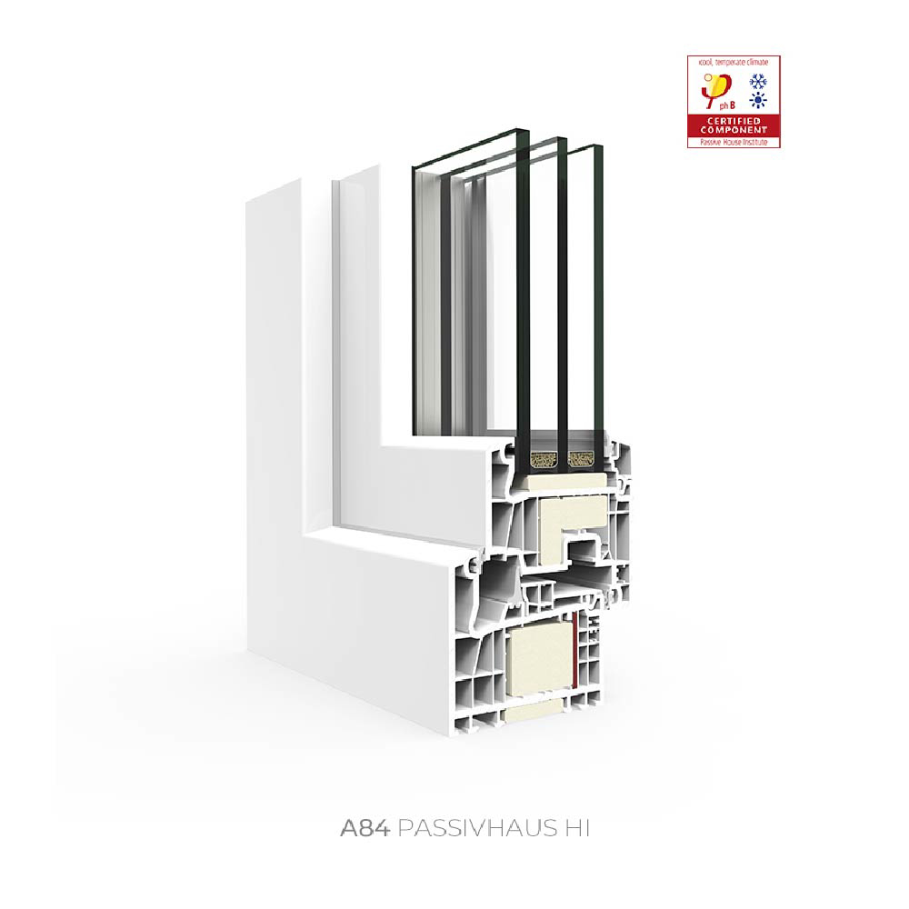 A 84 Passivhaus HI version, with Uf transmittance value of only 0.76 W / m²K, has been developed for cool-temperate category (temperate and cold weather), becoming an ideal solution for buildings with low energy consumption in the vast majority of European territory. The glass itself acts as a structural element of the window, fixed to the profile by a special adhesive tape. In this way, it is possible to improve the transmittance while maintaining the rigidity of the assembly intact.