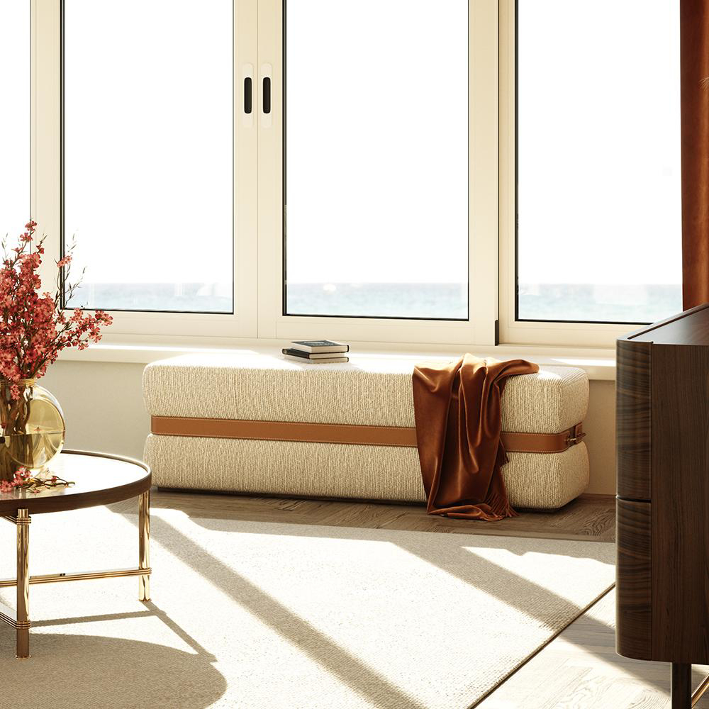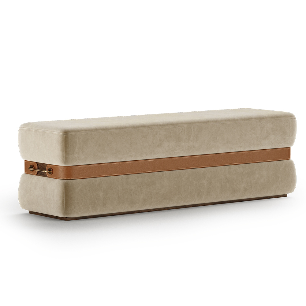 Ray’s retro silhouette and its clean appearance are what stand out the most. The leather belt shaping its lines gives it the necessary bold touch, turning it into the perfect bench to add an elegant touch to the bedroom.