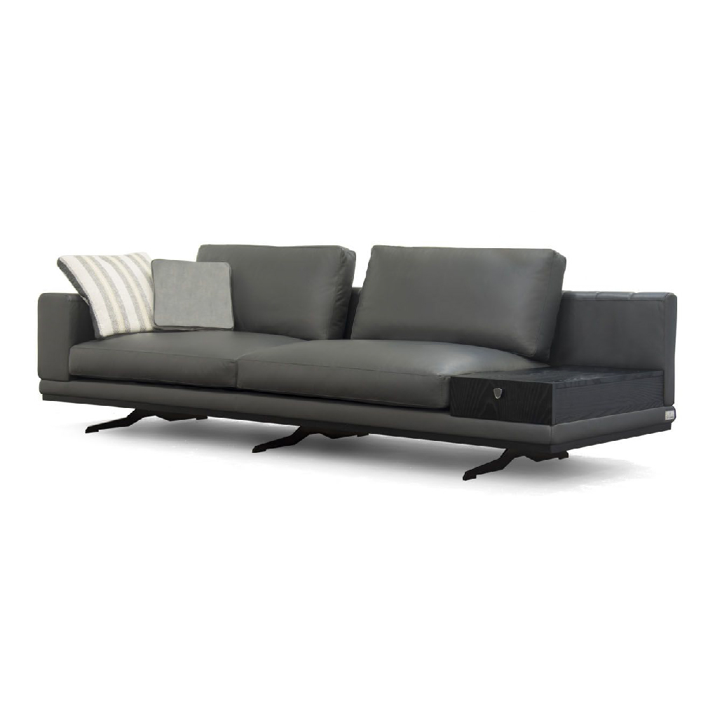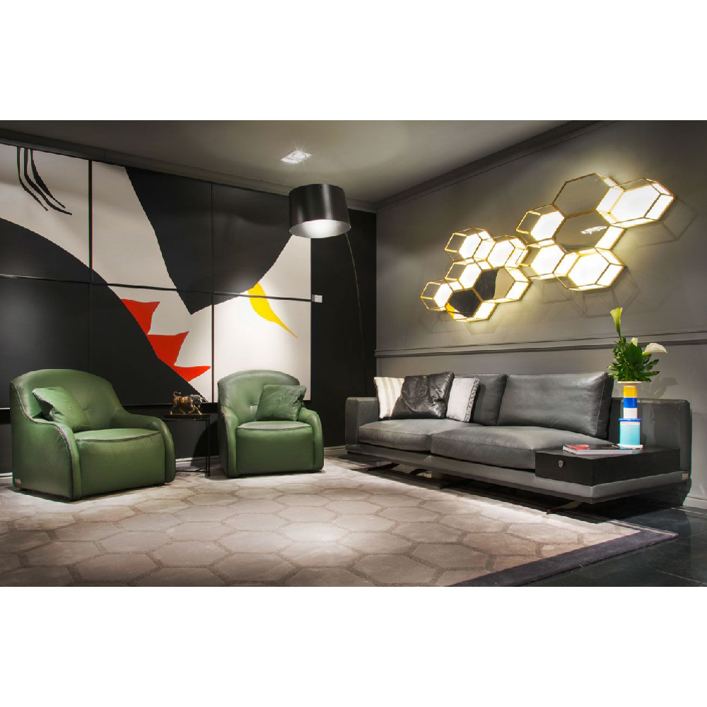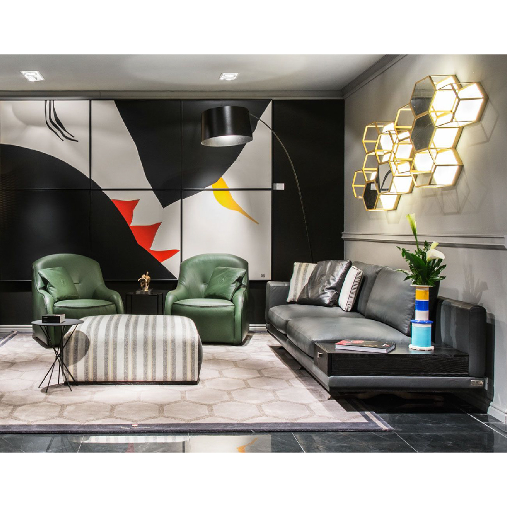 Light Gold, both of the boxes have caps in leather art. Cuoio col. Kestral Tan with “perforated” decor & metal shield knob in Pale Gold finish; a cushion armrest in leather Kobe col. 6242; a pocket saddle in leather art. Cuoio col. Kestral Tan. All in fabric Tabasco col. Piombo, frame base in leather art. Cuoio col. Kestral Tan, base in solid wood Ash Open Pore Black, metal legs in Black finish. Tray in solid wood Ash Open Pore Black, inside in leather art. Cuoio col. Kestral Tan with “perforated” decor. Other accessories: one box lacquered col. Nickel Bronze, one box lacquered col. Light Gold, both of the boxes have caps in leather art. Cuoio col. Kestral Tan with “perforated” decor & metal shield knob in Pale Gold finish; a cushion armrest in leather Kobe col. 6242; a pocket saddle in leather art. Cuoio col. Kestral Tan.