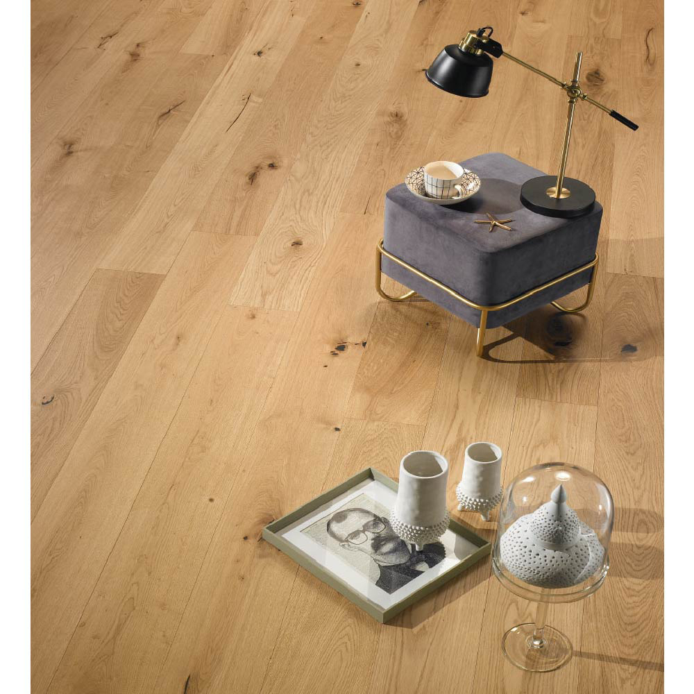 The naturalness of the unique choice is combined with the plus of Original Parquet's SEVEN+ technology, giving life to a 100% Made in Italy collection with excellent technical performance. The product is constructed in two layers, 0.16”of noble oak and a birch plywood to perfectly balance the movements of the natural wood.