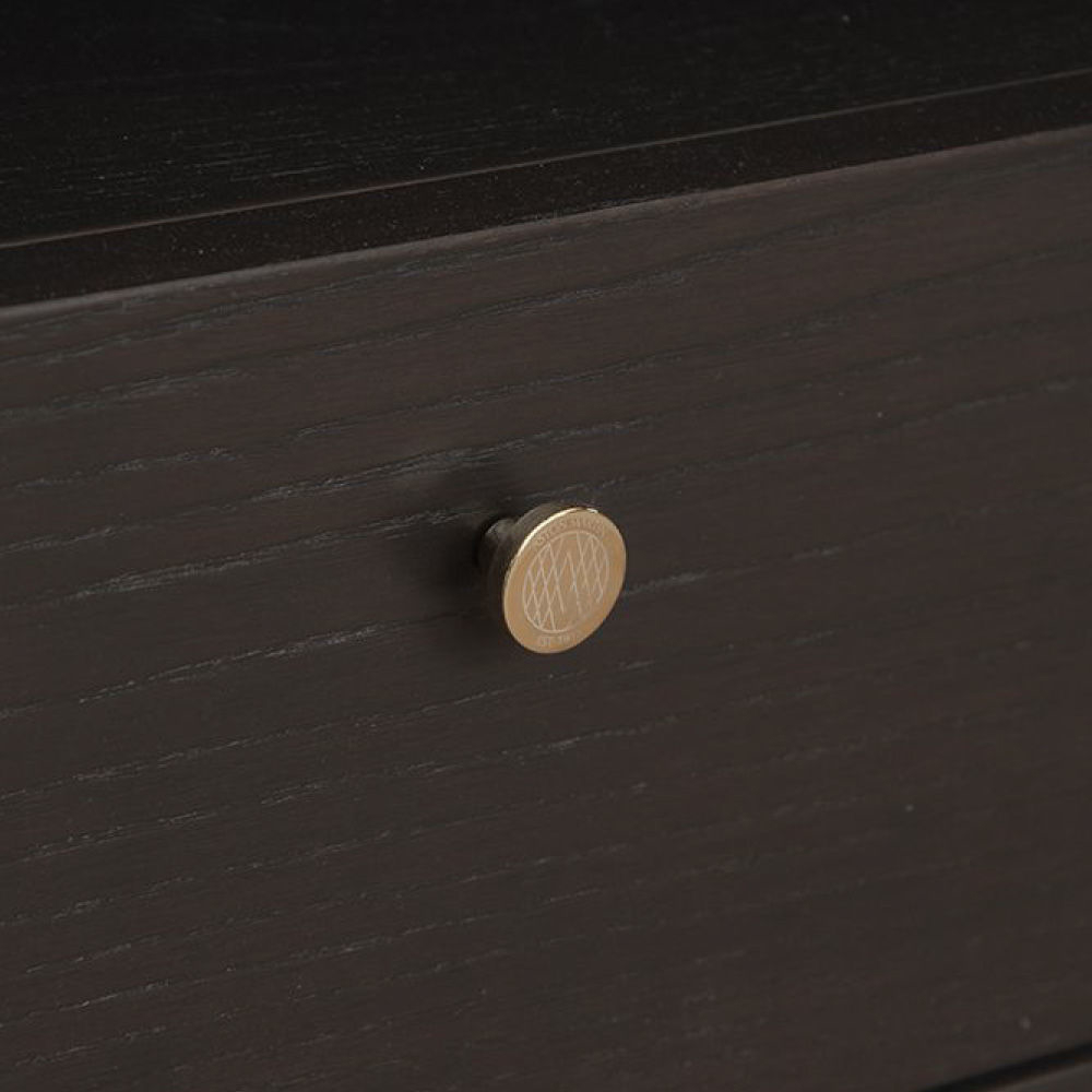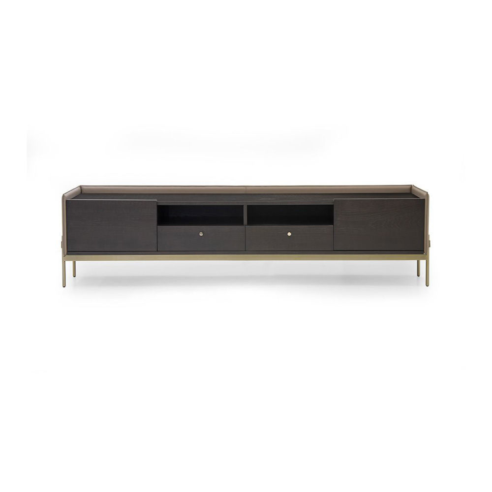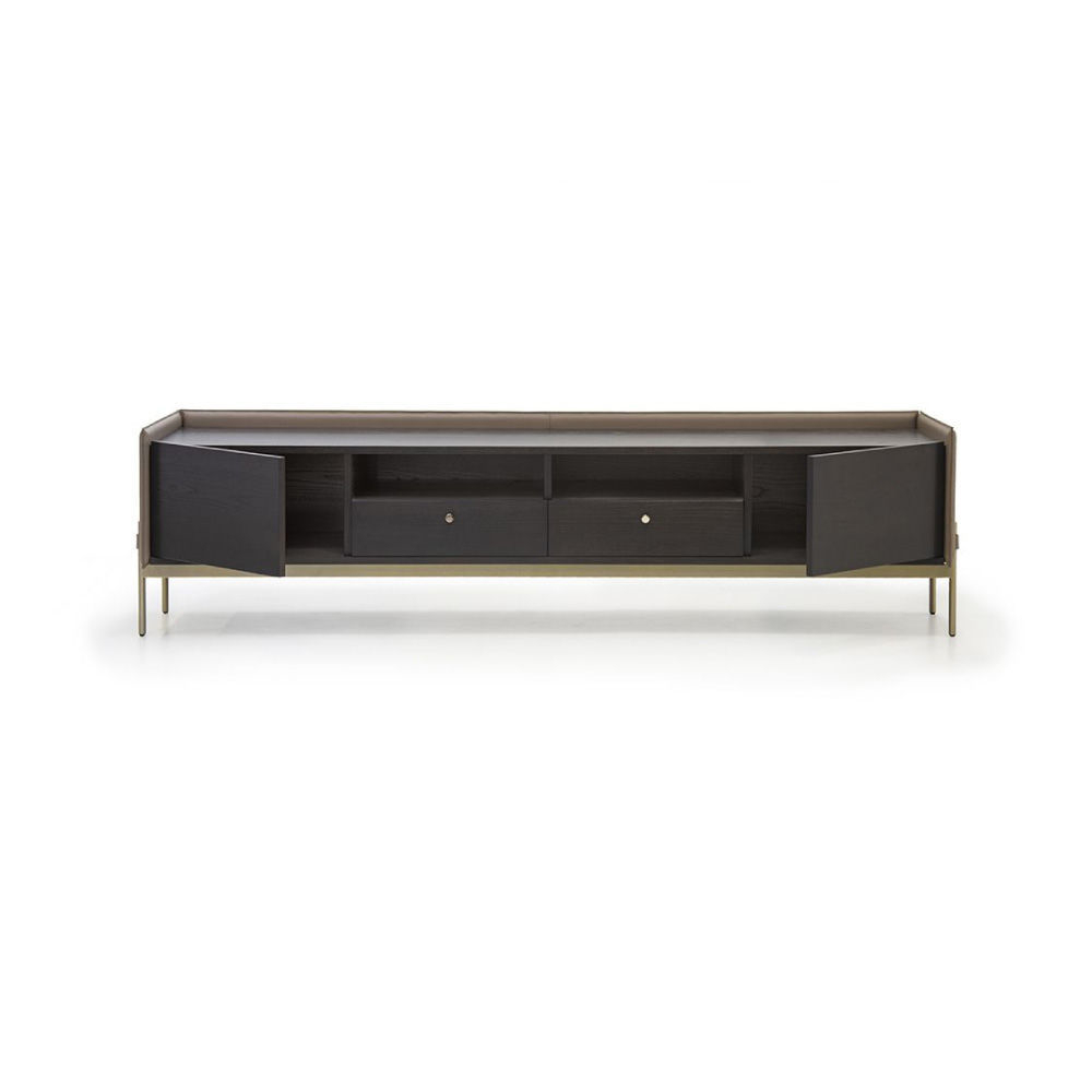 Top and fronts of drawers and doors in Ash Stained Moka veneer, structure & flaps in Cuoio leather col. Taupe, metal structure & metal handle with AM logo in light gold finish.