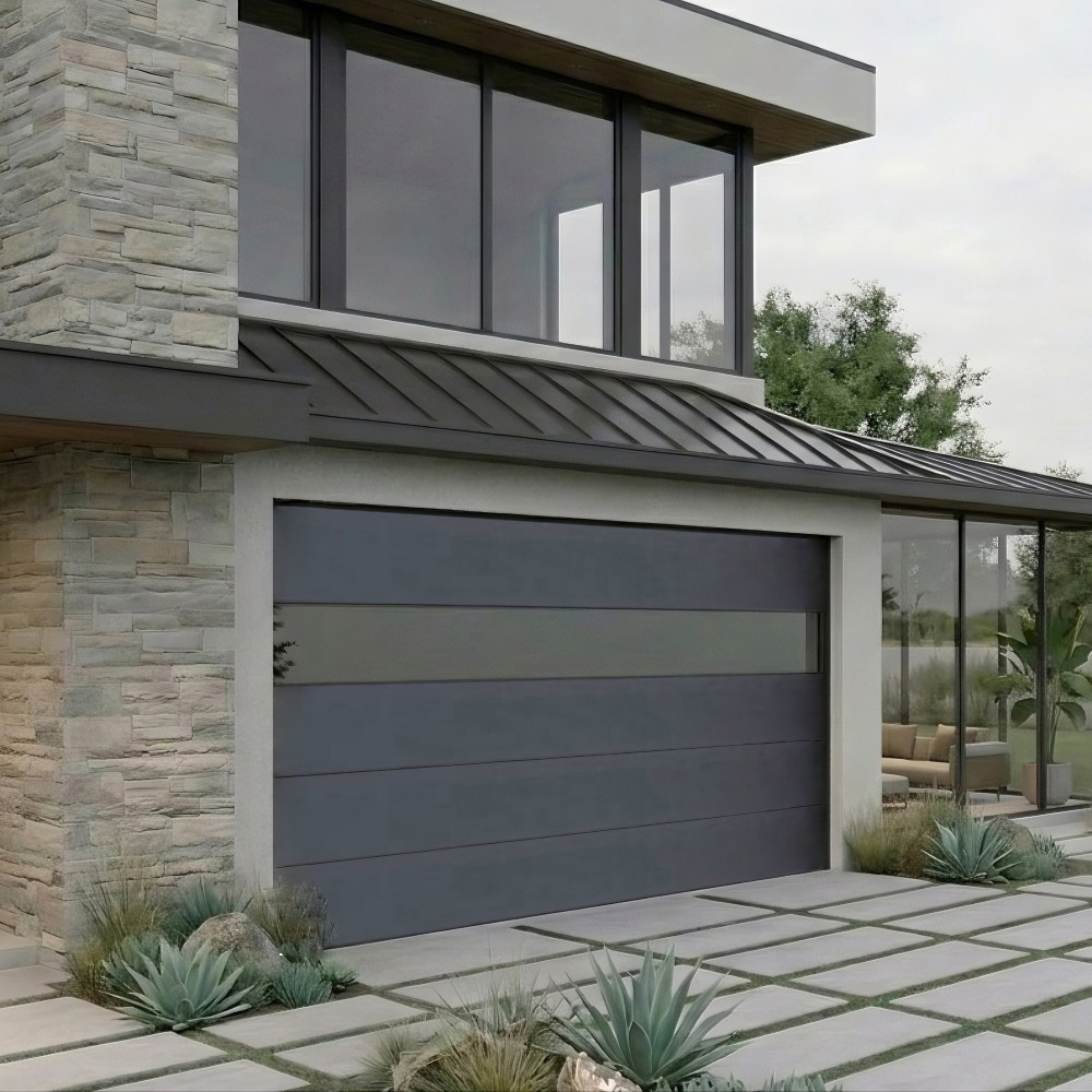 The infinity horizontal glass design creates a sleek, continuous visual line that enhances the modern appearance of the door while allowing natural light into the garage. The black tempered safety glass is treated with a spot-free nano-coating, offering impact resistance, fingerprint resistance, and easy maintenance. Finished in dark grey, the door provides a refined, contemporary look ideal for homes, apartments, villas, and other modern architectural projects.