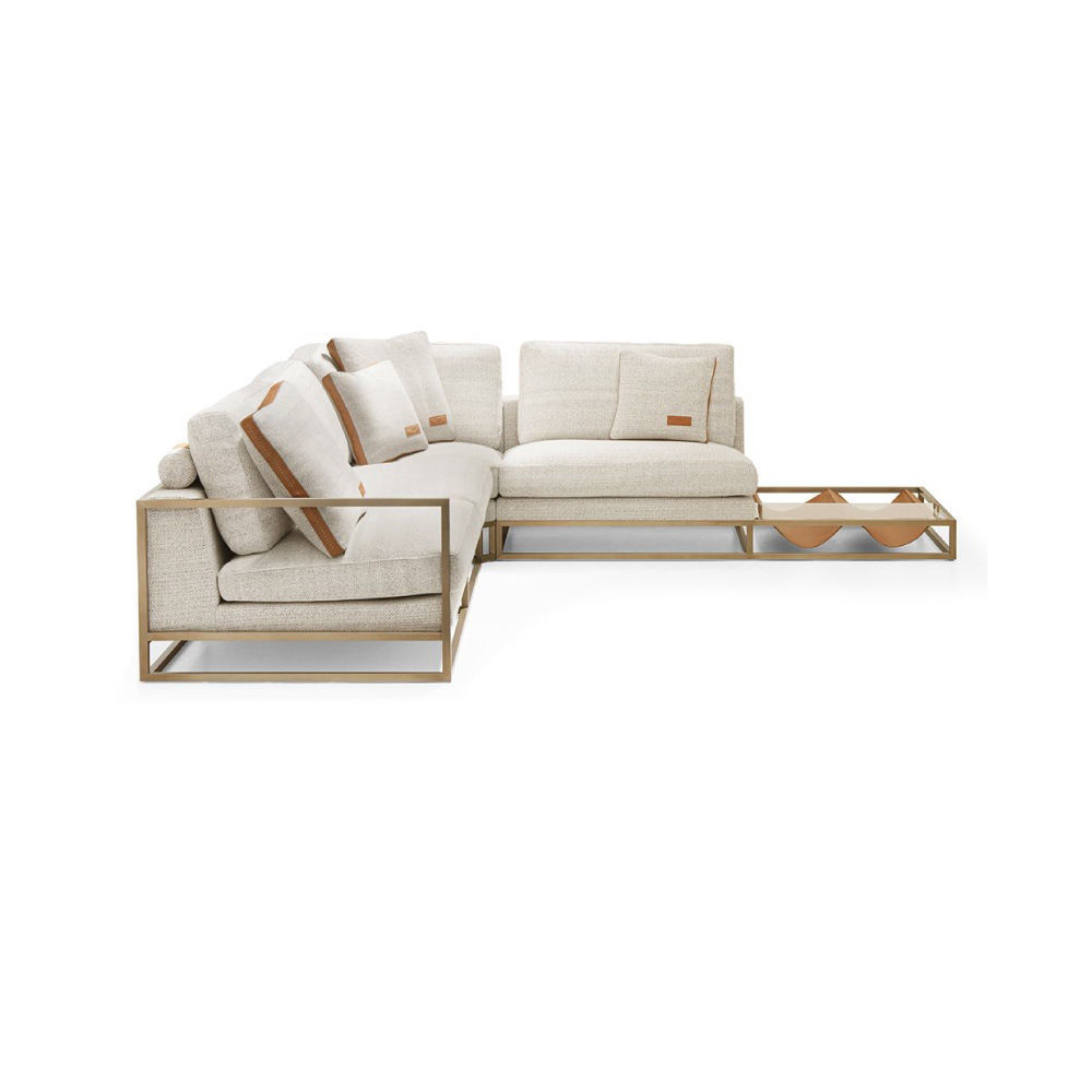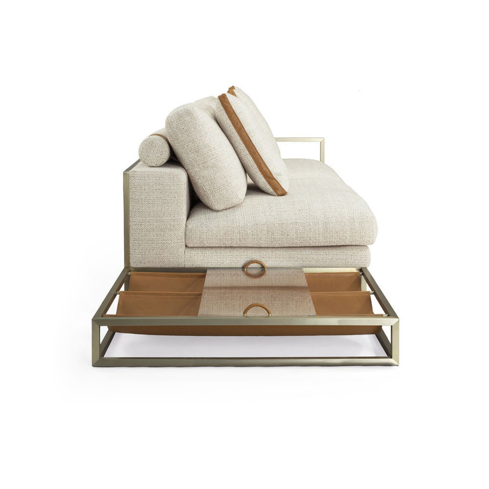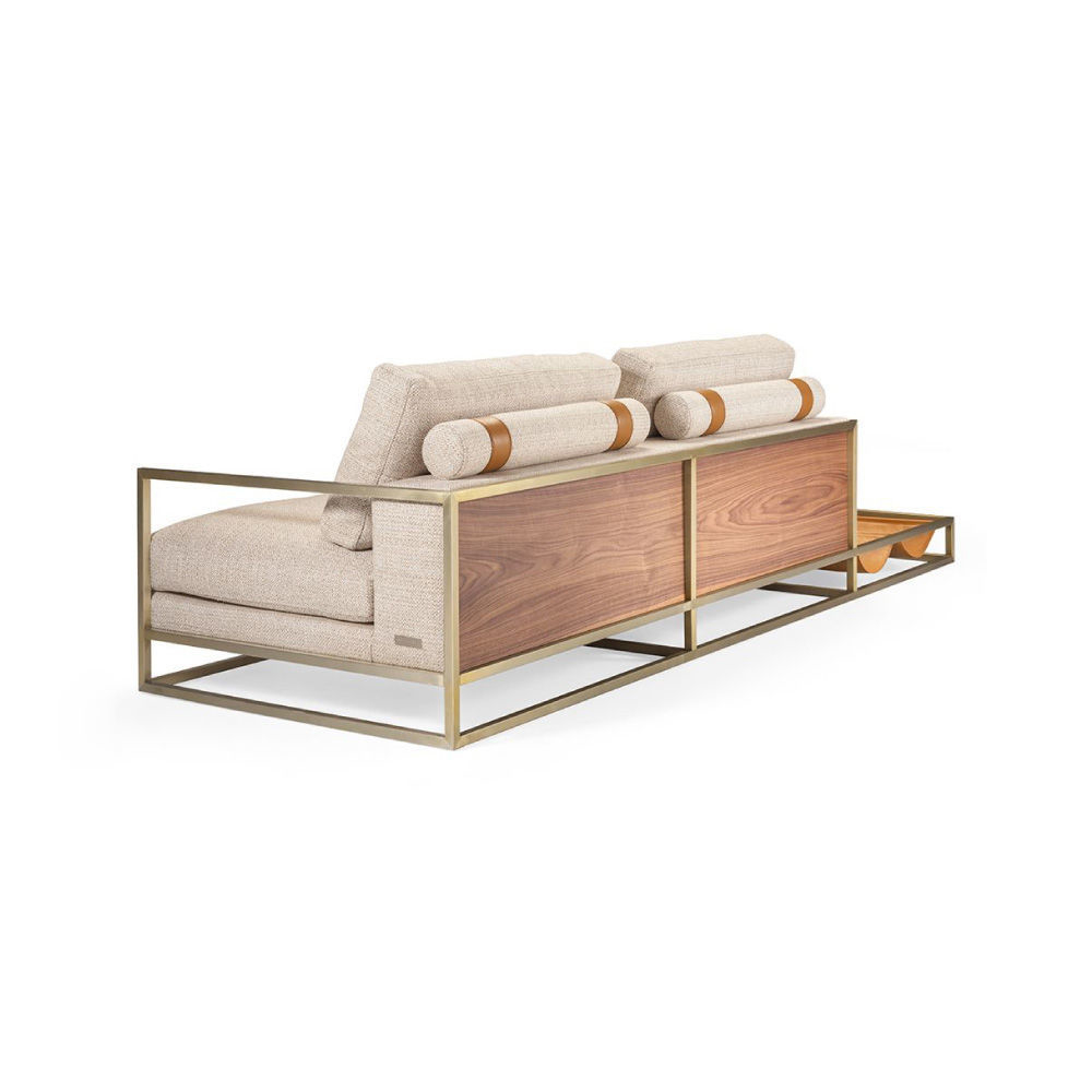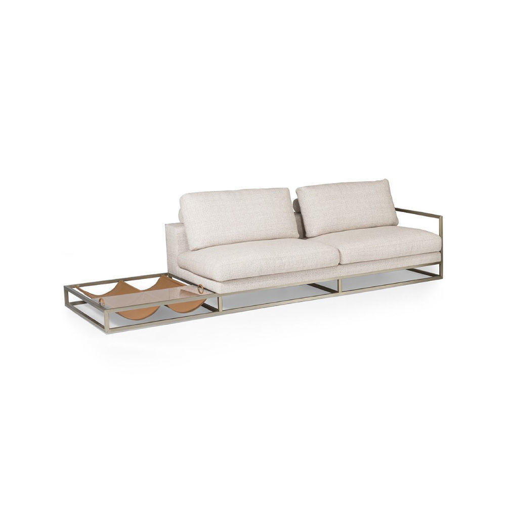 With right looking arm and magazine rack, seat and backrest in fabric Spiga col. 1, tone on tone stitching, roll cushions in fabric as above with leather Daino col. Whiskey inserts, structure in stainless steel Light Gold satin finish, side magazine rack in leather Daino col. Whiskey, back panels in Canaletto Walnut veneer open pore finish.
