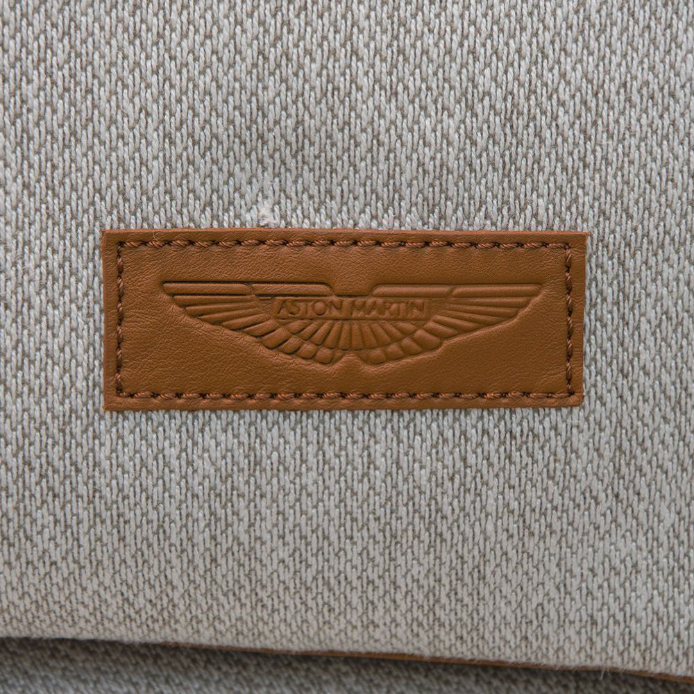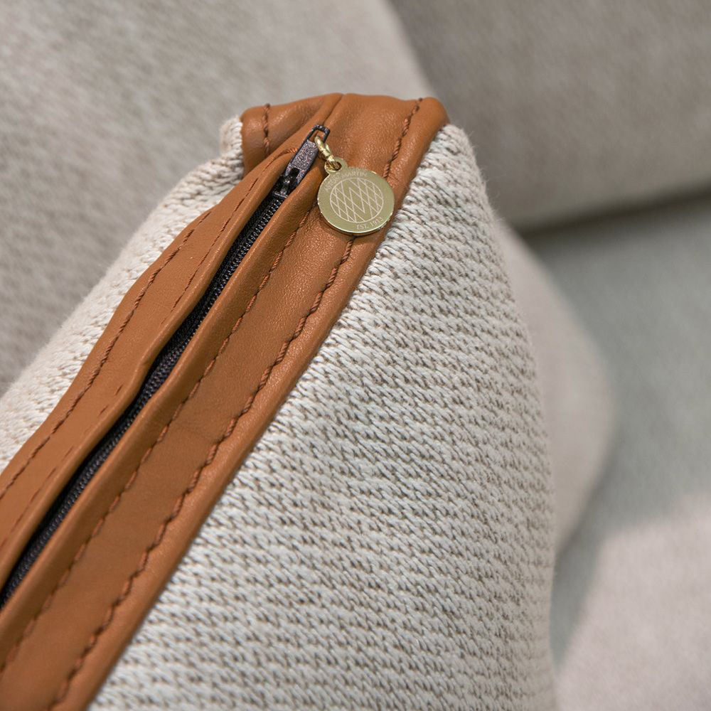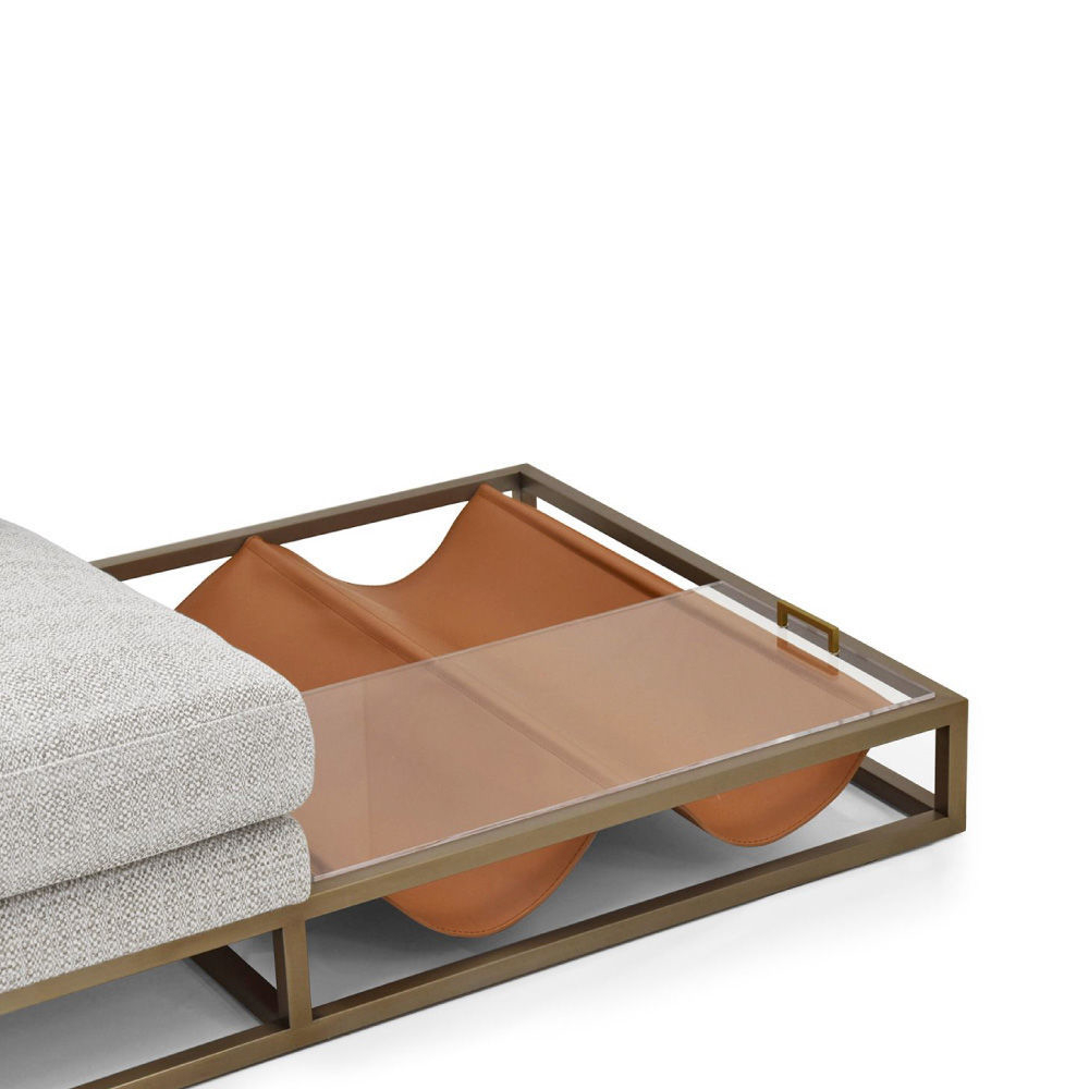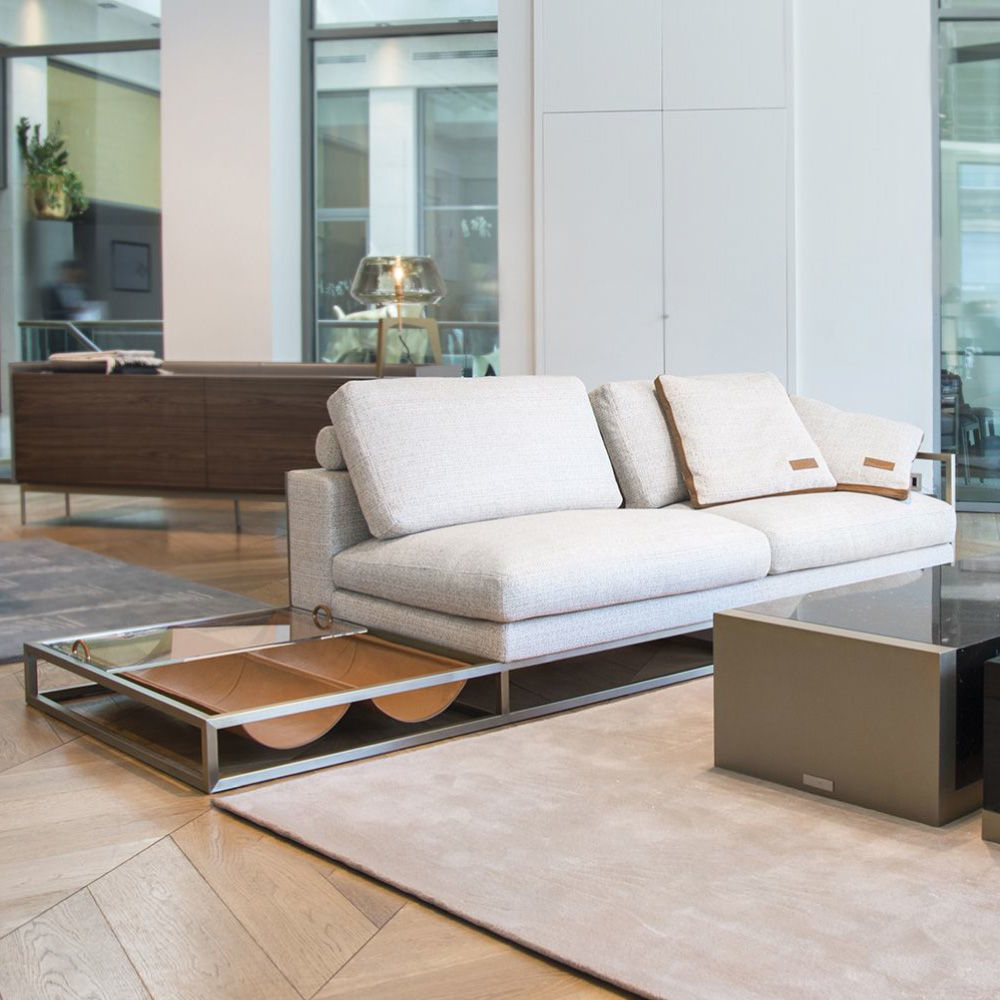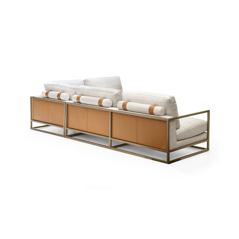 With right looking arm and magazine rack, seat and backrest in fabric Spiga col. 1, tone on tone stitching, roll cushions in fabric as above with leather Daino col. Whiskey inserts, structure in stainless steel Light Gold satin finish, side magazine rack in leather Daino col. Whiskey, back panels in Canaletto Walnut veneer open pore finish.