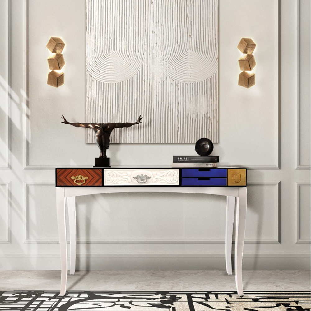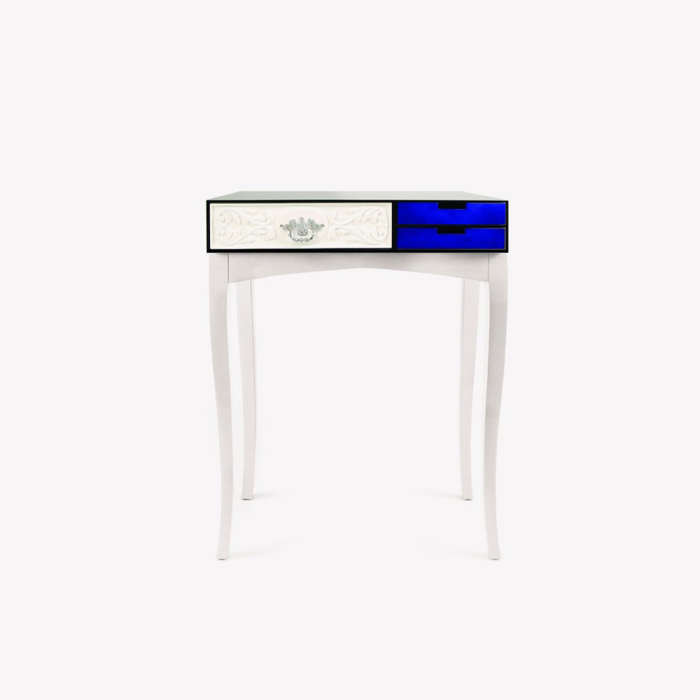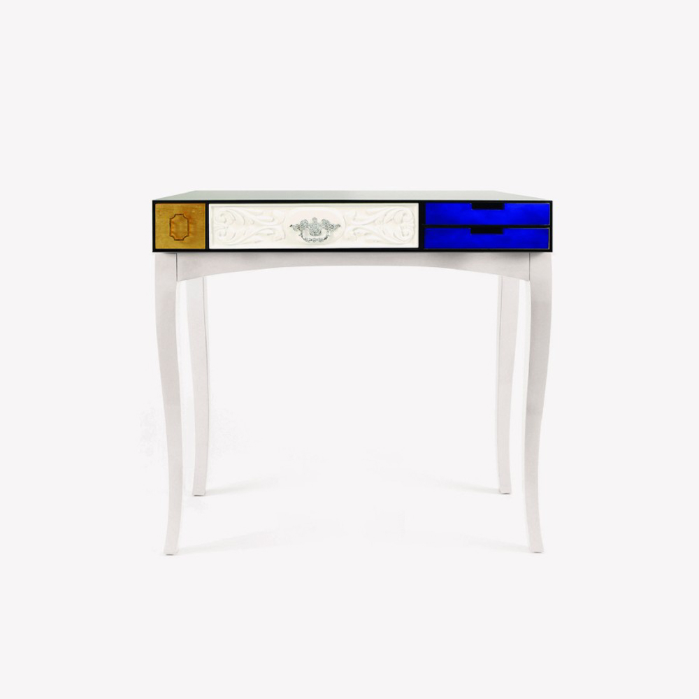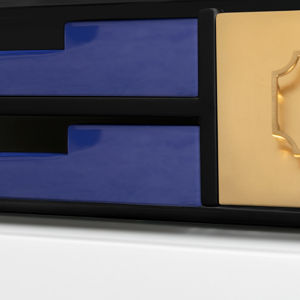 Bronze glass, brass, fabric, rosewood, golden leaf, lacquered glass, crystal.