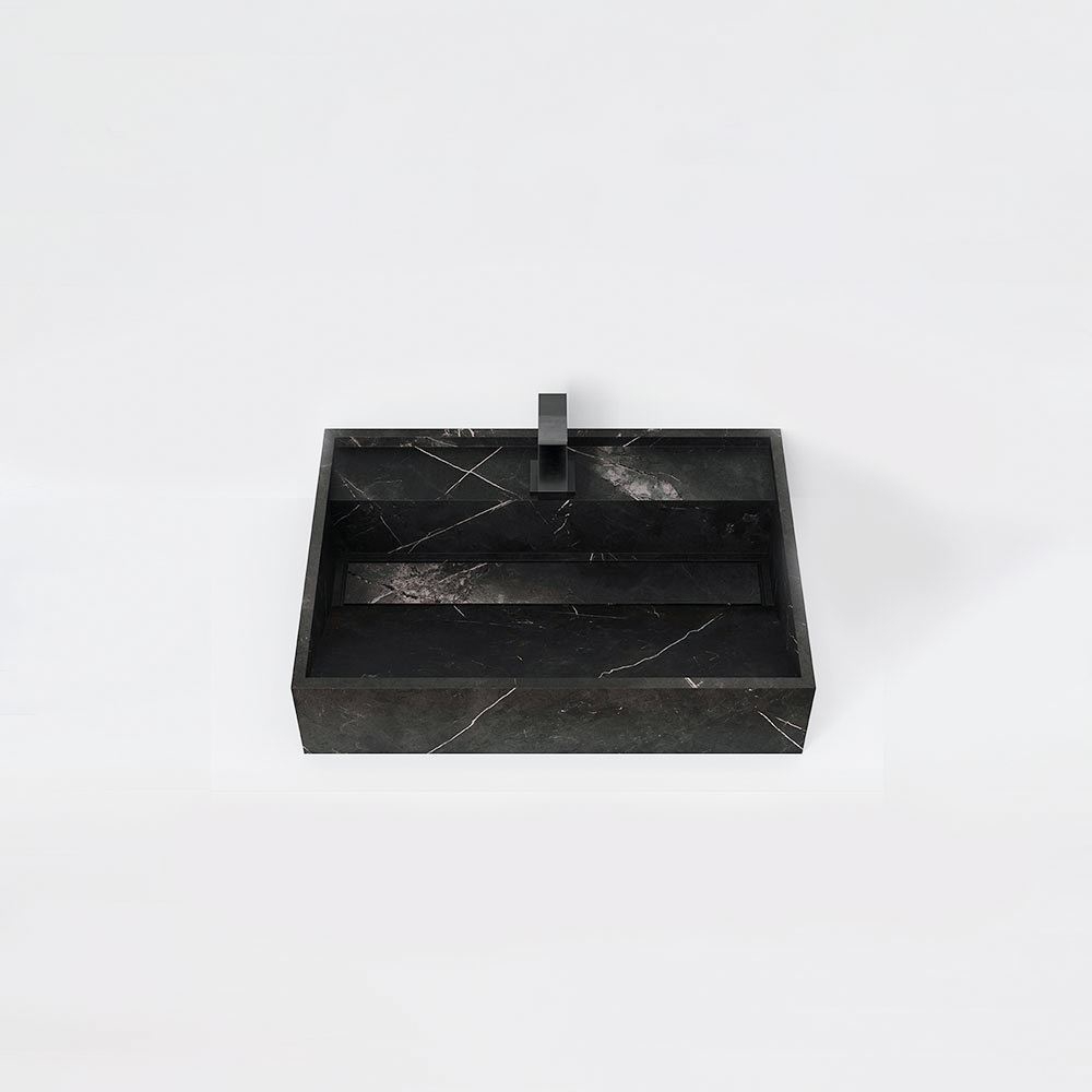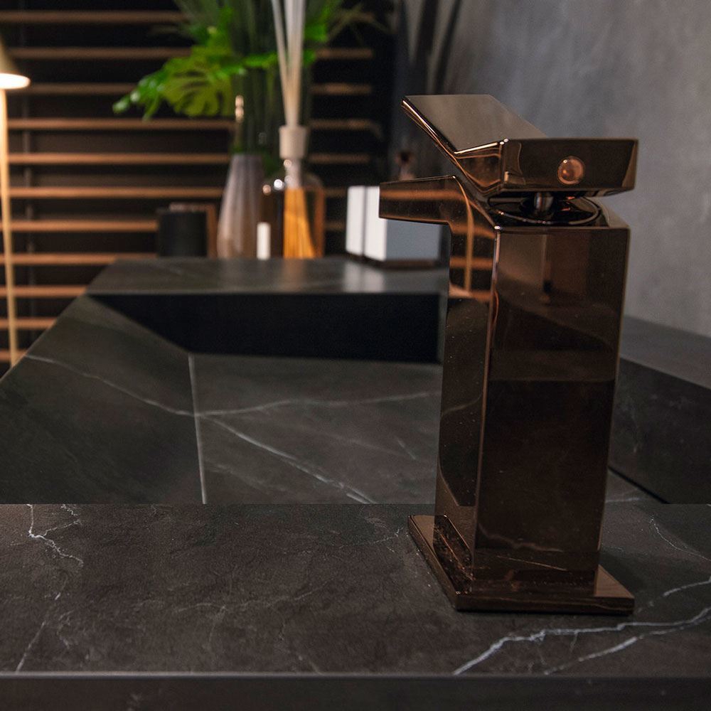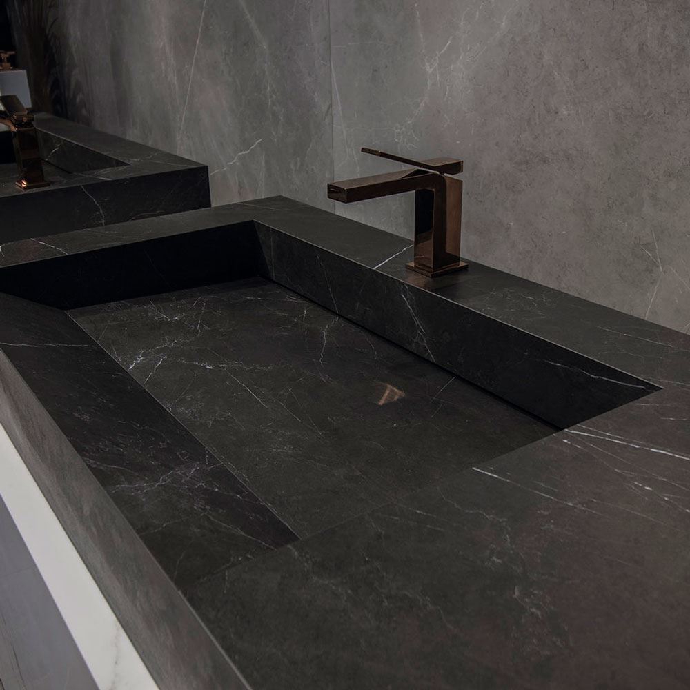 A collection inspired by stone’s strength and beauty, Storm is a revamped classic in black or grey, with fine white veining. Its strong surface evokes the more dynamic side to nature, while also allowing for the creation of restful settings in the case of the grey model, while the black model lends surfaces a bold striking air.