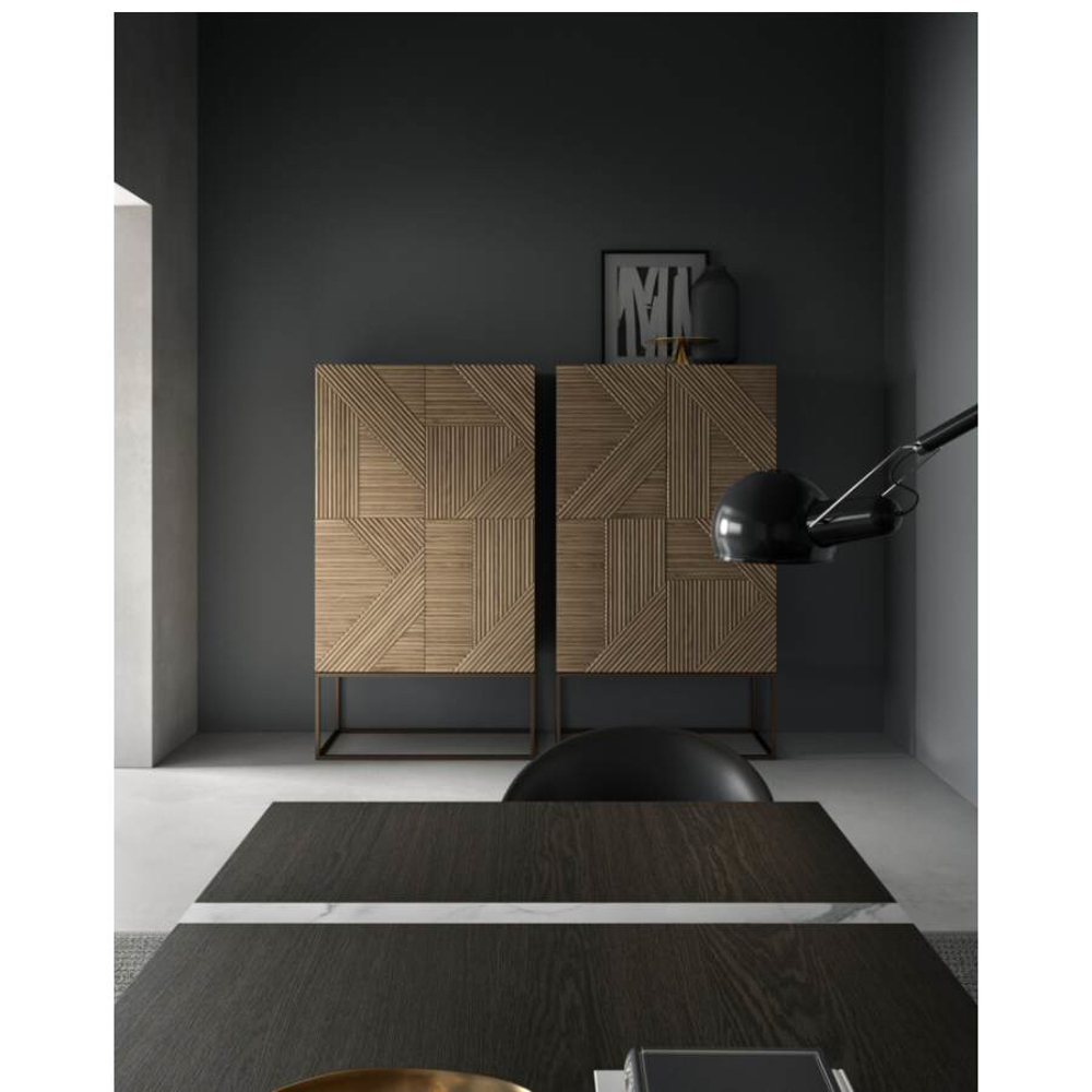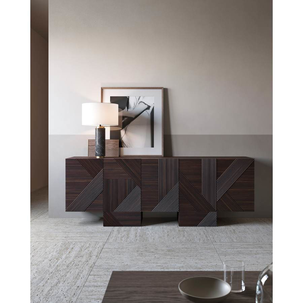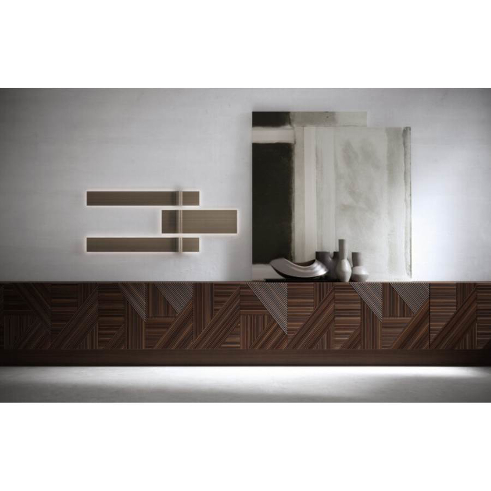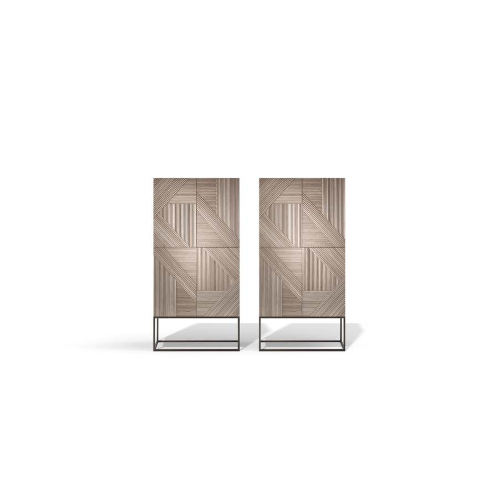 Stripes is a family of cabinets with doors decorated with individually applied solid triangular profiles. The geometries that are created make the Stripes structure precious and the plays of light that cross this succession of lines and crossings give the piece of furniture great strength.