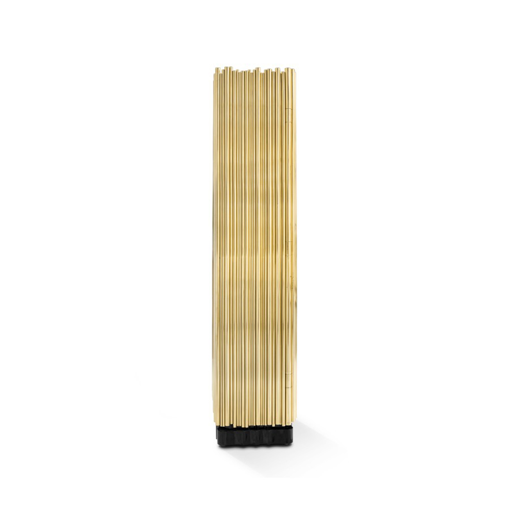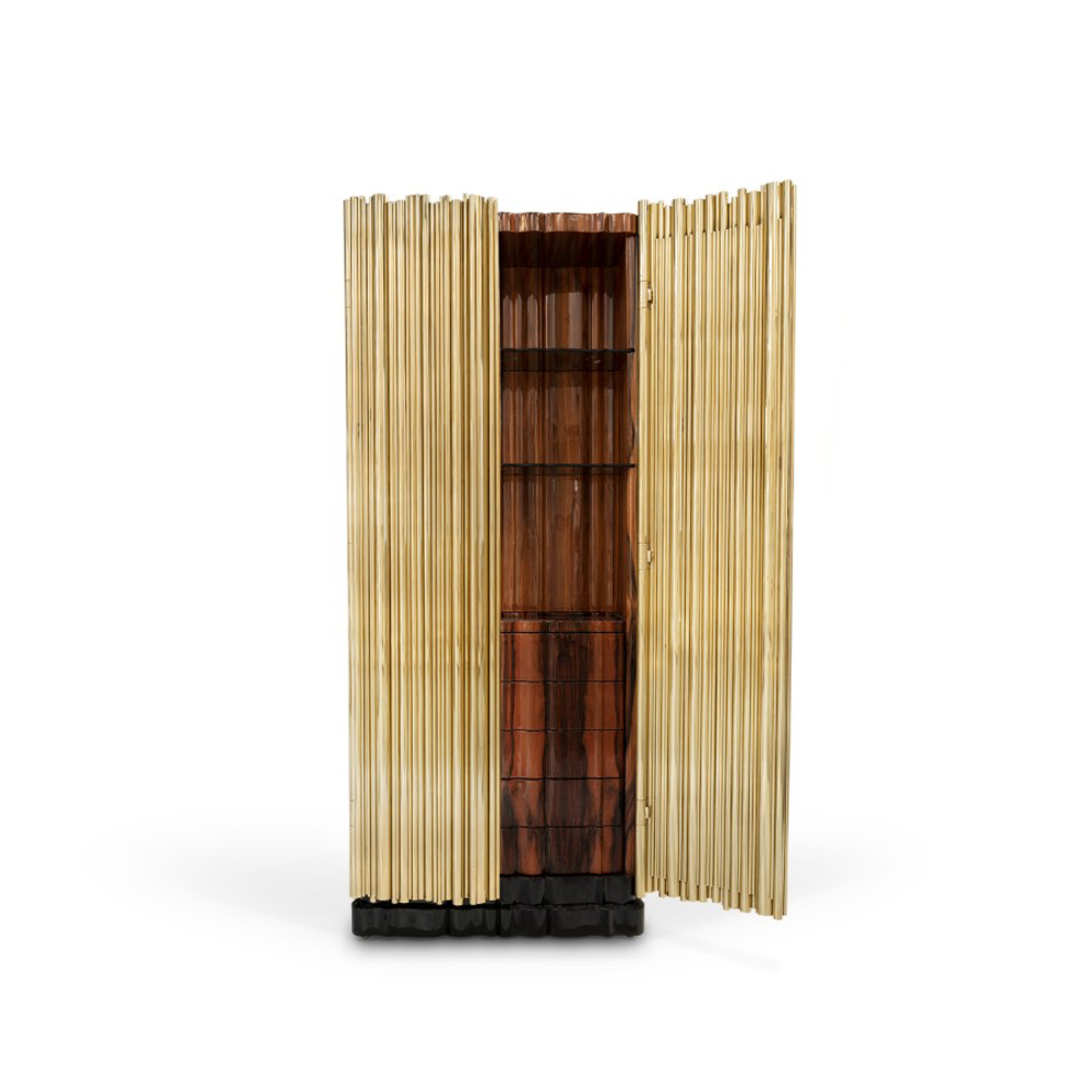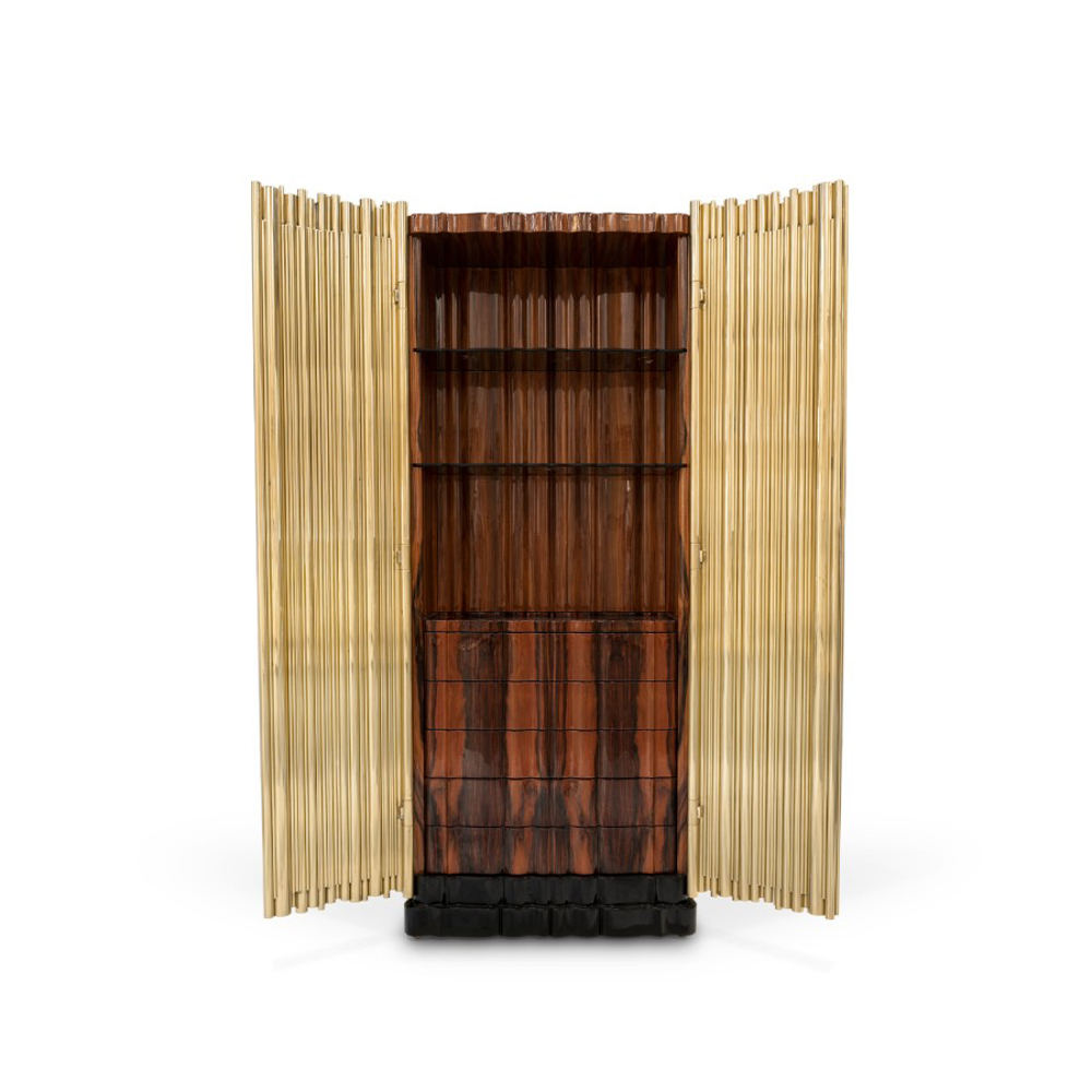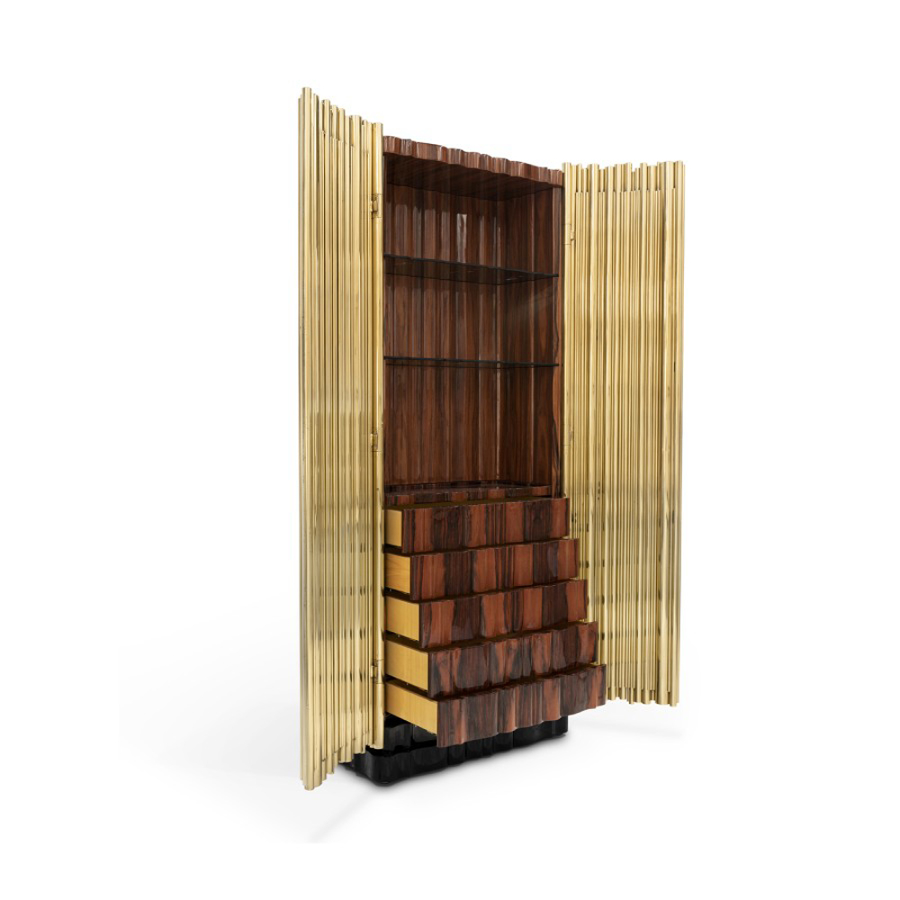Covered by a tubular structure in gold pated brass, the Cabinet's interior is finished in Palisander, with two shelves and a set of drawers also finished in Palisander and gold-leaf.