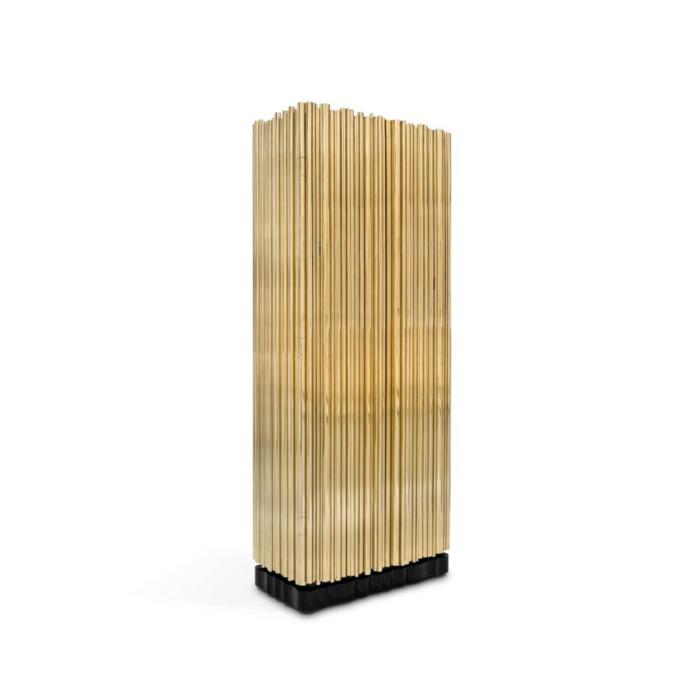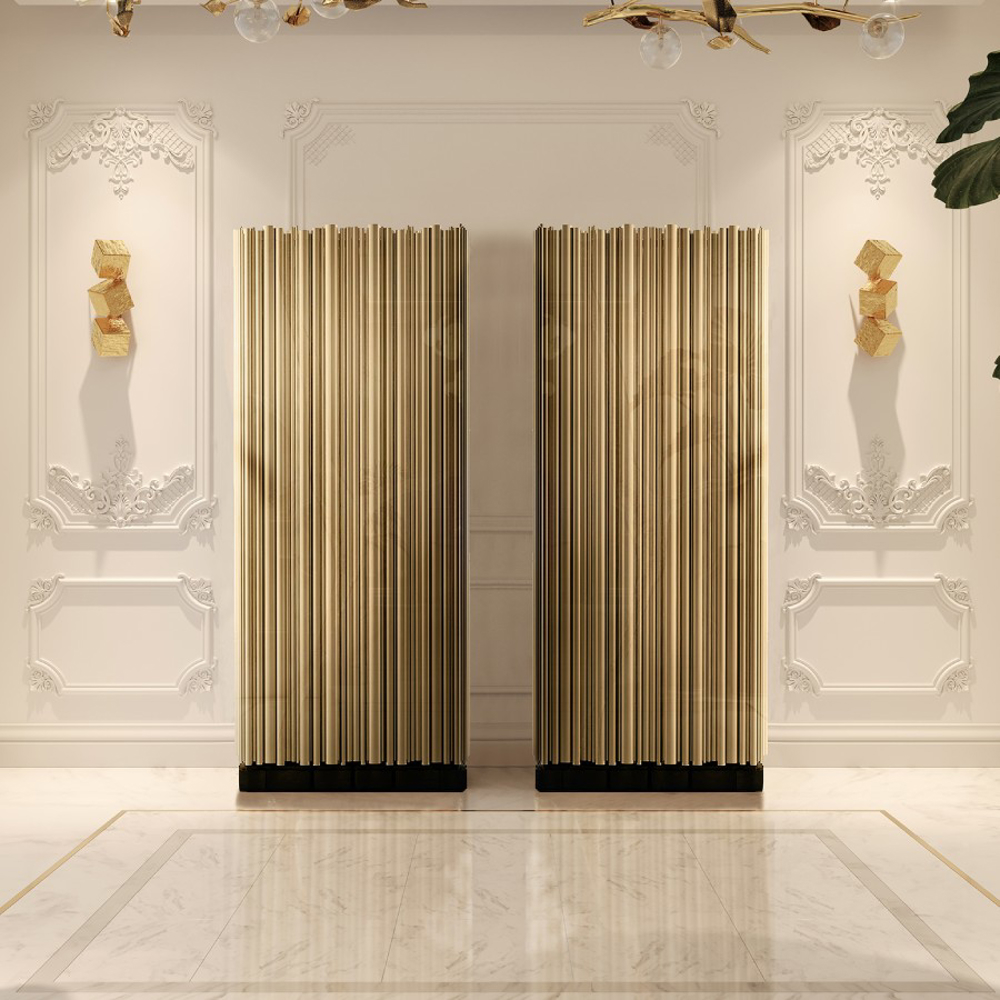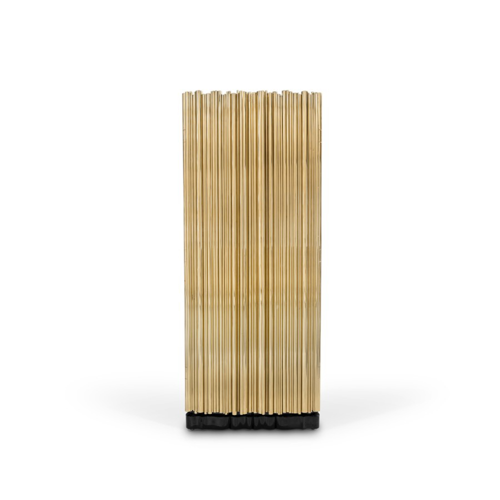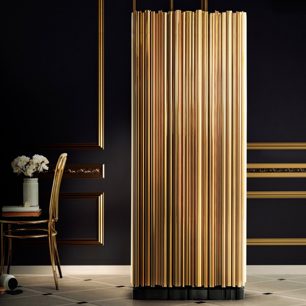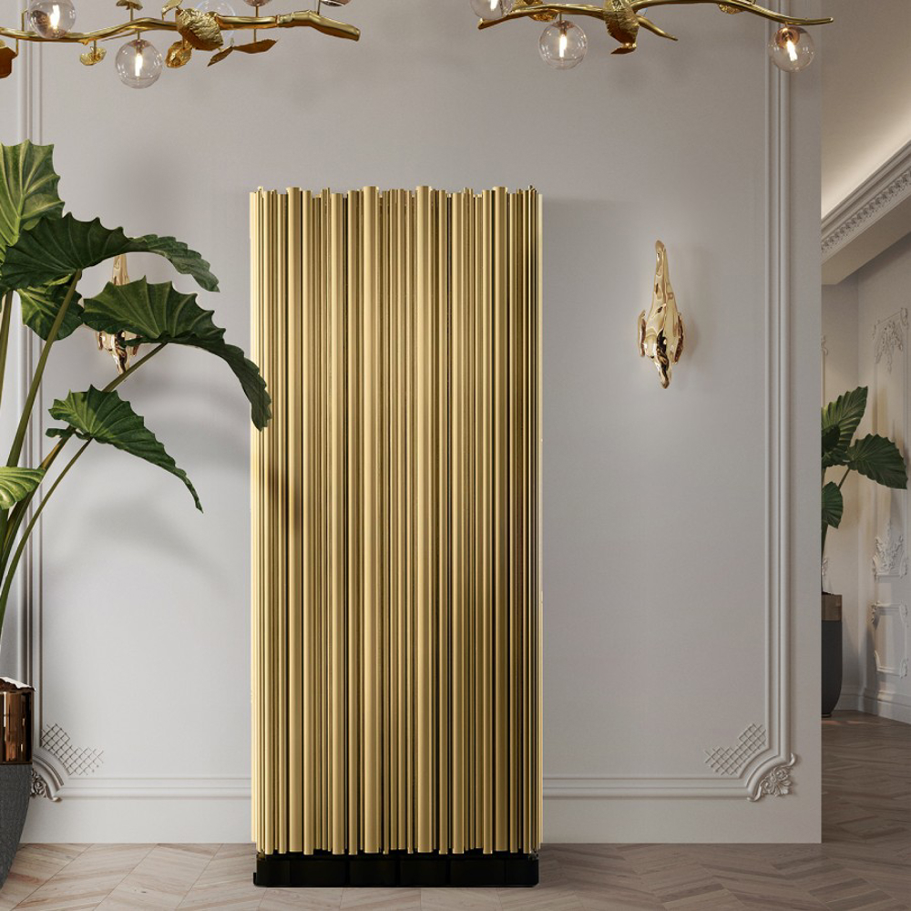 Covered by a tubular structure in gold pated brass, the Cabinet's interior is finished in Palisander, with two shelves and a set of drawers also finished in Palisander and gold-leaf.