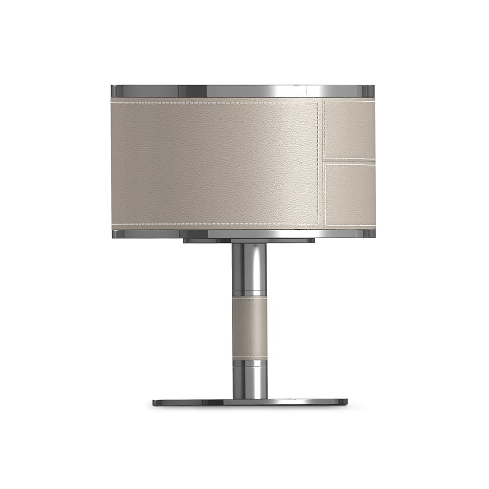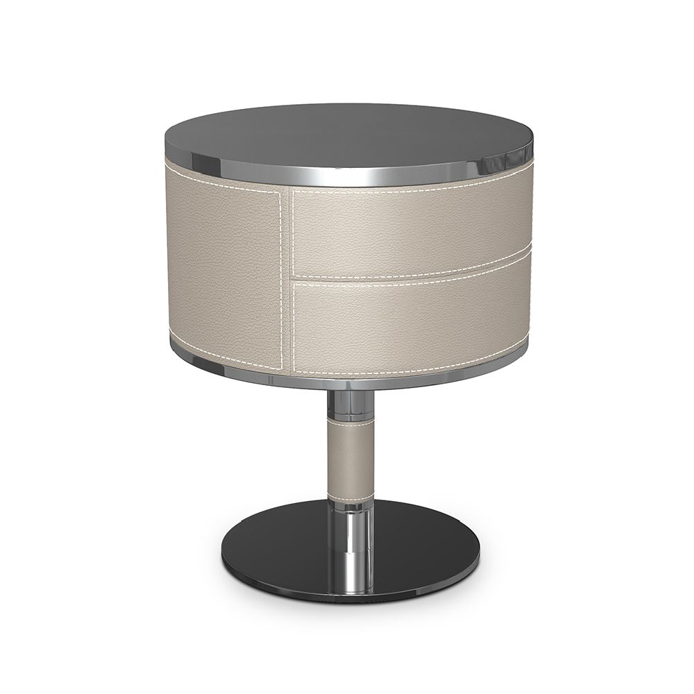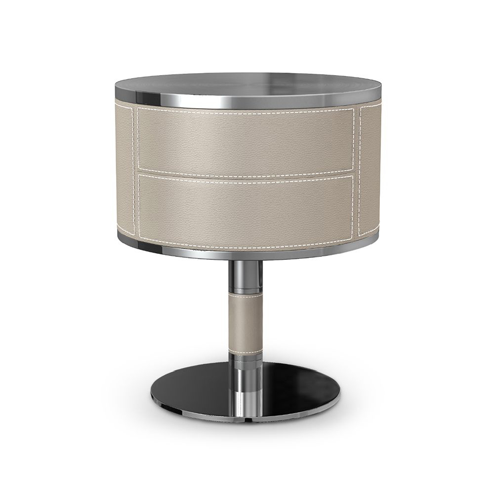 Nightstand, top & pedestral base in metal, case laminated in saddle leather with stitc hing.