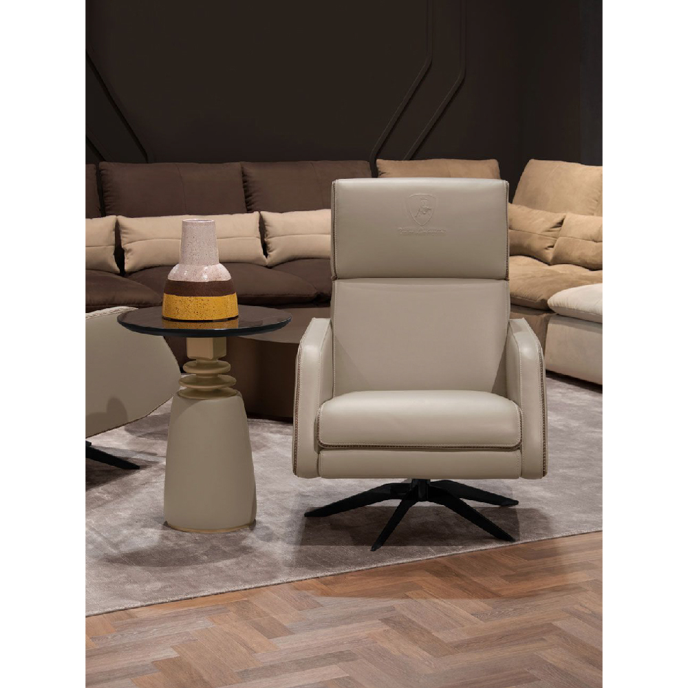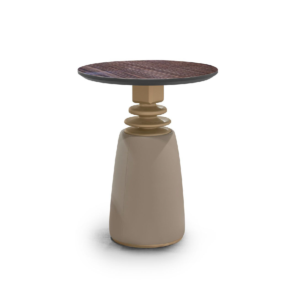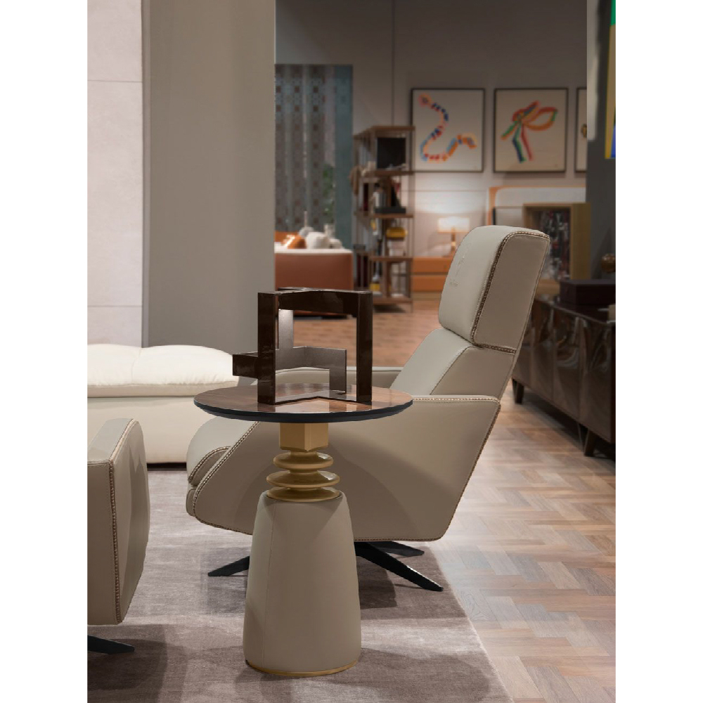 Top in veneer Xilo glossy finish, metal base in Light Gold satin finish upholstered in leather Daino col. Mud.