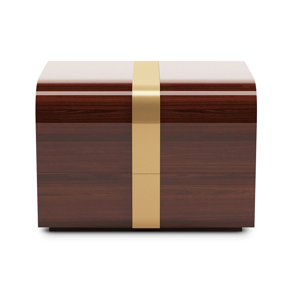 Nightstand, case in veneer glossy finish, drawer handles covered in leather.