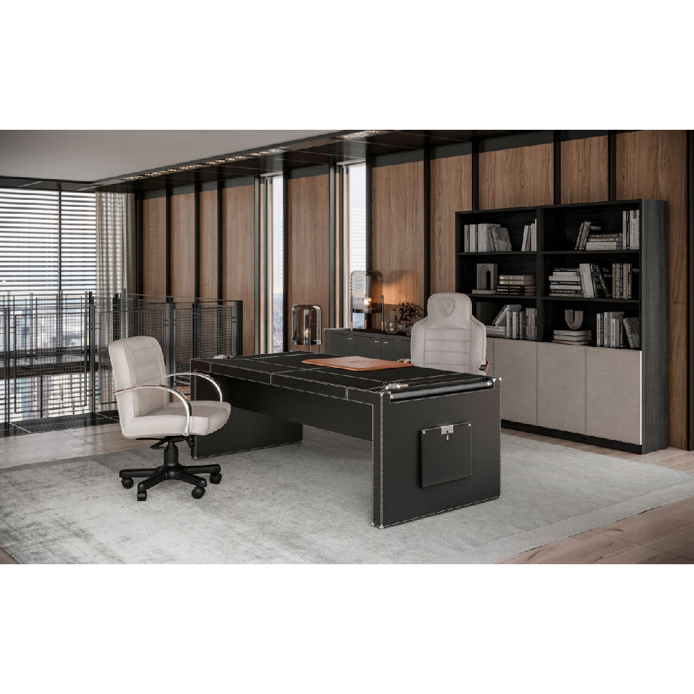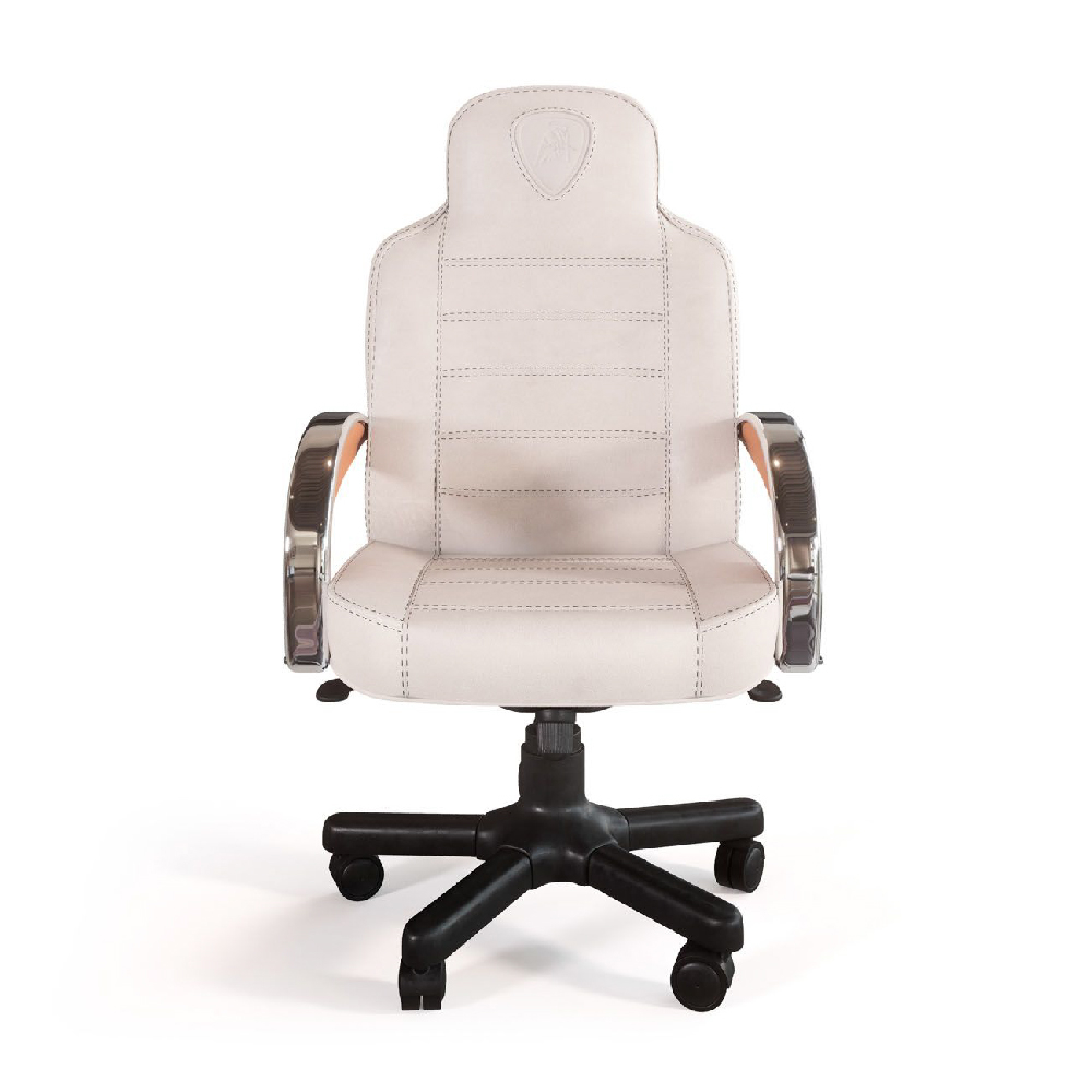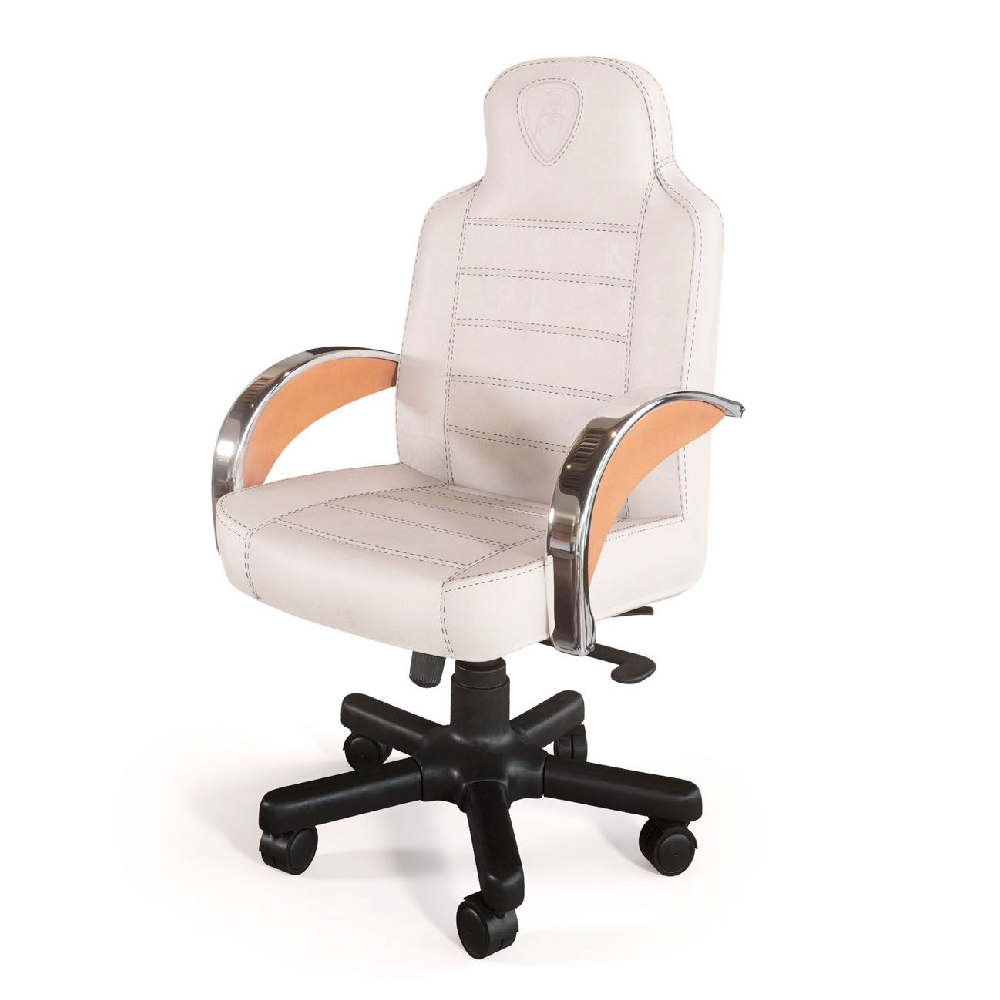 In leather Daino col. Milk, printed TL bull logo on headrest, chrome arms with leather Cuoio details col. Kestral Tan, black lacquered base