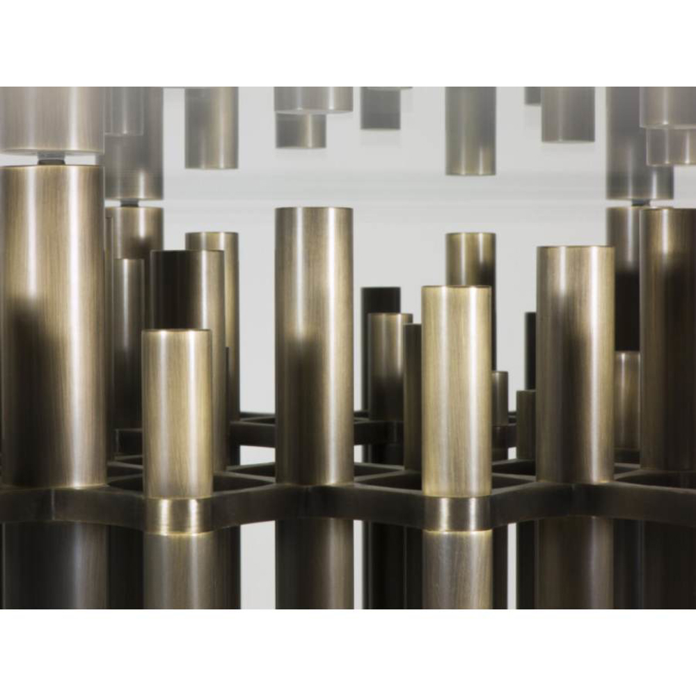Tables, round or oval, with an exclusive and precious base. The construction elements that form the base are formed by a pair of shaped plates to which the vertical elements of various sizes are fixed. The plates are obtained starting from a single circular element, shaped with CNC technology and then finished by hand.