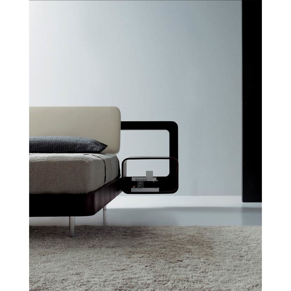A wooden base is the core of the bed. The headboard consists of a covered wooden band that accomodates two bedside tables at the ends. Available in two versions, with or without bedside tables. Headboard upholstered in leather. Support for mattress in milled plywood.