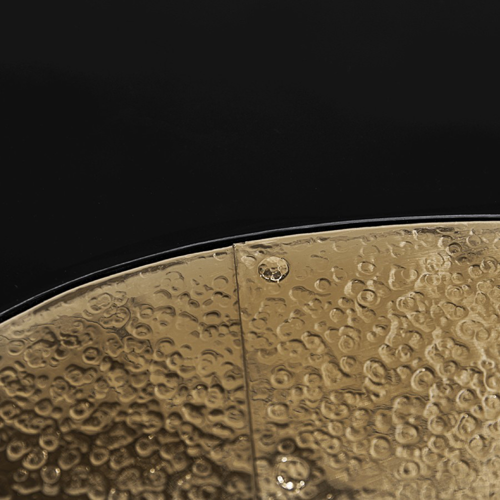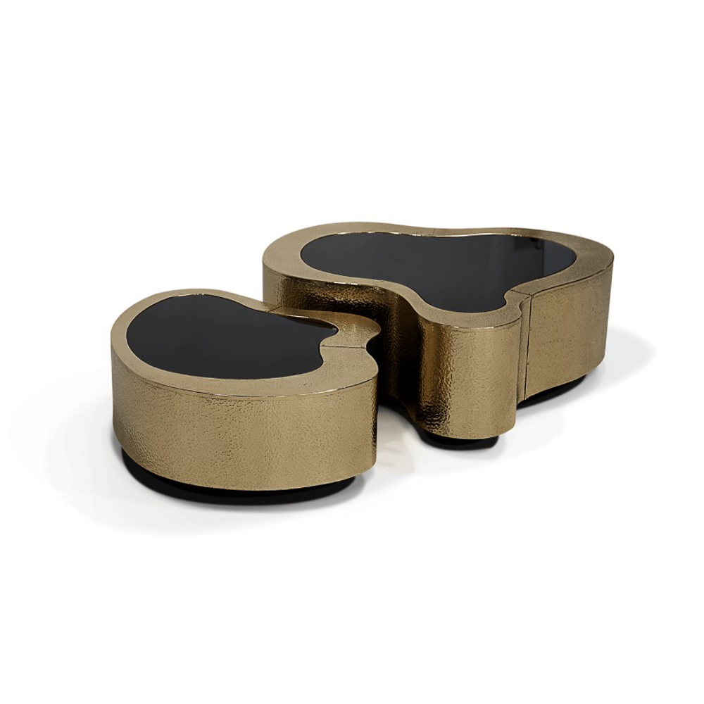 Table made in wood finished with manually hammered brass patina, with a curvilinear top made from black mirror. The base is lacquered in black finished with a high gloss varnish.