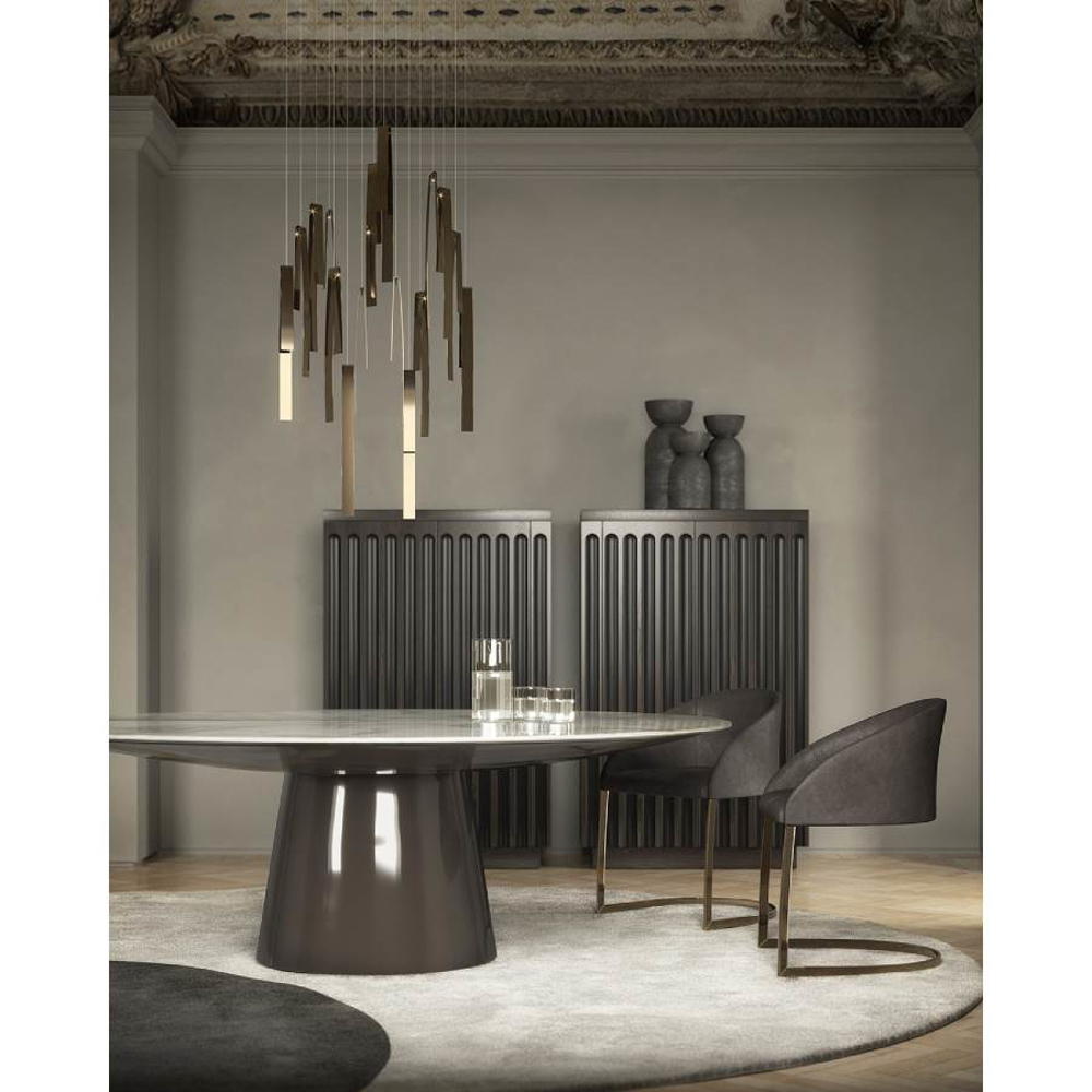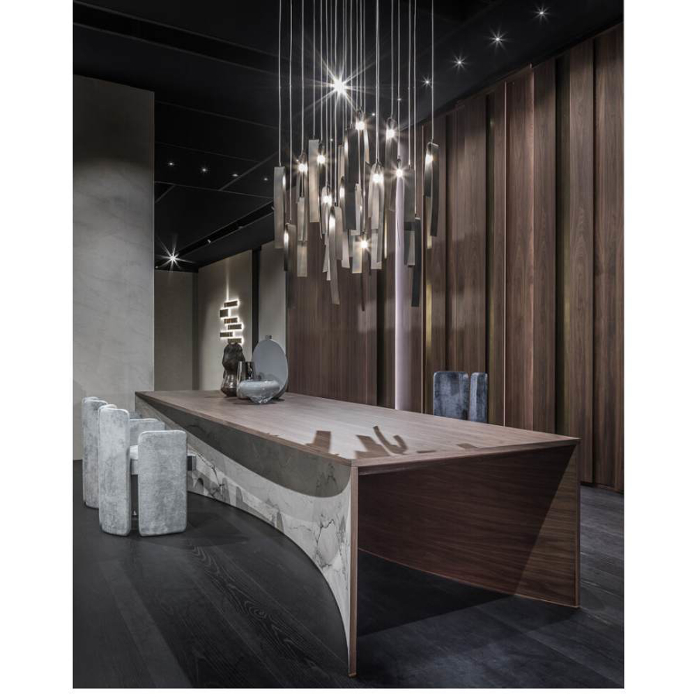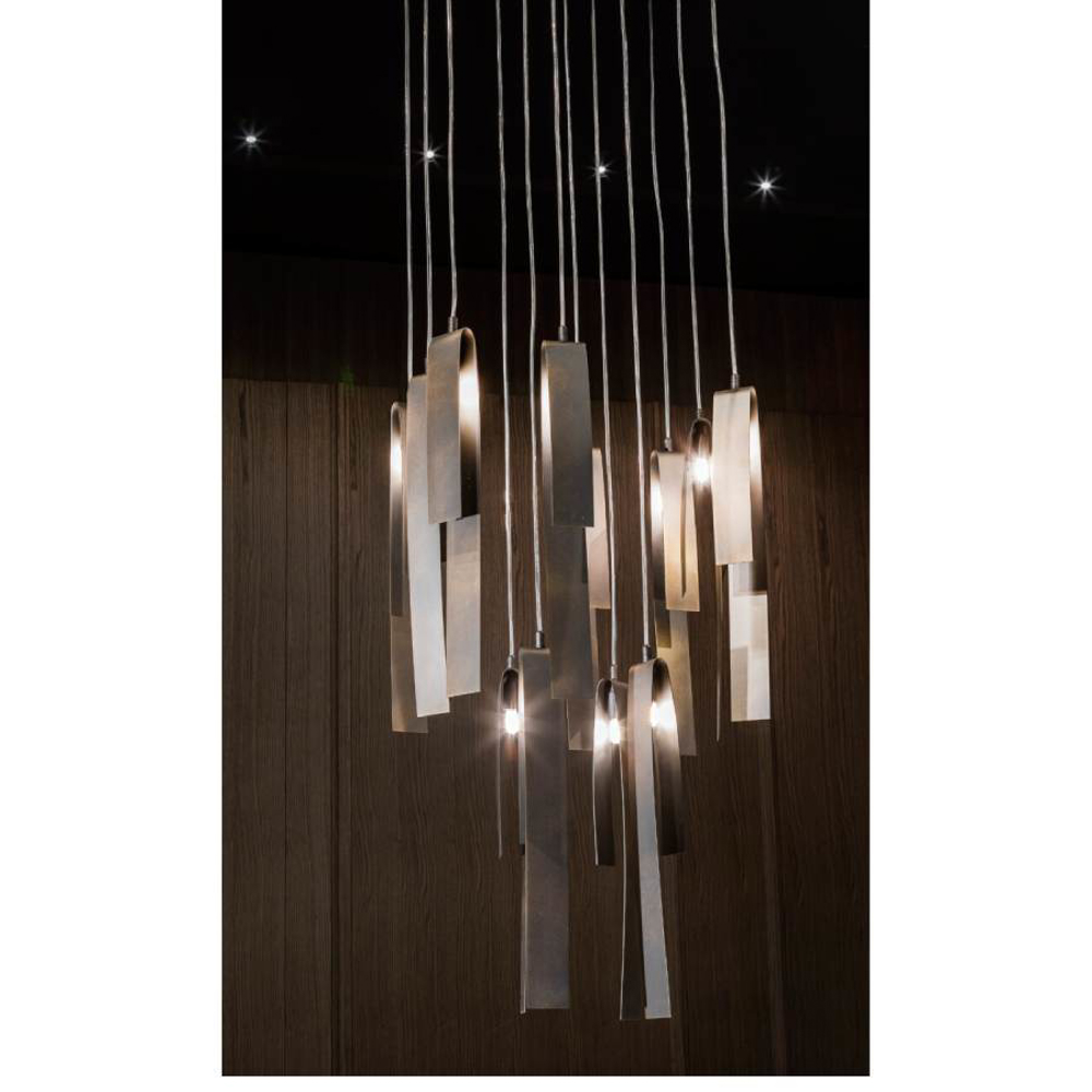 Light, lightness, sobriety. These are the characteristics of Wind Chimes, a family of lamps whose light source is protected by a precious curved sheet of metal. Games of lightness, curved lines that transform into soft surfaces that give life to a chandelier with different configurations.