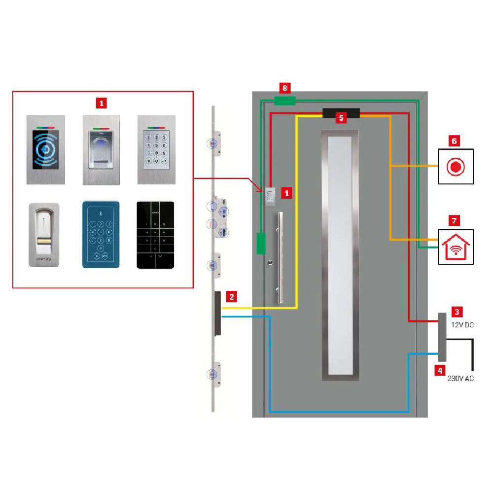 1. Bluetooth reader, fingerprint reader, numeric keypad. 2. Electric drive with Securyespagnolettey. 3. Cable gland. 4. Electrical installation. 5. Black box/ logical installation. 6. Porter button (optional). 7. Integration with SMART HOME control panel (optional). 8. Reed switch / Bolt sensor