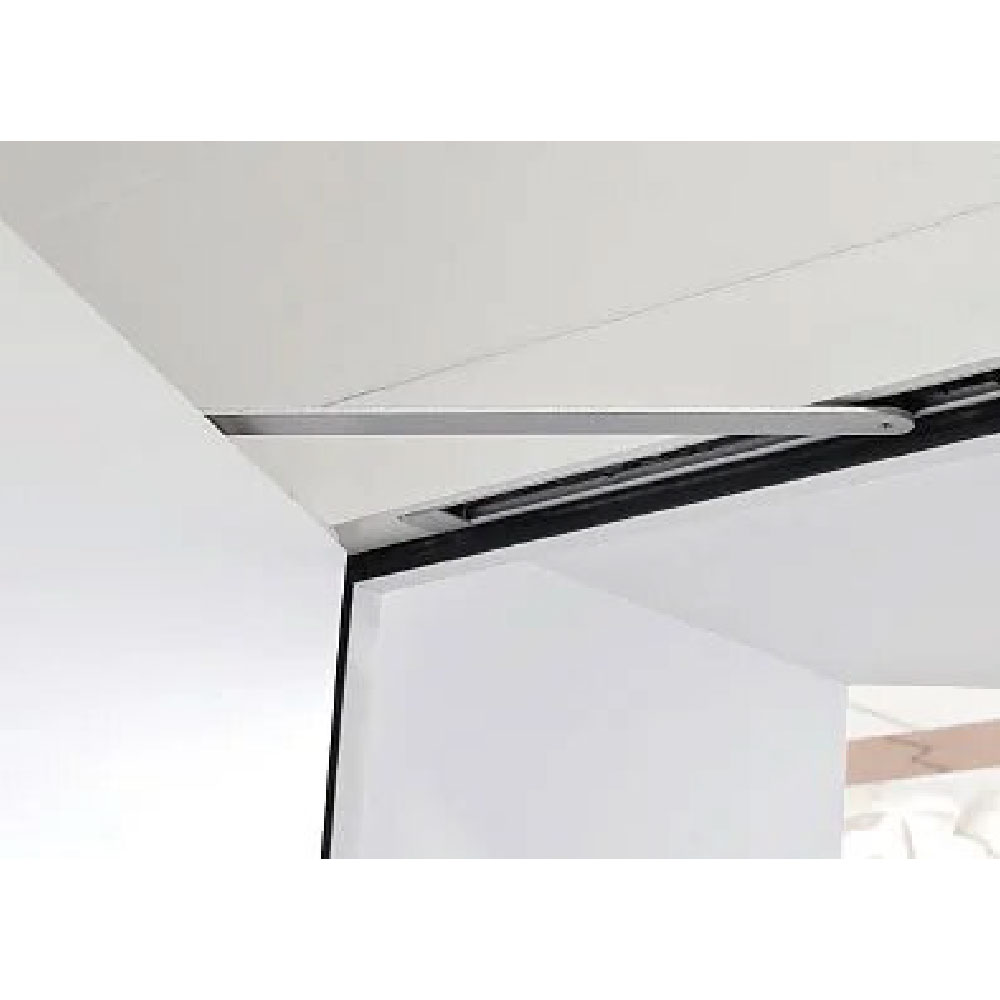Hidden door closer The hidden door closer provides both functionality and remarkable aesthetic. It is completely concealed in the leaf plate – only the sliding rail is visible when the door is open. The hidden door closer with infinitely variable adjustment of the hold-open device position from 80 to 120 degrees is fitted as standard. |