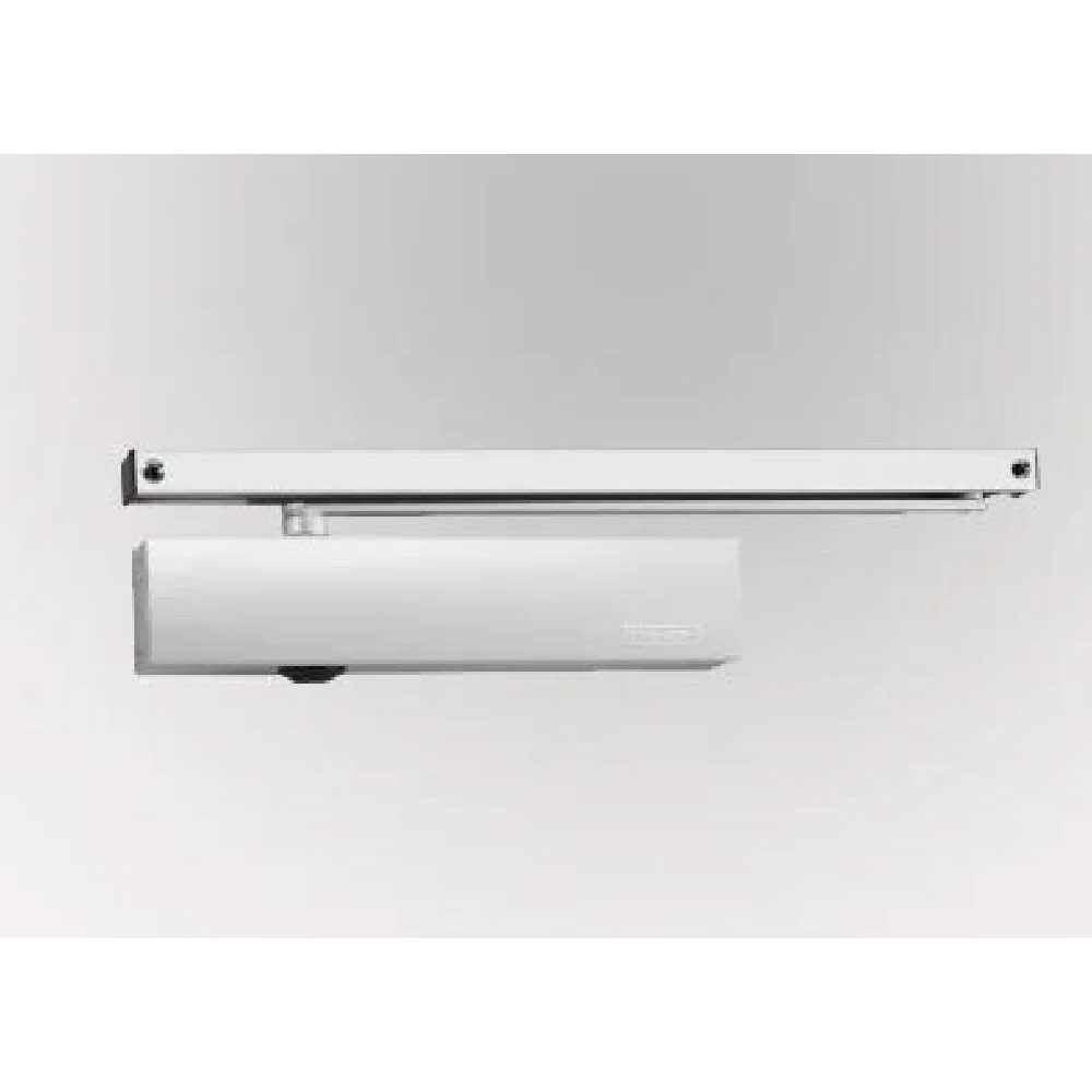 Overhead door closer with guide rail The door closer with a visually-pleasing flat bar is mounted on the door leaf and door jamb. Available in 3 colors (white / silver / bronze). The door will always close properly, and the extensive adjustment ensures adaptation to the conditions. |